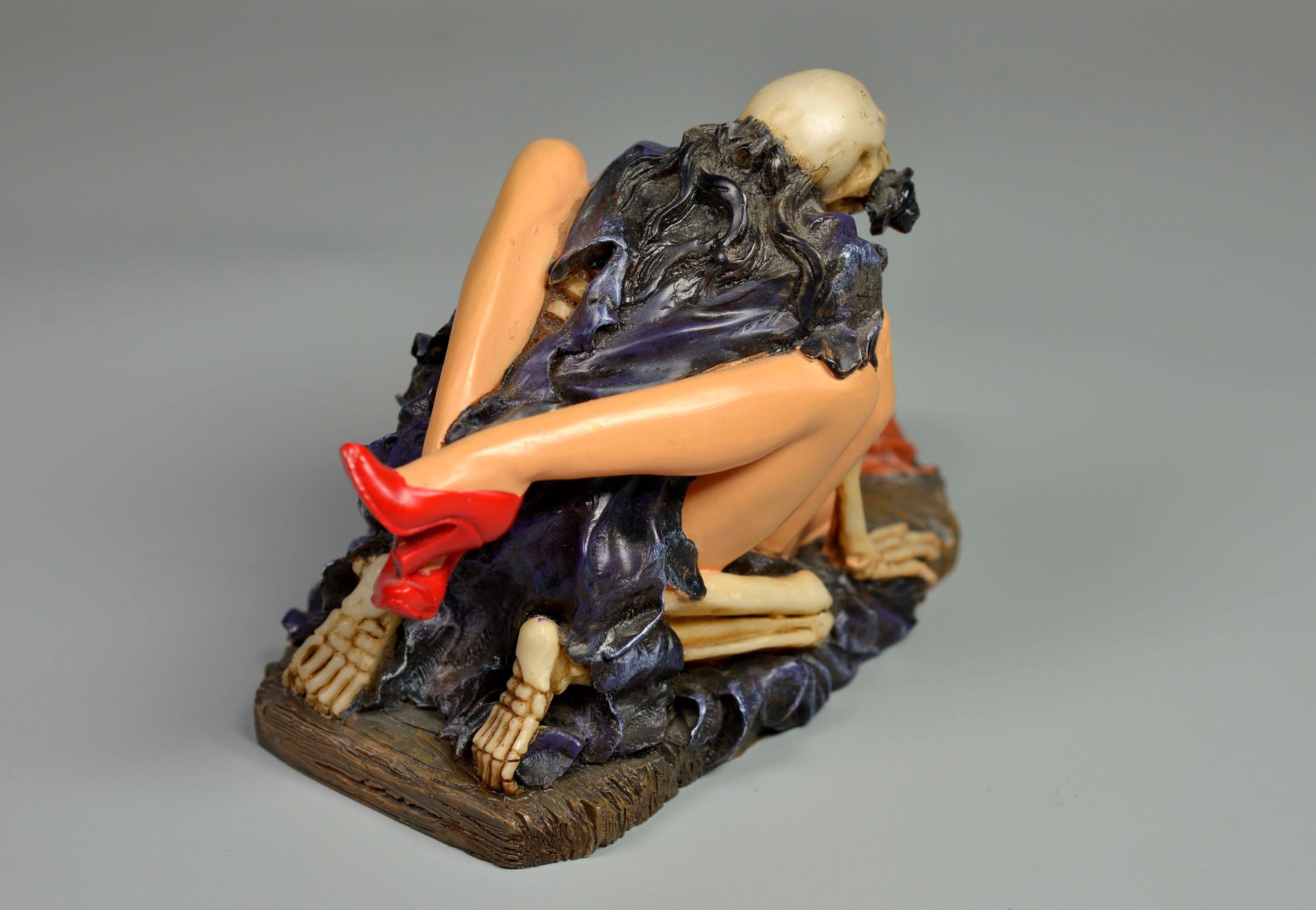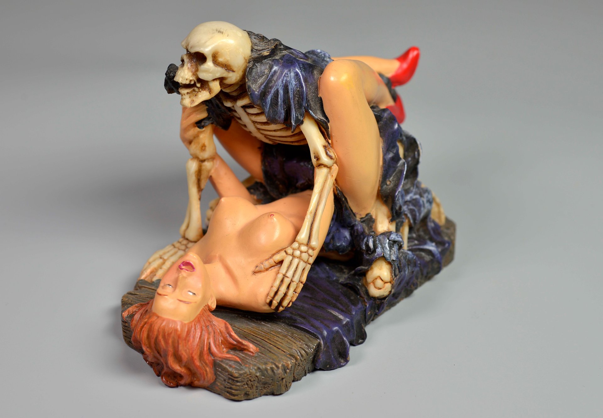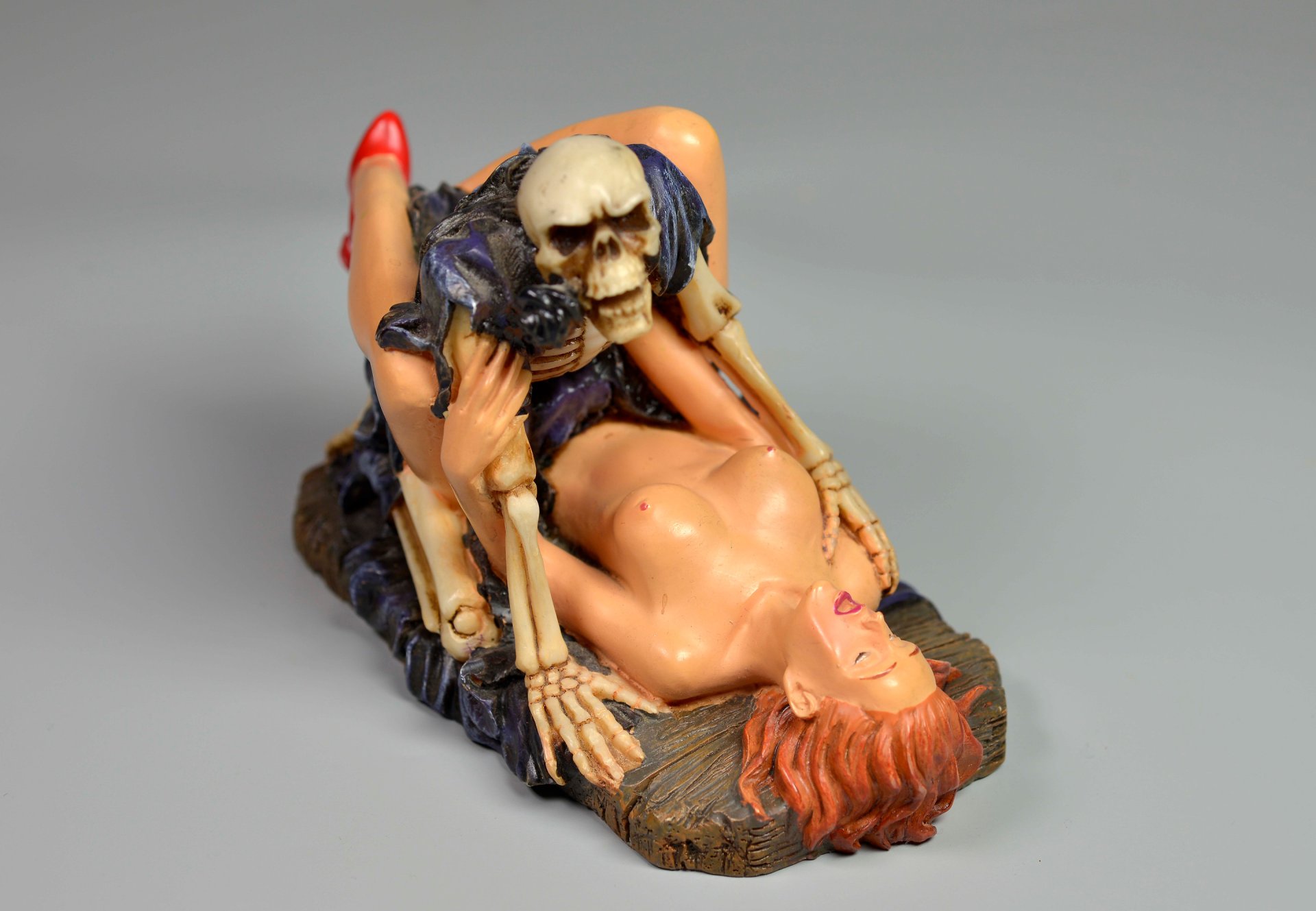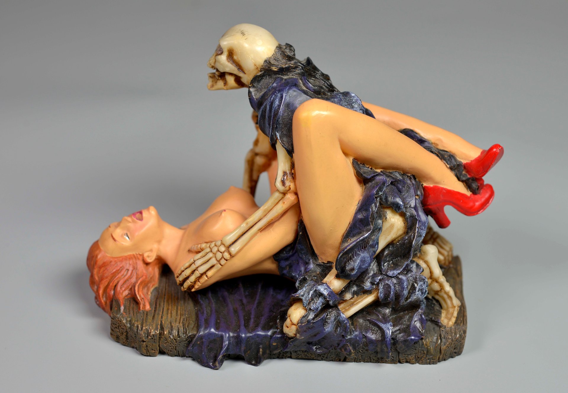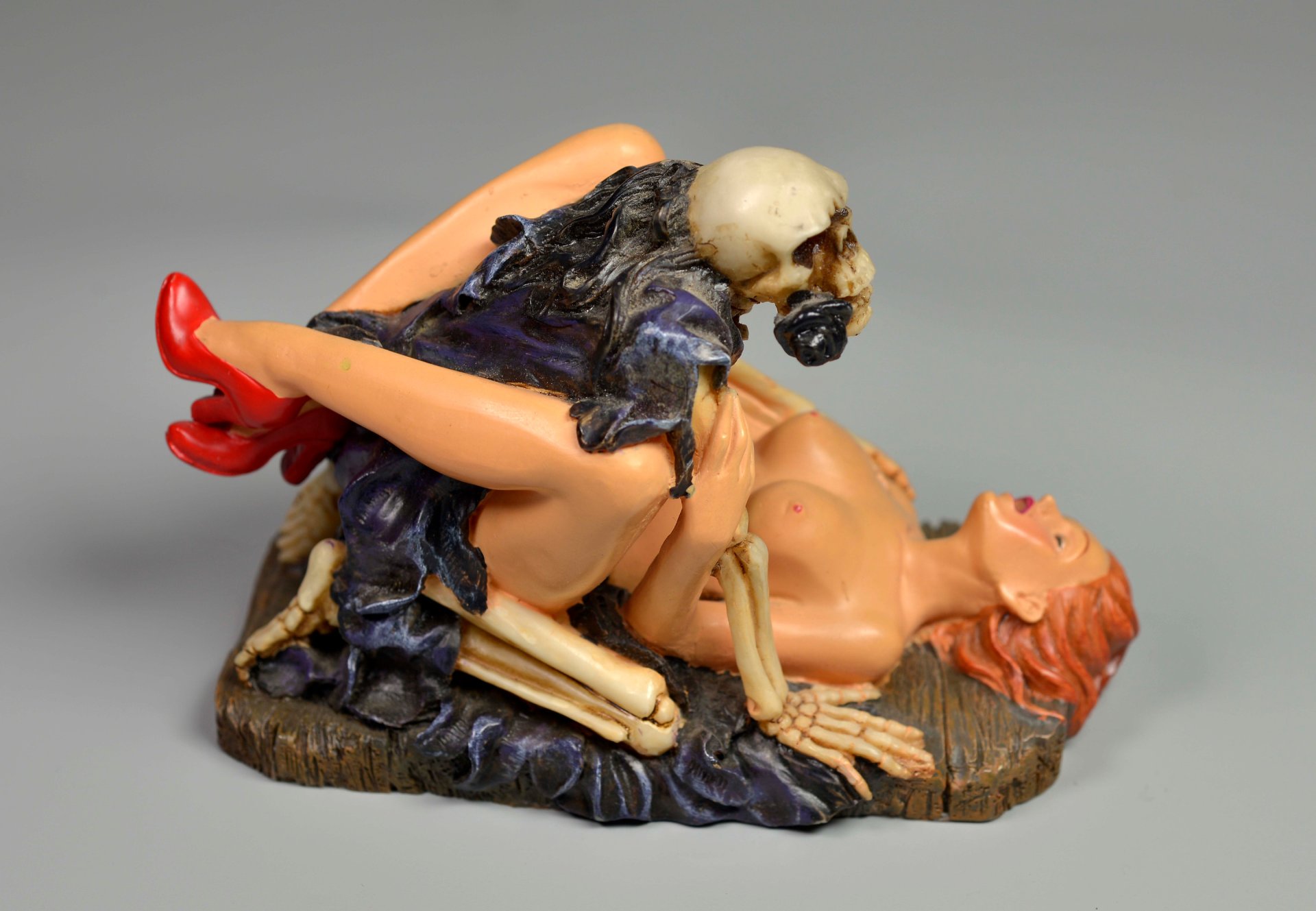 Aus übermaltem dichten Kunstharz in Einzelfertigung hergestellte Figur, die einen Geschlechtsverkehr in Missionarsstellung zwischen einer lebensfrischen, nackten, nur mit roten Schuhen bekleideten und unten liegender Frau mit einem Tödlein in schwarzem Umhang abbildet.. H x B x T = 9,3 x 12,5 x 7,4 cm