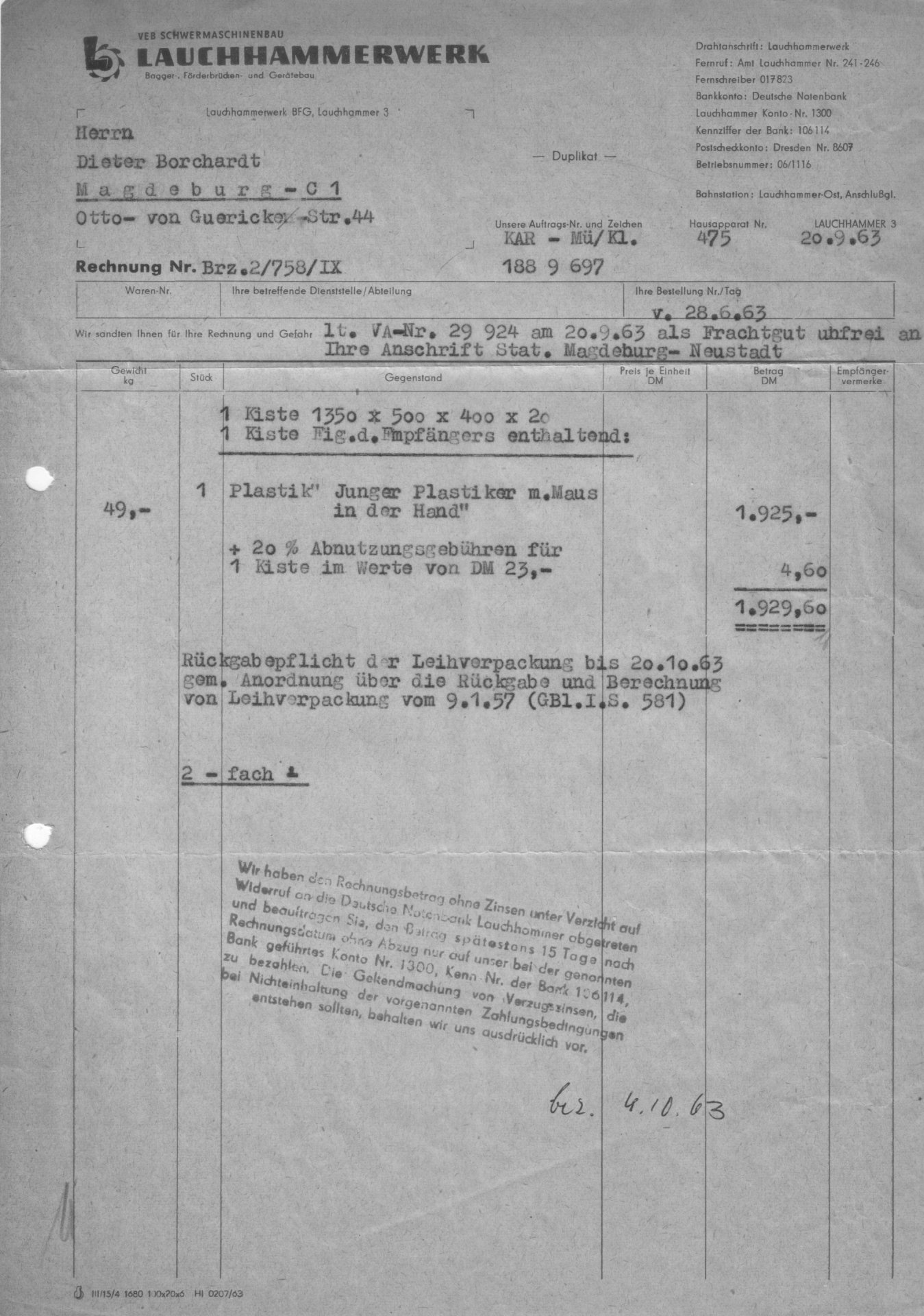 •    1964, 28.02. – 2. Bronzeguss im Lauchhammerwerk mit Rechnung, bezeichnet: „Plastik Junger Plastiker m. Maus in der Hand“ für die Pionierorganisation „Ernst Thälmann“ (heute ZDF Hauptstadtstudio)
