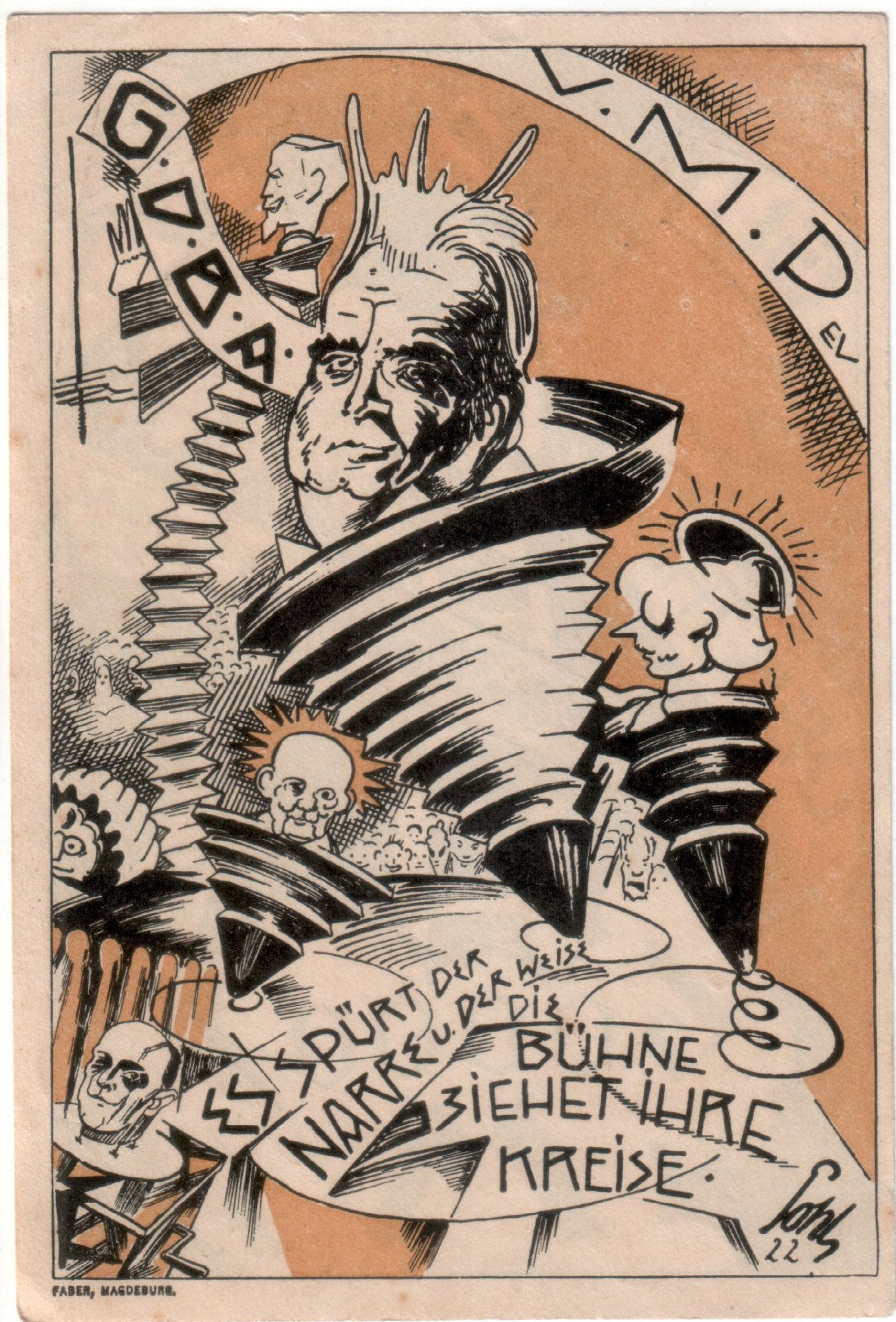 Veranstaltungs-Billett 1, Rückseite, Druck, expressionistische Zeichnung; zusätzlich G.D.B.A. (Genossenschaft Deutsche Bühnen – Angehörige), signiert unten rechts „Pohl 22 “, Druck Faber Magdeburg, 12,7 x 8,7cm
