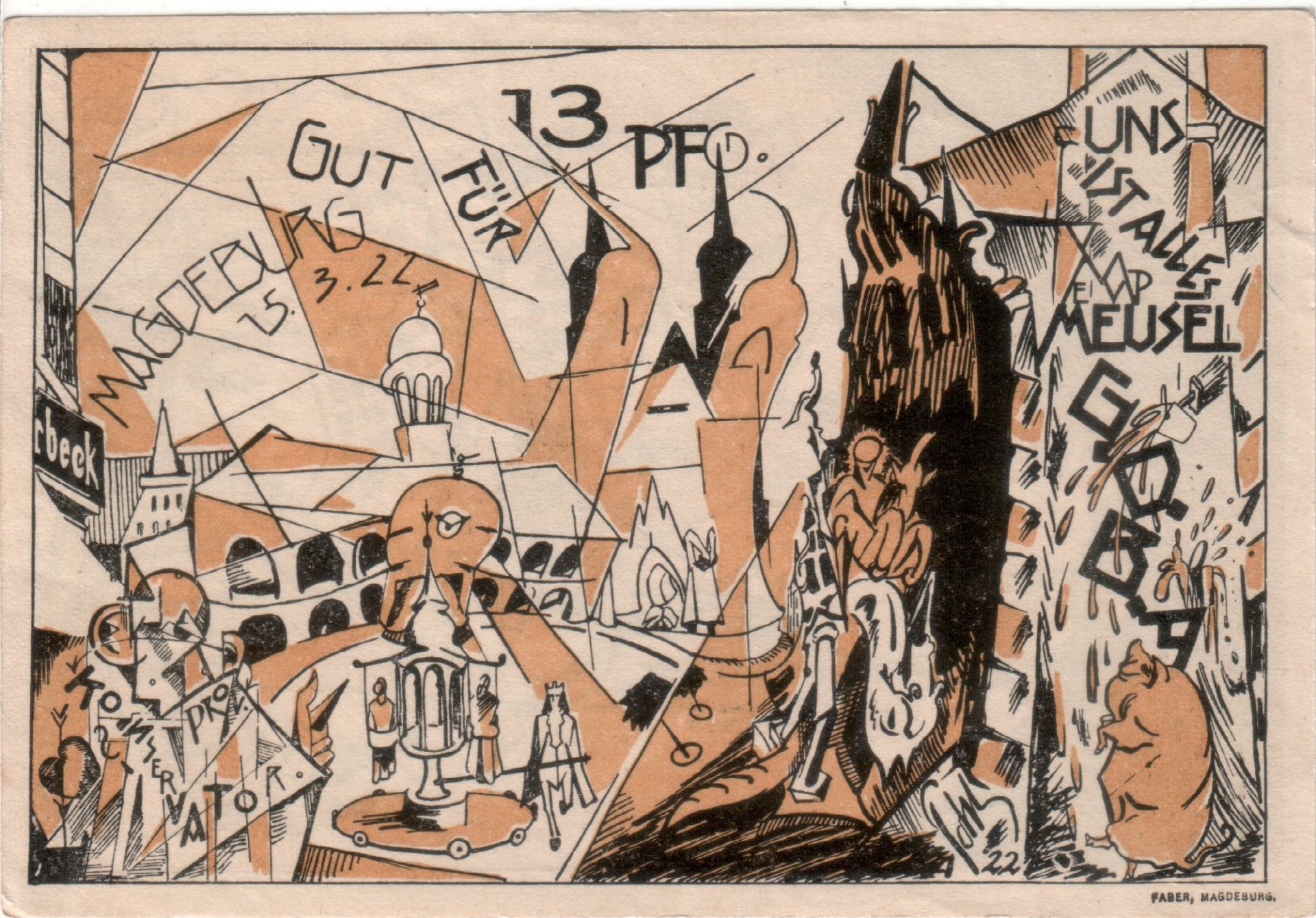 Gut für 13 Pf, Uns ist alles Meusel, GDBA, Magdeburg 15.3.22; Faber Magdeburg, signiert unten rechts „Pohl 22 “, 8,7 x 12,7cm