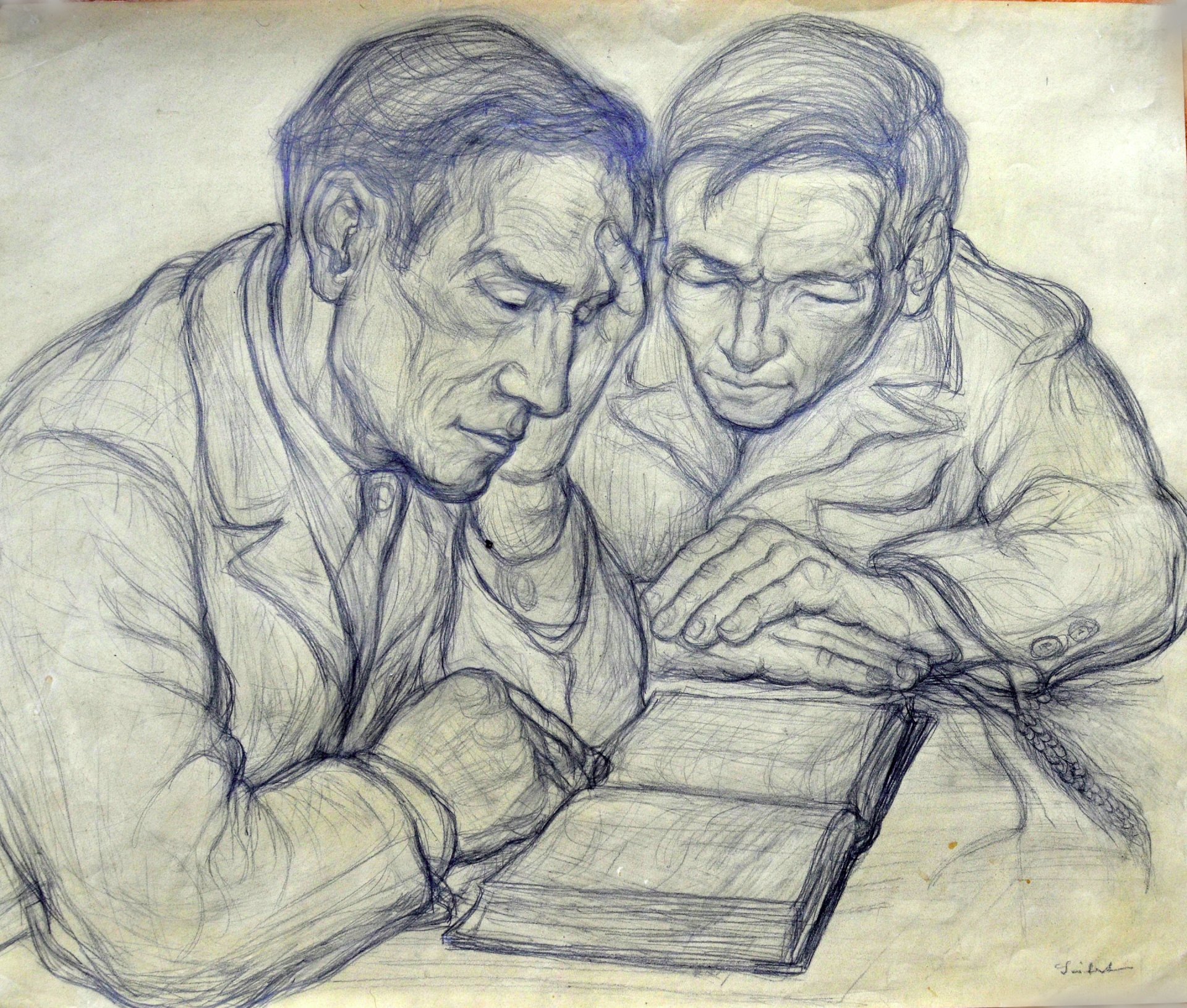 Ernst Seifert (1922-1976), Bleistiftzeichnung, „Genossenschaftsbauern beim Studium“, D0368