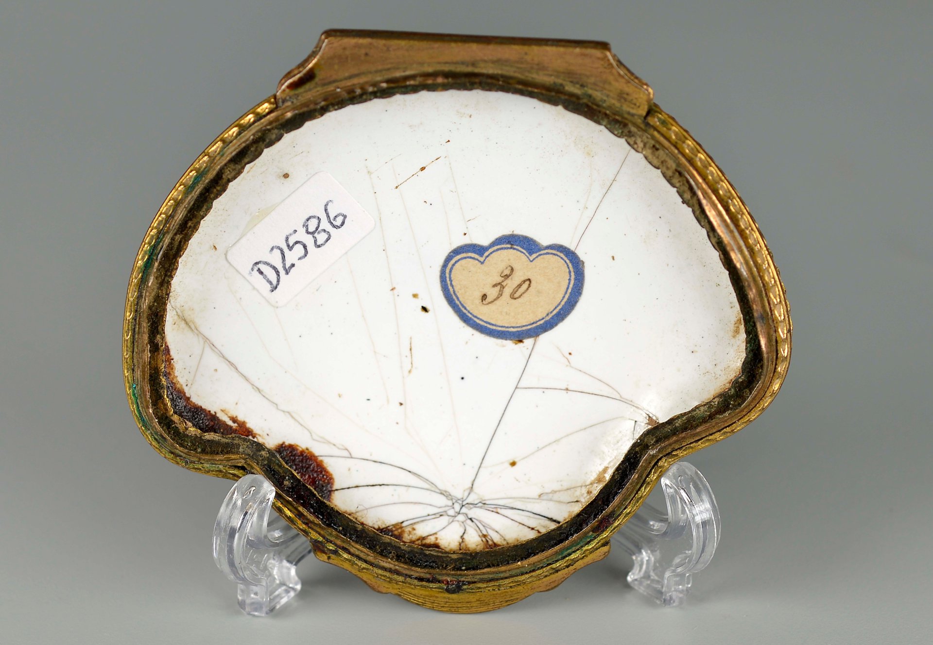 In vergoldeter Montur mit Scharnier.für Unter und Oberteil einer Emaille-Tabatiere ist der eingefasste gewölbte Deckel erhalten; darauf in hellen bunten Farben die gemalte Darstellung einer Wildschweinjagd; auf einem Pferd sitzend reitet ein Jäger mit Saufeder direkt auf ein Wildschwein zu; im Hintergrund stehen zwei Treiber, ebenfalls mit Lanzen bewaffnet; auf der Unterseite befindet sich ein älteres Papieretikett mit der handschriftlichen Zahl“30“ wohl die Inventarnummer einer alten Sammlung.  56,3 x 62,7 mm
