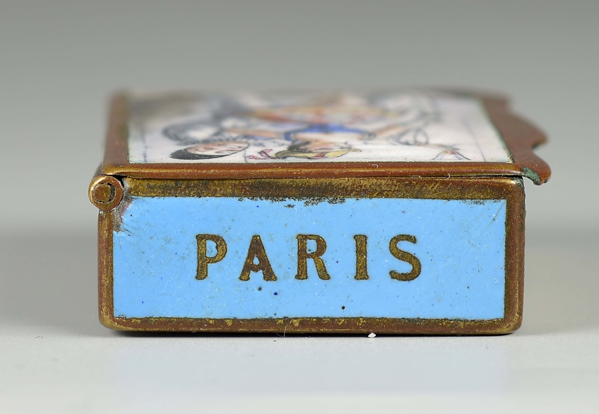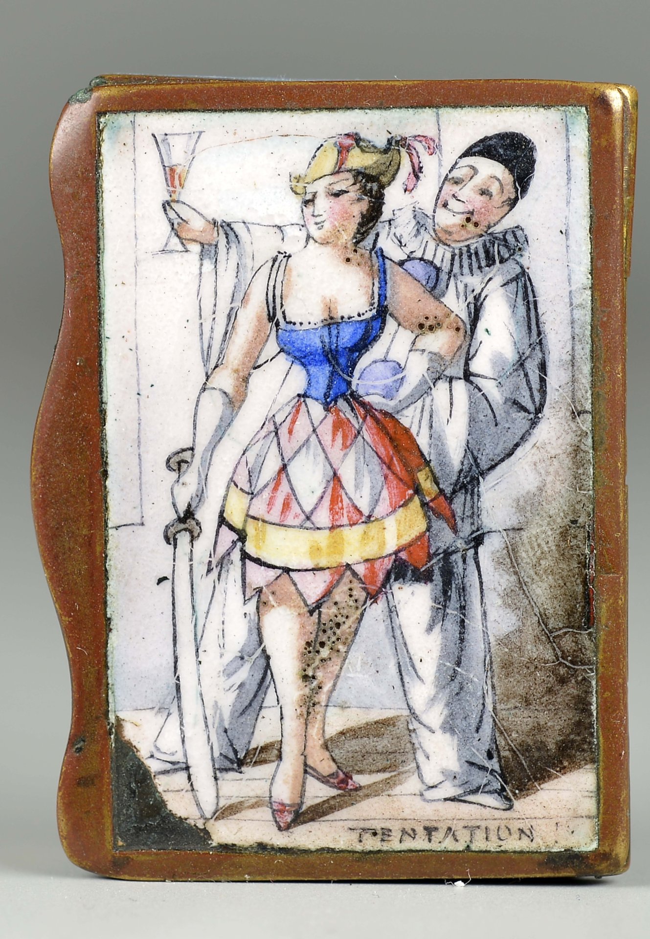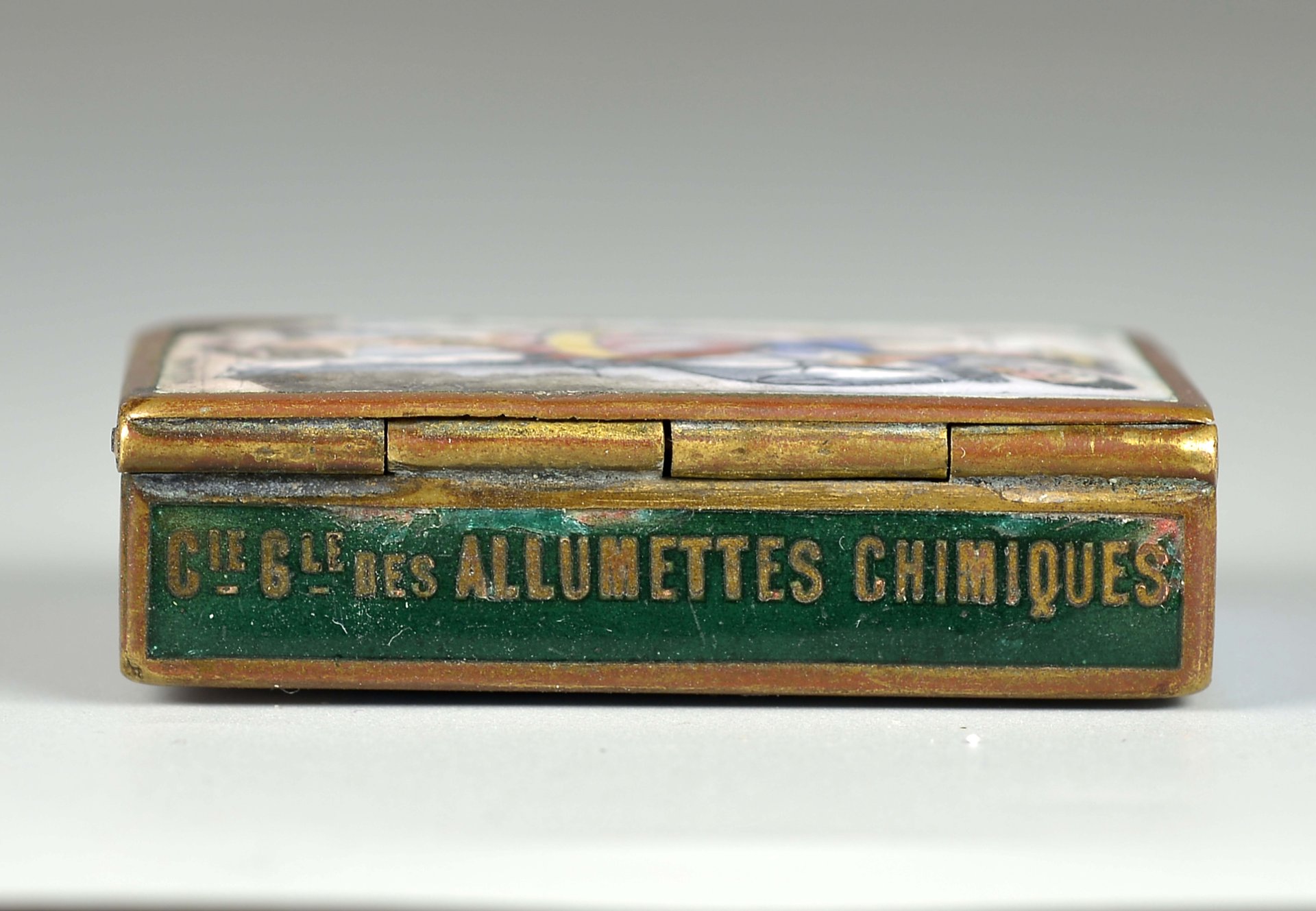 Sehr seltene Messingdose mit Scharnier, Deckel außen mit bunter Emaillemalerei, Pierrot und Colombine, Figuren der Commedia dell’Arte, unten rechts in der Darstellung betitelt: "Tentation" (Verlockung); Deckel innen: braune Emaille-Darstellung eines Segelschiffes; Dose Unterseite: Columbine, Zigarette rauchend, unten rechts in der Darstellung betitelt: "Demandez" (Fragen). Seitenteile mit Name der Streichholzfabrik, Stadt und Straße auf grüner, hellblauer und roter Emaille = "Cie Gle Allumettes Chimiques" und "Paris" sowie "66 Chaussée D`Antin", das vordere Seitenteil mit Reibefläche auf gelber Emaille, ca.: 35,3 gr., Grösse: 14 x 35 x 48 mm,