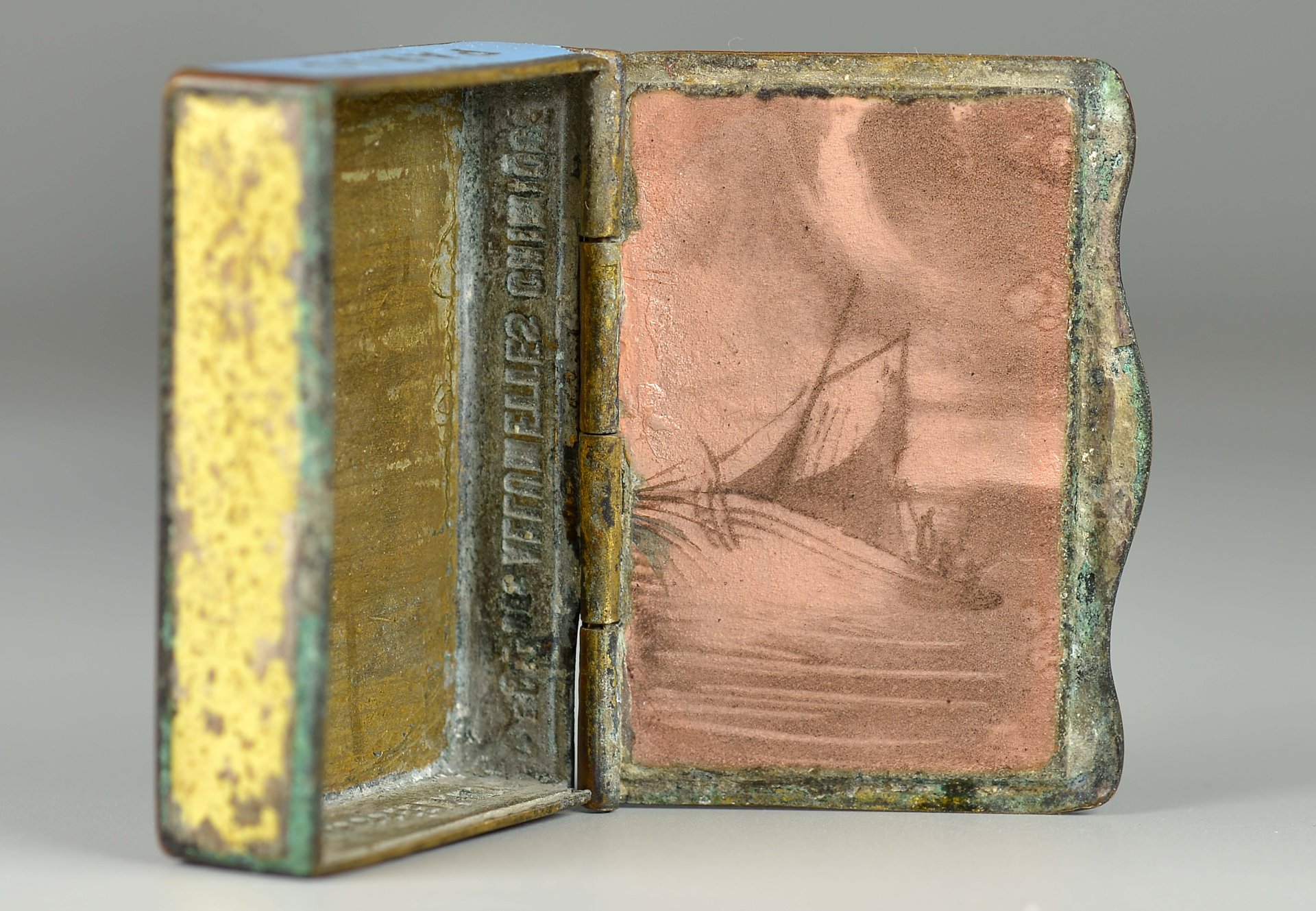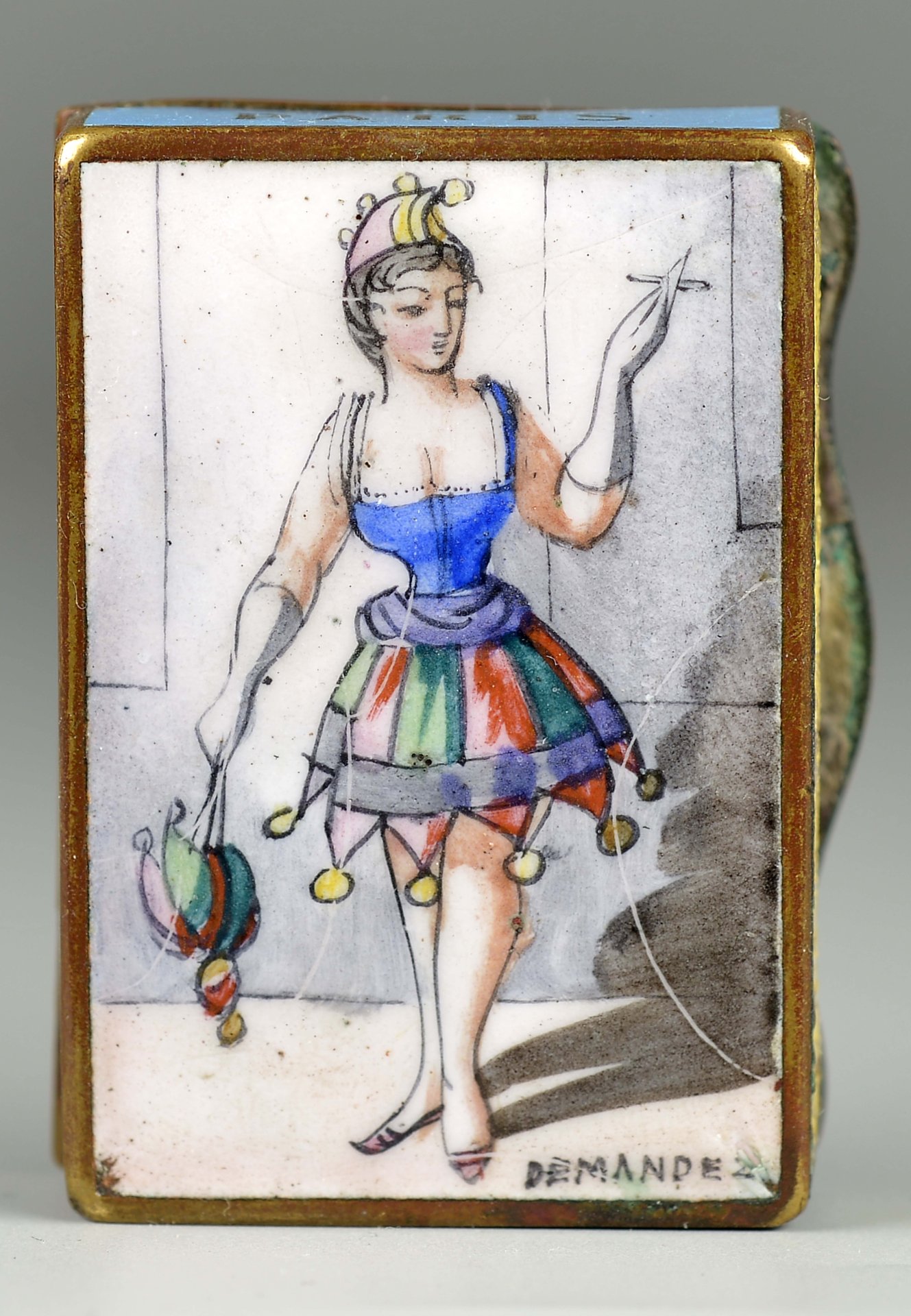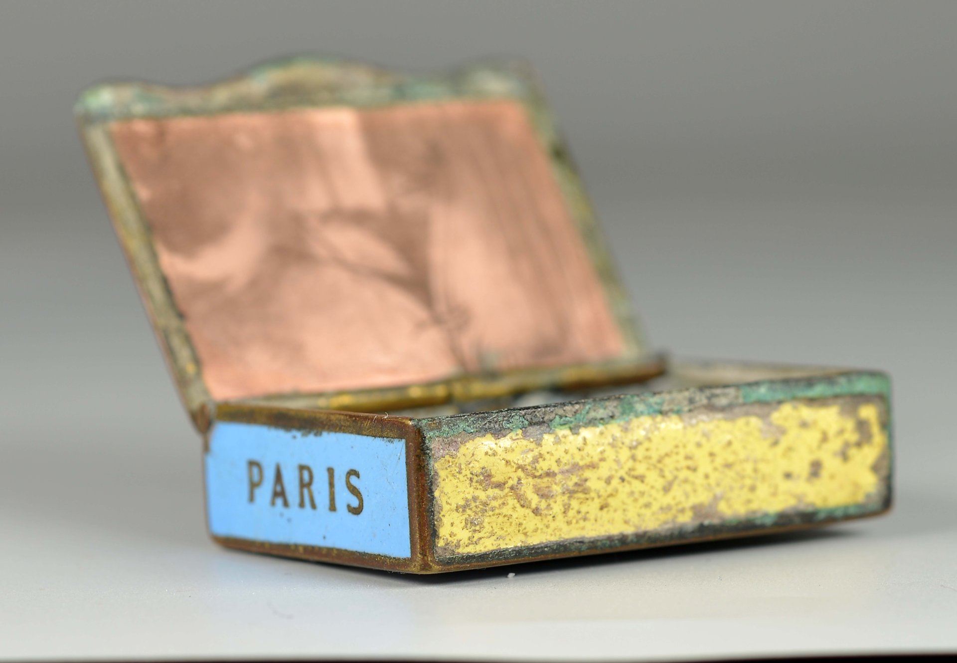 Sehr seltene Messingdose mit Scharnier, Deckel außen mit bunter Emaillemalerei, Pierrot und Colombine, Figuren der Commedia dell’Arte, unten rechts in der Darstellung betitelt: "Tentation" (Verlockung); Deckel innen: braune Emaille-Darstellung eines Segelschiffes; Dose Unterseite: Columbine, Zigarette rauchend, unten rechts in der Darstellung betitelt: "Demandez" (Fragen). Seitenteile mit Name der Streichholzfabrik, Stadt und Straße auf grüner, hellblauer und roter Emaille = "Cie Gle Allumettes Chimiques" und "Paris" sowie "66 Chaussée D`Antin", das vordere Seitenteil mit Reibefläche auf gelber Emaille, ca.: 35,3 gr., Grösse: 14 x 35 x 48 mm,