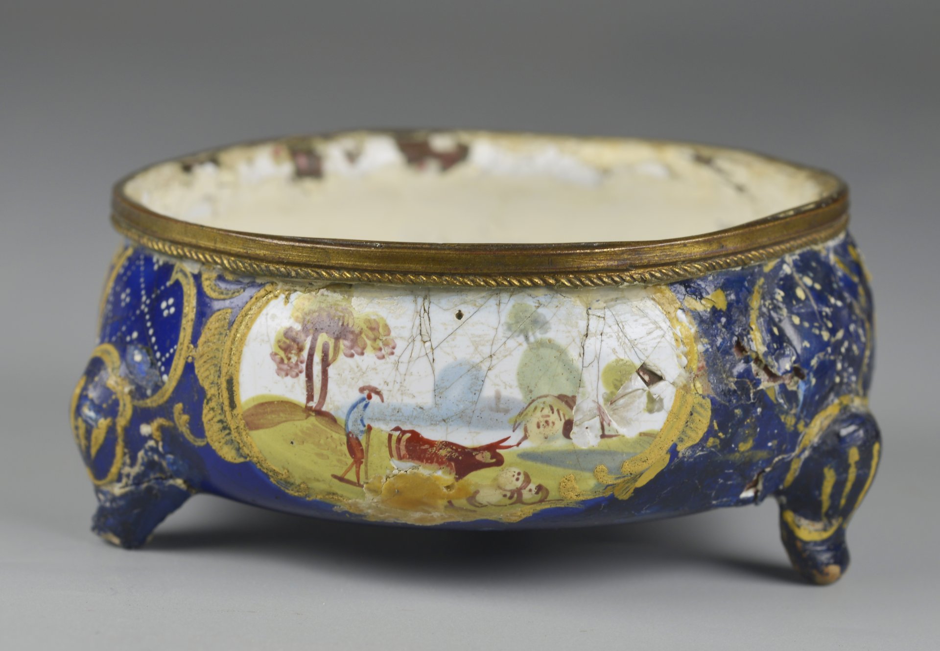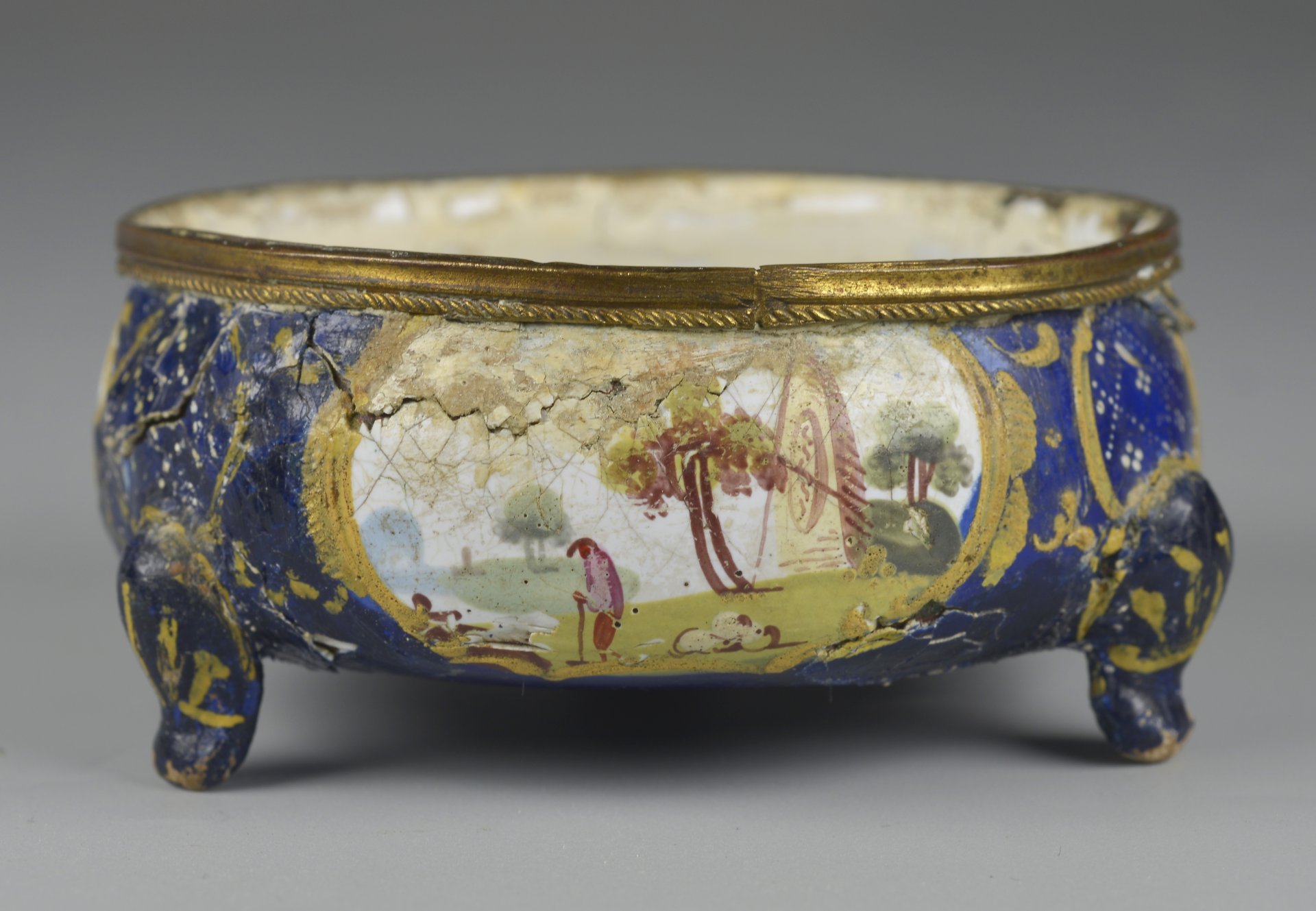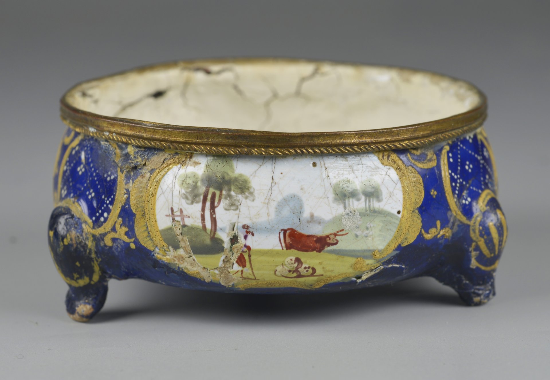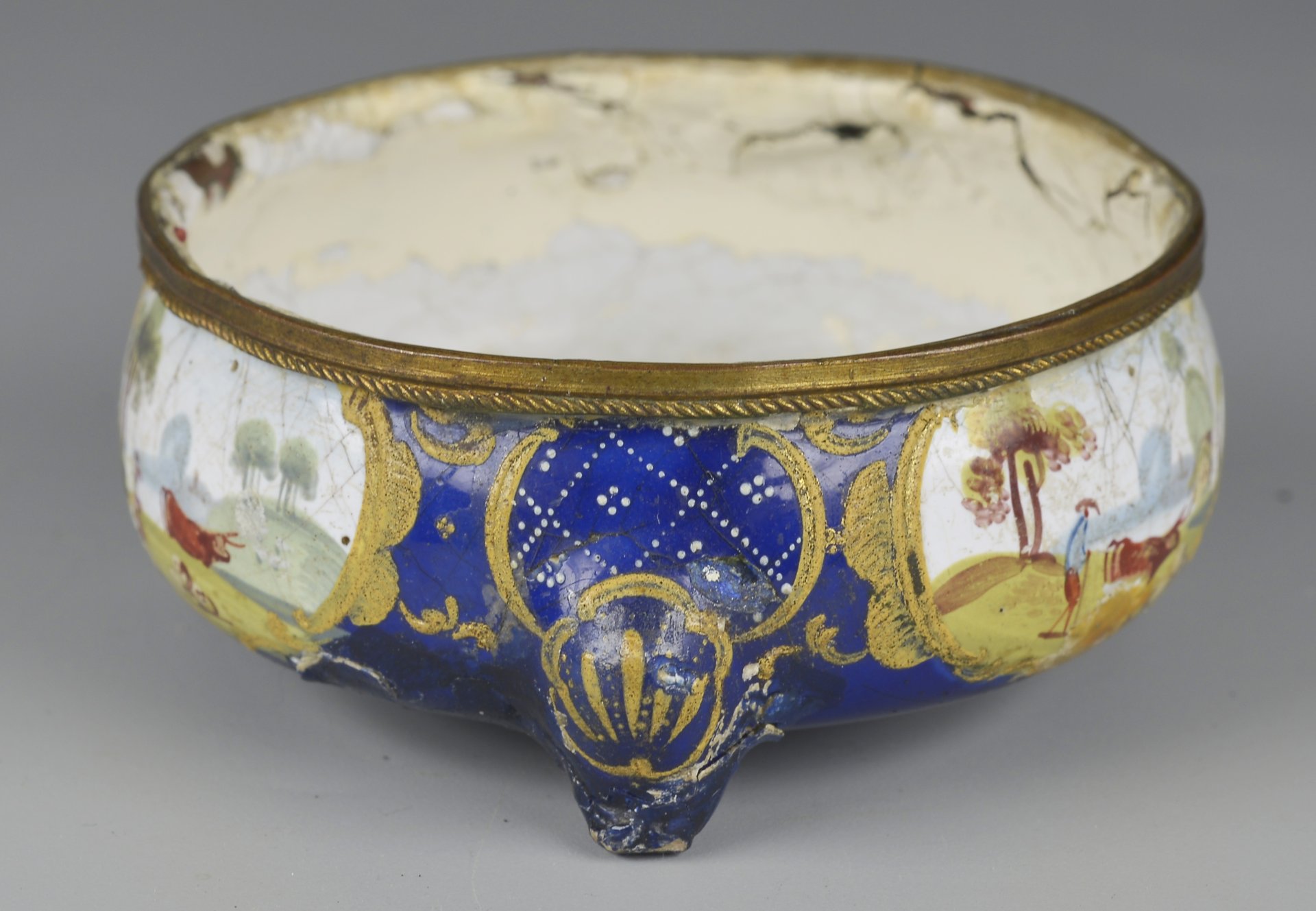 Runder bauchiger Korpus auf 3 Füßen; dazwischen auf der Außenseite der Schale je eine längsovale Kartusche mit feiner Lupenmalerei und Darstellung von bäuerlichen Landschaften, oberhalb der Füße auf blauem Untergrund weiße punktierte Dekore; Der Rand von einem schmalen Messingring, unten mit gedrehter Schnur gestaltet. Innen weiß emailliert; unten im Zentrum auf blauem Fond gelbe vierblättrige Marke. H=2,9; D=6,5cm