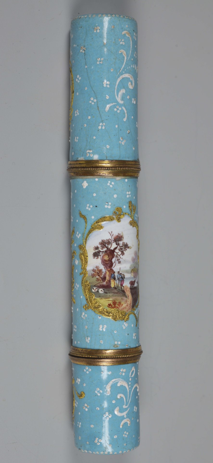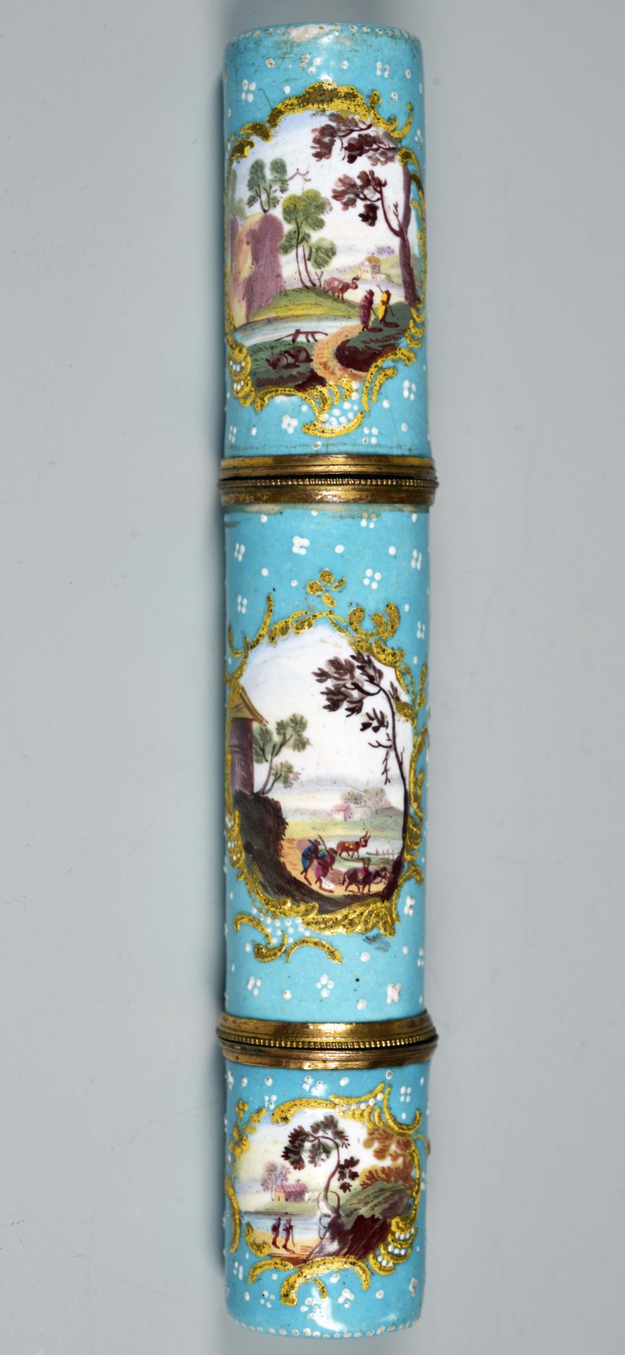 Nadeldose mit zwei Steckdeckeln, hellblauer Emaillefond, darauf plastische weiße Rocaillen und Punkte; auf dem oberen Deckel eine Kartusche mit plastischen in gold-gelb gefassten Rocaillen, auf dem Mittelteil zwei Kartuschen mit plastischen in gold-gelb gefassten Rocaillen und auf dem unteren Teil eine Kartusche mit plastischen in gold-gelb gefassten Rocaillen; in den Kartuschen mit bunten Emaillefarben Flusslandschaften mit Personenstaffage. Die Trennung der drei Teile mit Messingringen und jeweils einer Perlenschnur. H = 14,7cm; D = 2,3cm