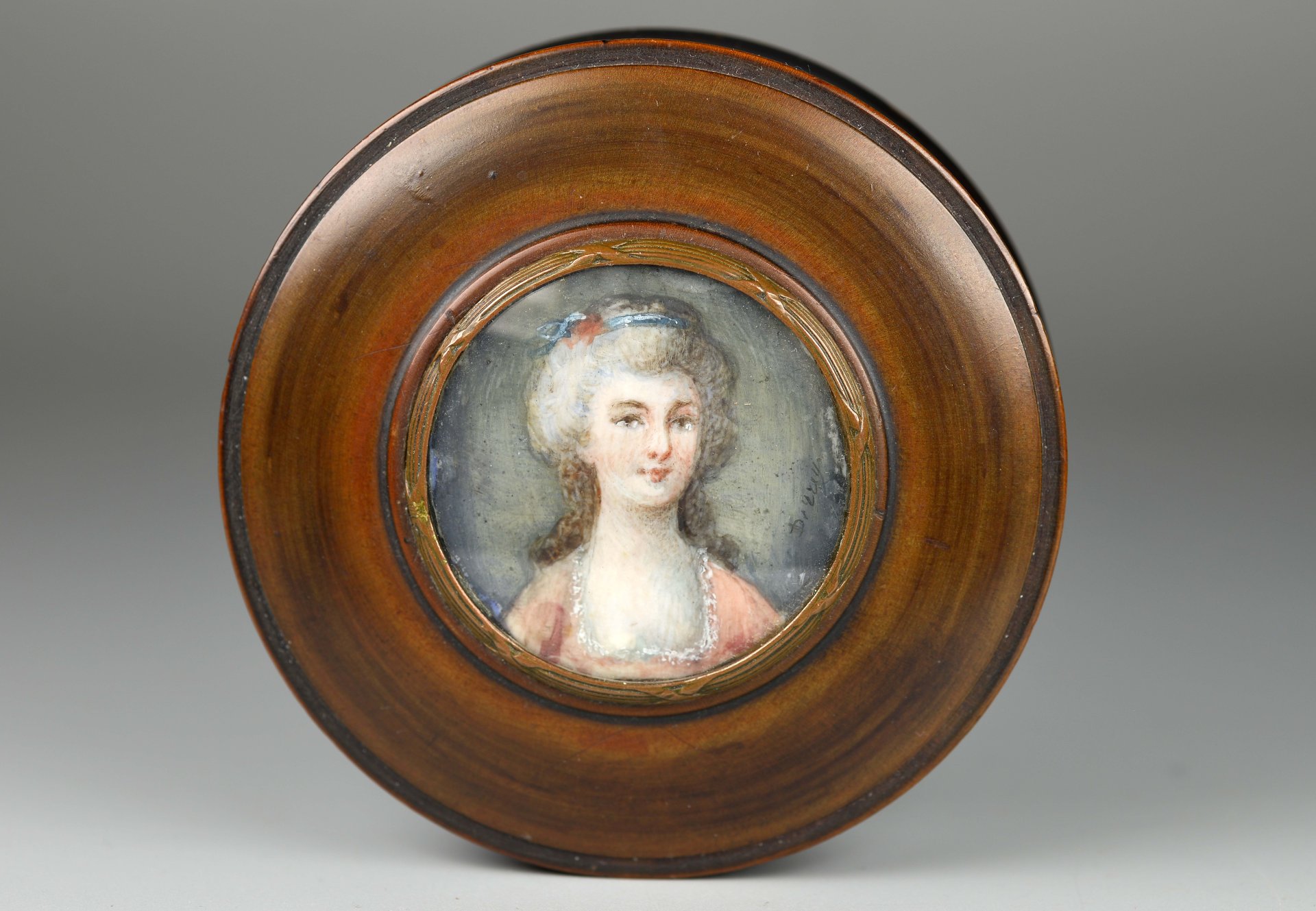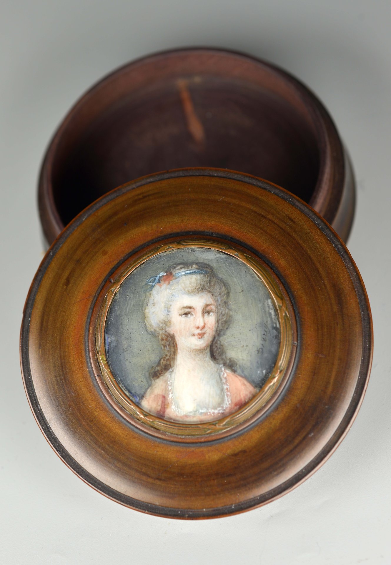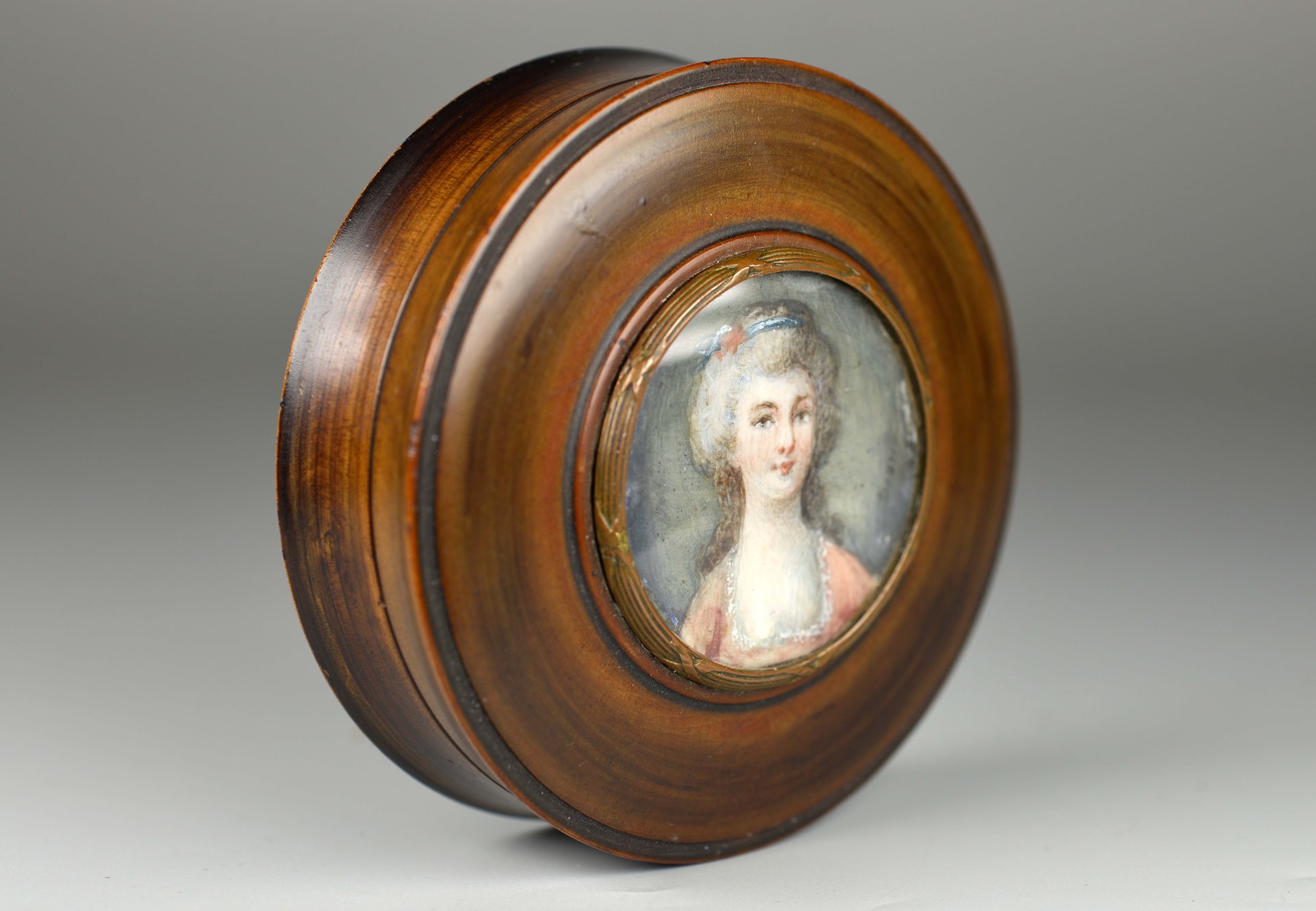 Runde Dose aus gedrechselten feinporigem Holz, bestehend aus Unterteil und Deckel; im Deckel Gouache mit Darstellung eines jungen Mädchens im Halbportrait, wohl auf Elfenbein, mit Messingkranz und gewölbtem Glas. D= 9cm; H=3,2cm