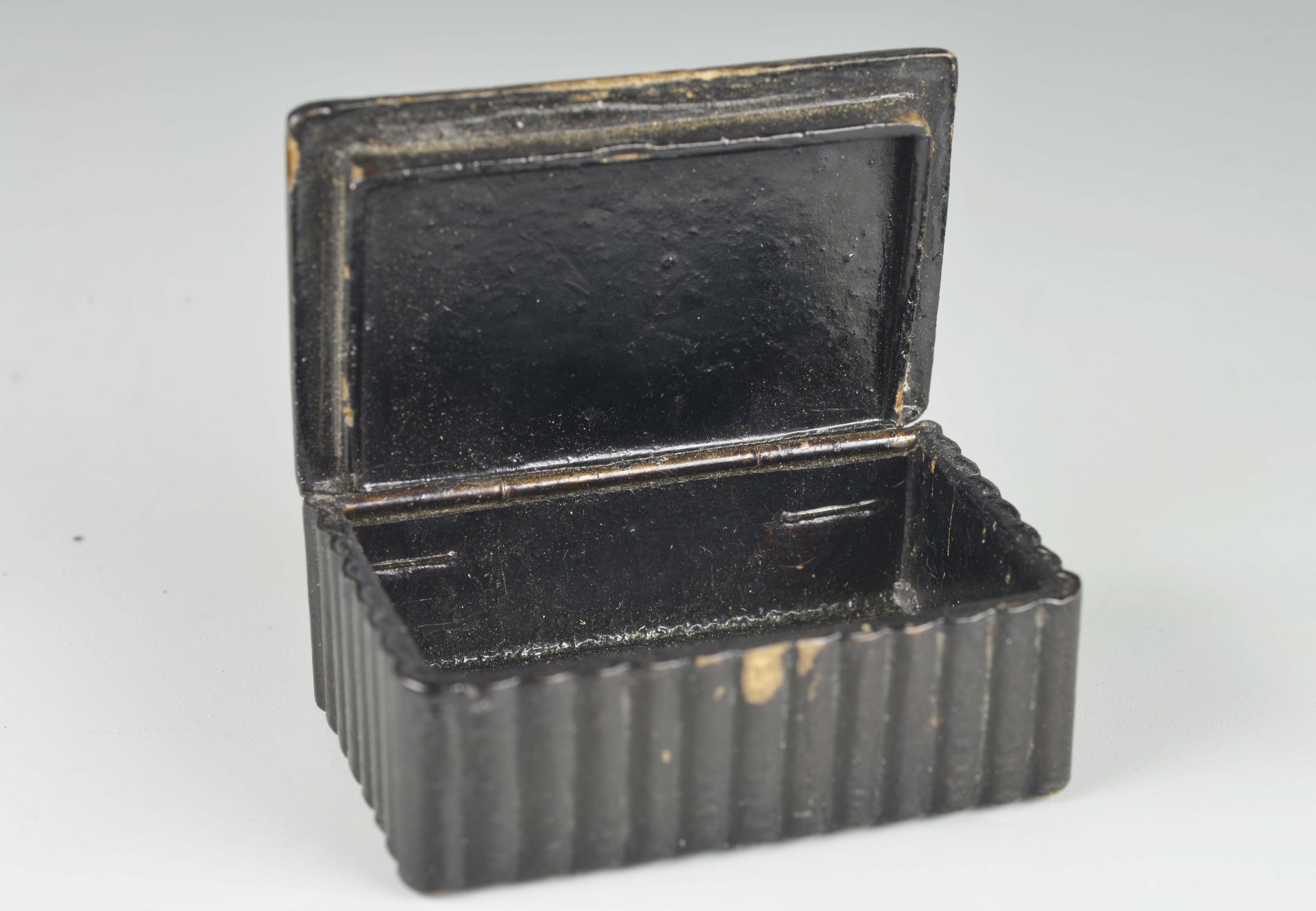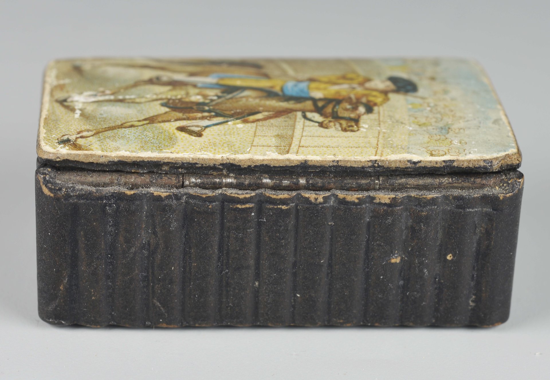 Kleine Dose mit Scharnierdeckel aus Pappmache, der Deckel mit bunten Ölfarben bemalt und einen Torero auf einem Pferd mit gezückter Lanze darstellend. H = 20,3; B = 50, T = 33,6mm