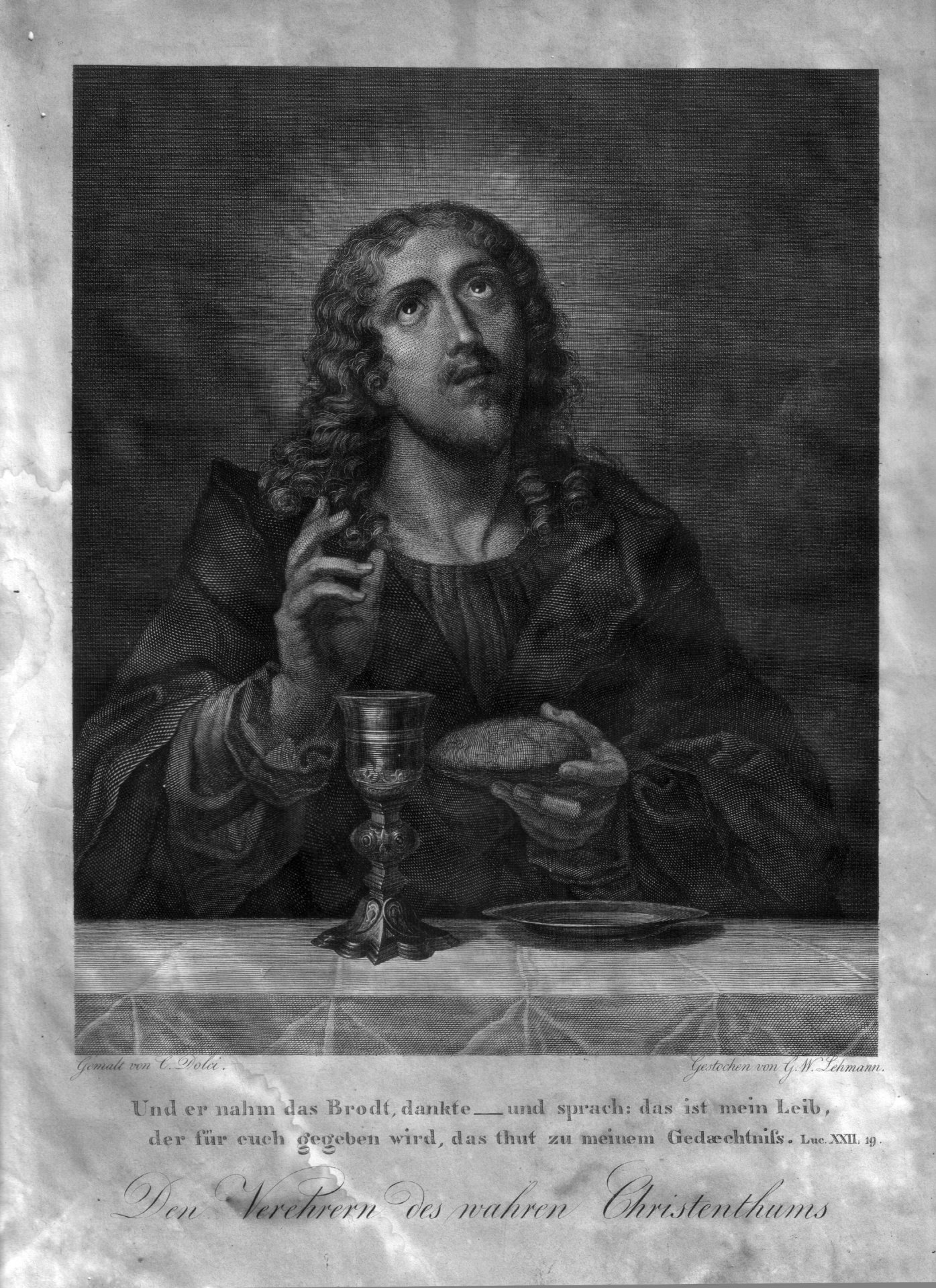 Lithophanie, Modell KPM 91; im Preis-Courant bezeichnet: „Christus mit dem Abendmahlskelch, Brustbild“; Vorlage ist das Gemälde „Christus, Brot und Wein segnend“ von Carlo Dolci (1616-1686), Gemäldegalerie Alte Meister Dresden,  22,2 x 18cm