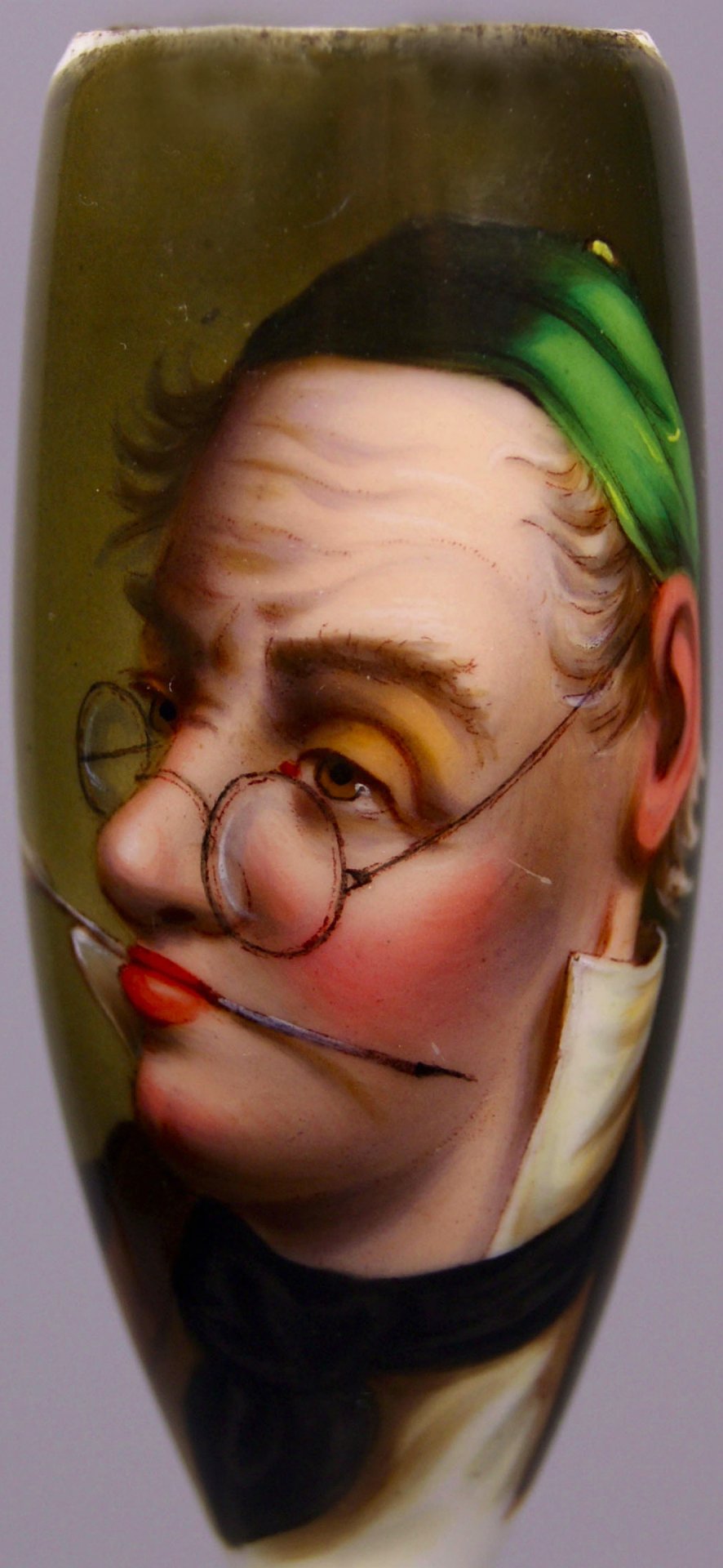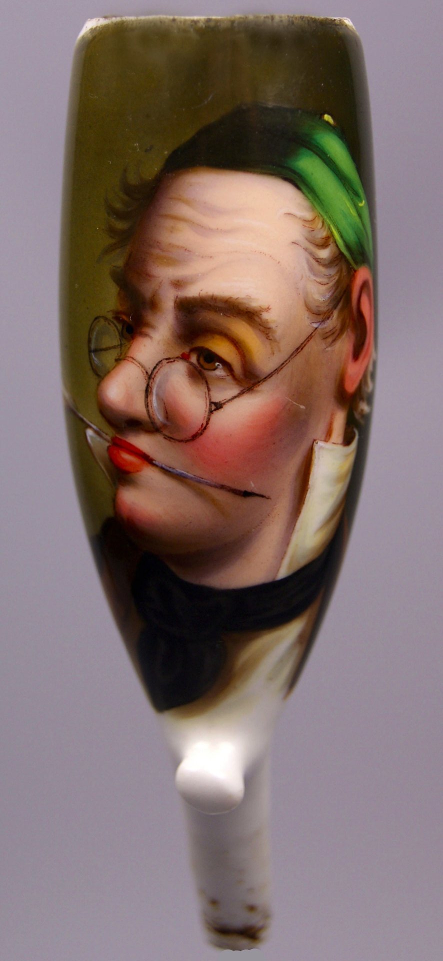 Pfeifenstummel aus Porzellan, Berliner Form; auf der Wandung drei Viertel den gesamten Korpus umspannendes Bildfeld, in bunten Muffelfarben die ausdrucksstarke Darstellung eines „Gerichtsschreibers“ mit Brille und Federkiel im Mund. Vorlage ist eine Zeichnung von Julius Adam, veröffentlicht mit weiteren 3 Charakterköpfen unter dem Titel „Münchner Charakterköpfe“.in der Gartenlaube von 1875, Seite 61