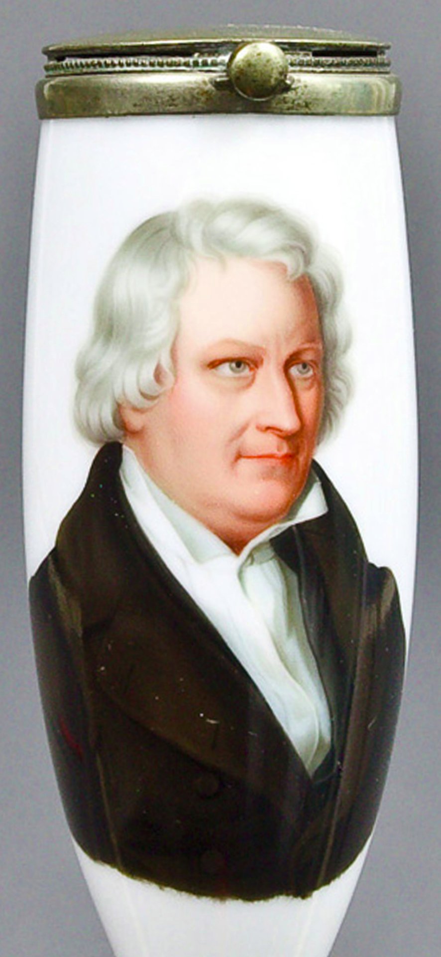 Pfeifenstummel aus Porzellan, „Berliner Form; auf der Wandung in bunten Muffelfarben ein Halbporträt des dänischen Bildhauers Bertel Thorvaldsen (1770-1844); rückwärtig in schwarzer Schreibschrift: „Thorvaldsen“. Vorlage ist ein Gemälde von Emilius Detlev Baerentzen (1799-1868) aus dem Jahre 1839 im Schleswig-Holsteinischen Landesmuseum, Schloss Gottorf. Auf dem Schaft unter Glasur in Blau die Initialen PFS (Porzellan-Fabrik Schney), darüber ebenfalls in Blau ein senkrechter Strich. Montierung: Neusilber. H=12,8 cm“