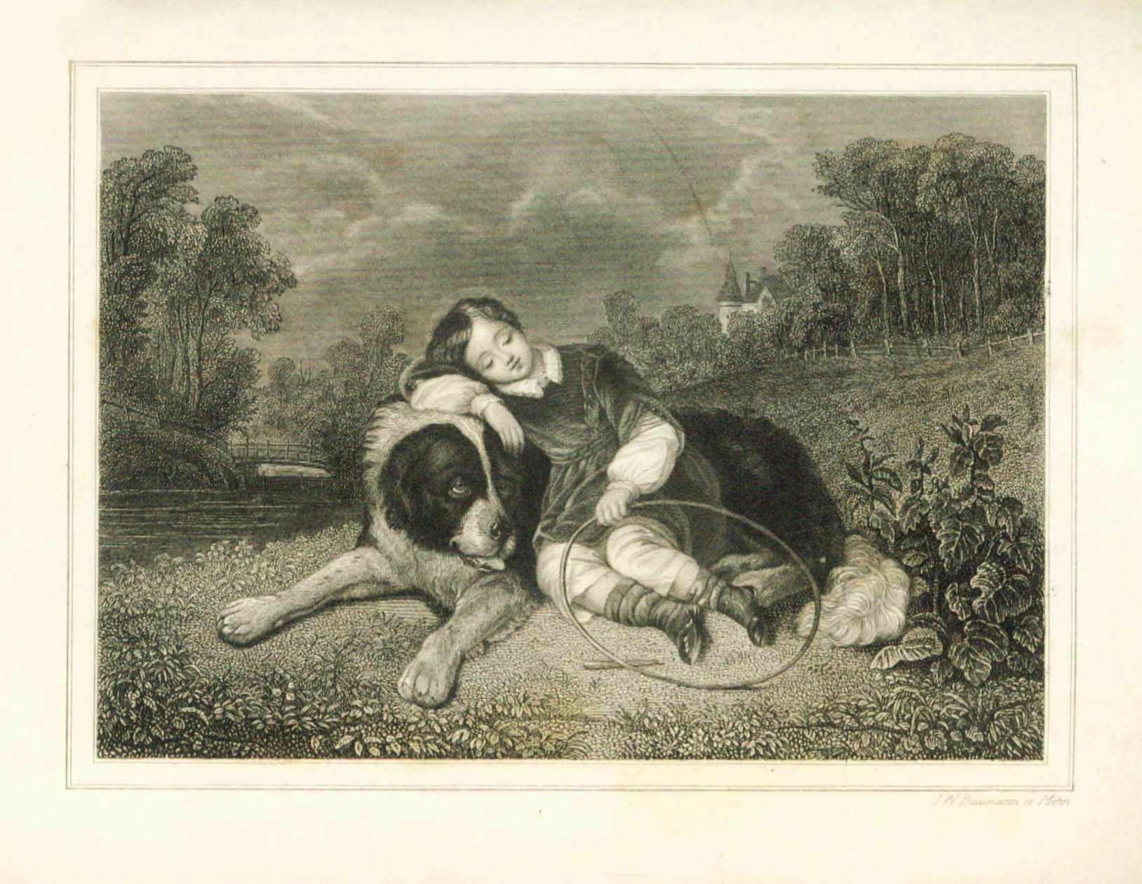 Lithographie von I.W.Baumann, ohne Titel, mit Darstellung eines Kindes mit Reifen, das seinen Kopf auf einem Bernhardiner gelegt hat und ruht; veröffentlicht im Taschenbuch für deutsche Frauen 1847 „Cornelia“.