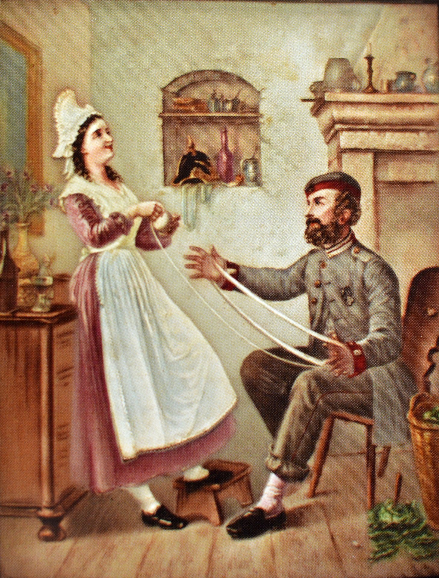 Kolorierte Lithophanie mit der Darstellung eines Landwehrmannes, der einem Hausmädchen beim Aufwickeln von Wolle hilft. Vorlage ist ein Gemälde, Öl/Holz, von Paul Eduard Maximilian Bürde (1819-1874), 17,5 x 14,6 cm