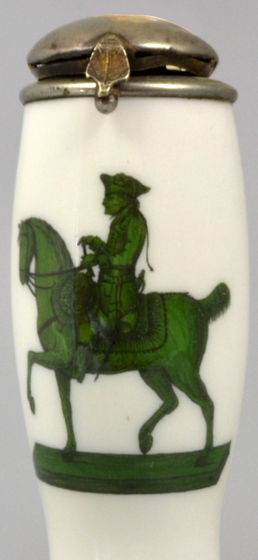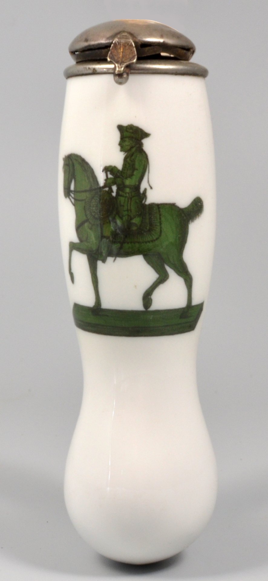 „Pfeifenkopf aus Porzellan, mit festem Abzuge holländische Form“ (Preis-Verzeichniss 1828); auf der Schauseite als Ausdruck einer mit Patina besetzten Bronzeplastik in schwarzen und grünen Muffelfarben die Abbildung eines Denkmalentwurfes für Friedrich II in Berlin. (Auftrag am 29.02.1836 an Johann Gottfried Schadow, Grundsteinlegung am 01.06.1840, Realisierung durch Christian Daniel Rauch und Enthüllung am 31.05.1851); blaue Strichmarke im Pfeifenhals; Montierung und Halstülle aus Silber.
