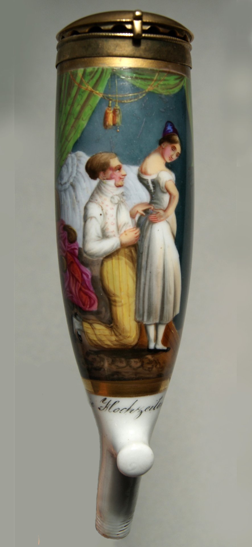 Pfeifenstummel  aus Porzellan, Berliner Form; in bunten Muffelfarben Darstellung eines Paares, das sich im Schlafzimmer wohl zur Vorbereitung der Hochzeitsnacht zu entkleiden begonnen hat und der junge Mann das Mieder aufschnürt. Vorlage der Darstellung ist eine Karikatur von Louis-Frédéric Corréard (1815 – 1858); unter dem Bildfeld bezeichnet: "Die Hochzeitsnacht"; Montierung: Messing. H=15,0 cm (a=142; b=111; c=38 mm)
