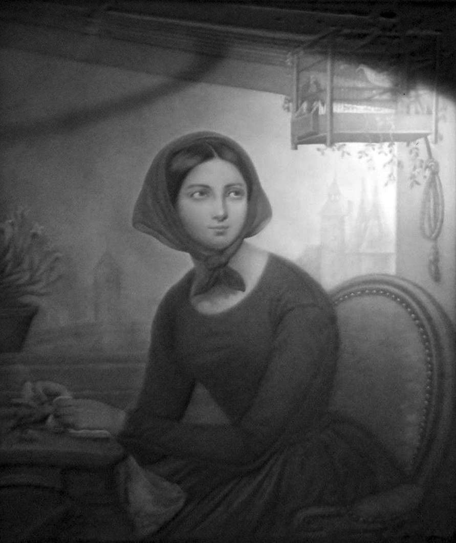 Lithophanie, KPM Berlin, Modell KPM 373, im Preiscourant bezeichnet „Lachtaube“, nach dem Gemälde „Rigolette cherchant à se distraire en l'absence de Germain“ 1844 von Joseph Désiré Court (1797-1865); 23,5 x 18,4 cm