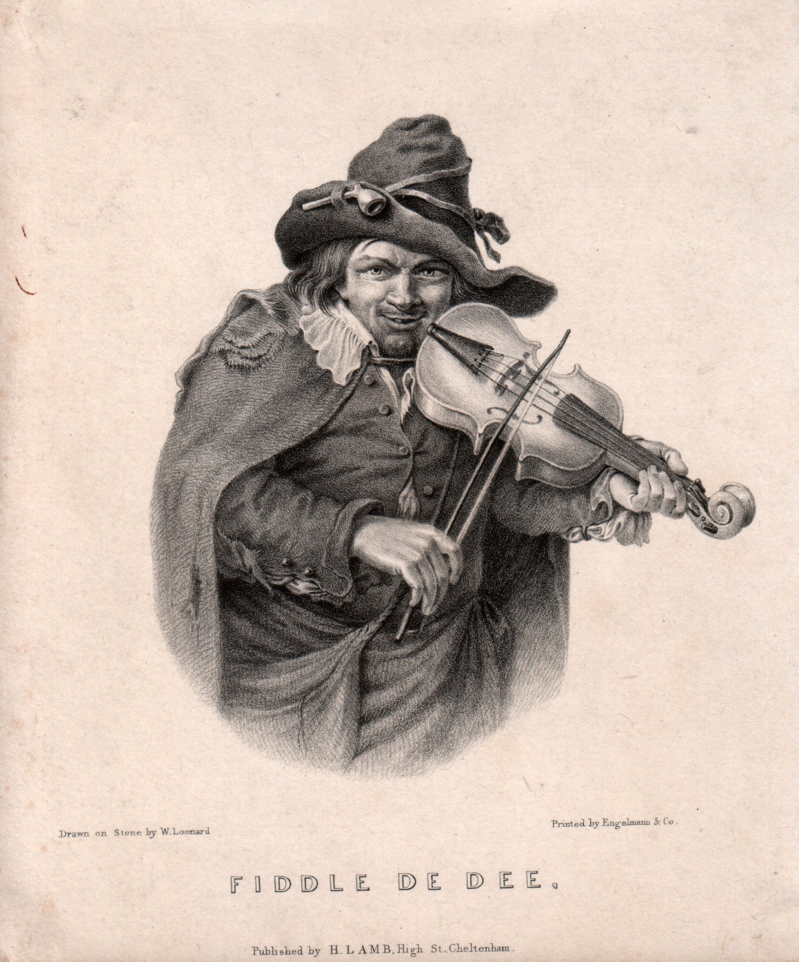 Lithographie, bezeichnet „FIDDLE DE DEE“, gezeichnet von (wohl englischer Lithograph) W. Loonard, nach einem Auszug aus dem Gemälde „Les musiciens ambulans“ von Christian Wilhelm Ernst Dietrich, gen. Dietricy (1712 - 1774), gedruckt by Engelmann & Co., Published by H. Lamb, High St. Cheltenham; 20 x 17 cm