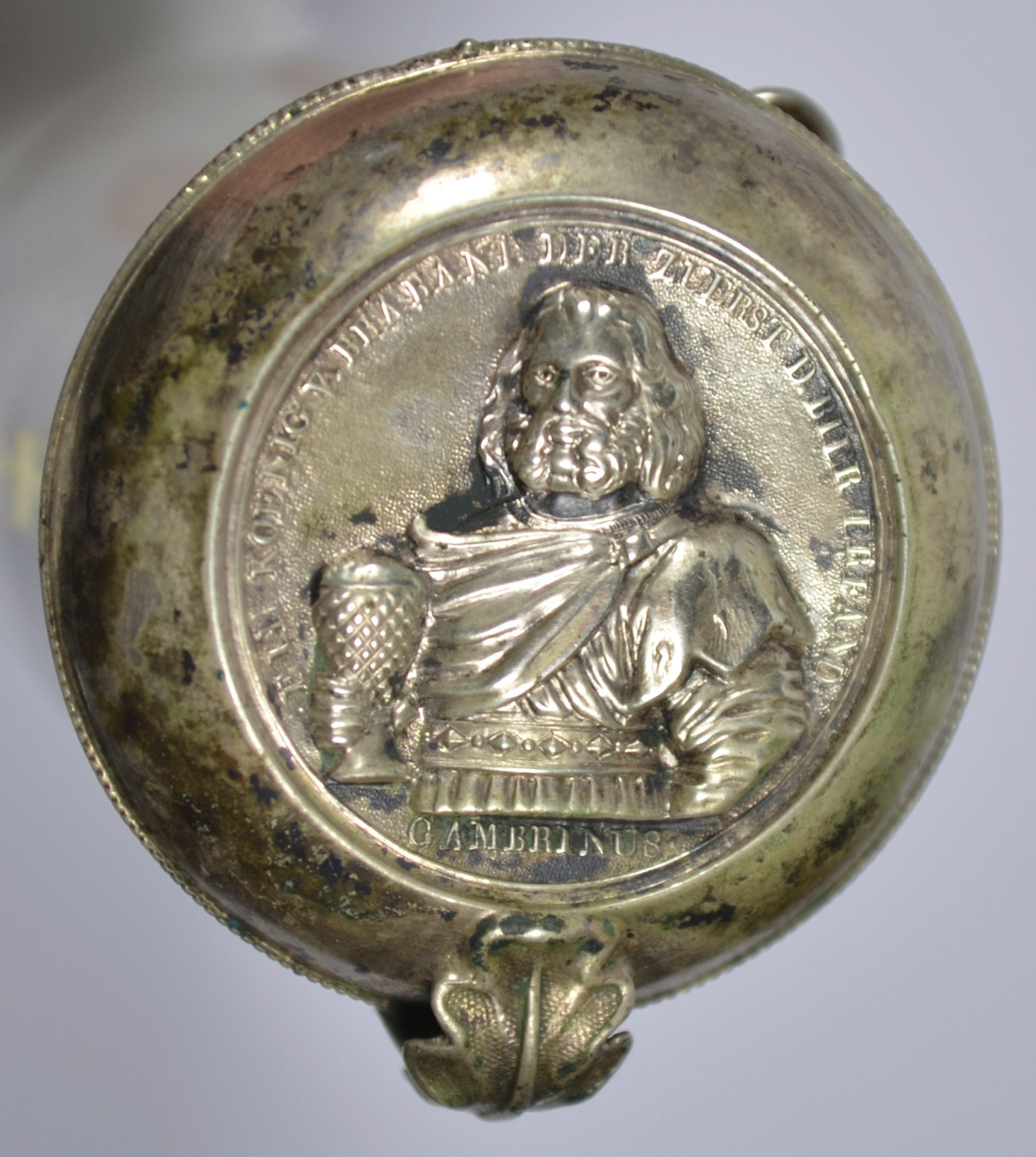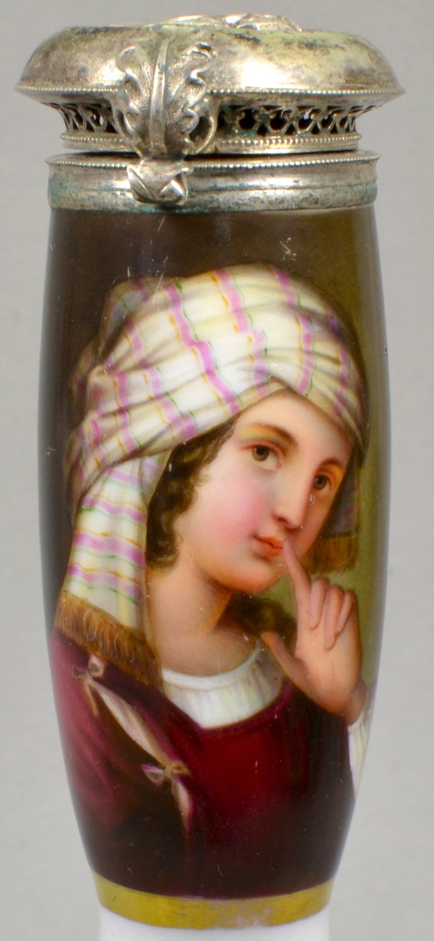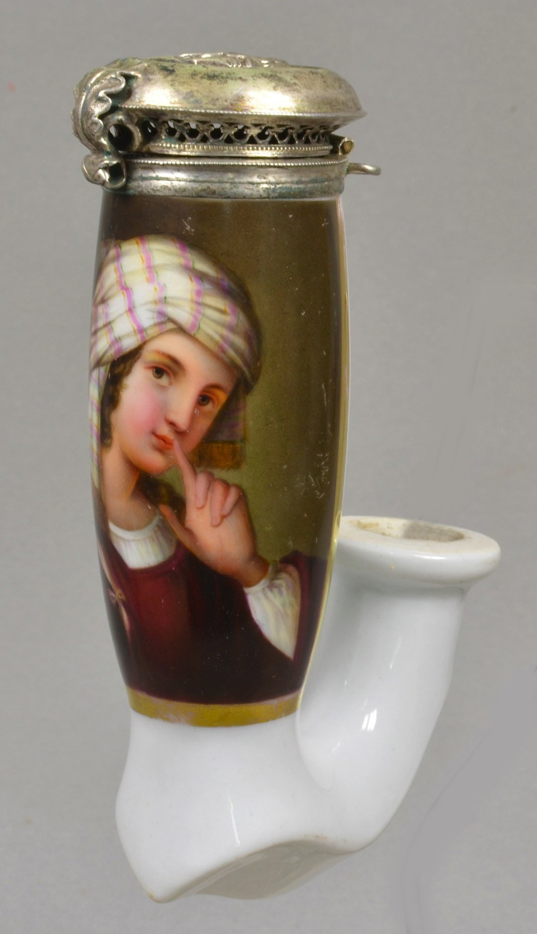 Pfeifenkopf aus Porzellan mit festem Abzug in geschwungener Grundform mit kielförmigen Pfeifenhals ; auf der Schauseite in Goldrahmen mit bunten Muffelfarben die Darstellung der Cirkassierinn nach dem Gemälde von Domenichino (1581 – 1641); hohe Silbermontur mit Blatt als Schnapper; im Deckel plastisch hervorgehoben das Halbportrait von Gambrinus mit der Umschrift: „EIN KÖNIG V: BRABANT. DER ZUERST D.BIER ERFAND“. H. ohn. Montur: 11,3cm; H. mit Montur: 13,0cm; D.: 3,7cm