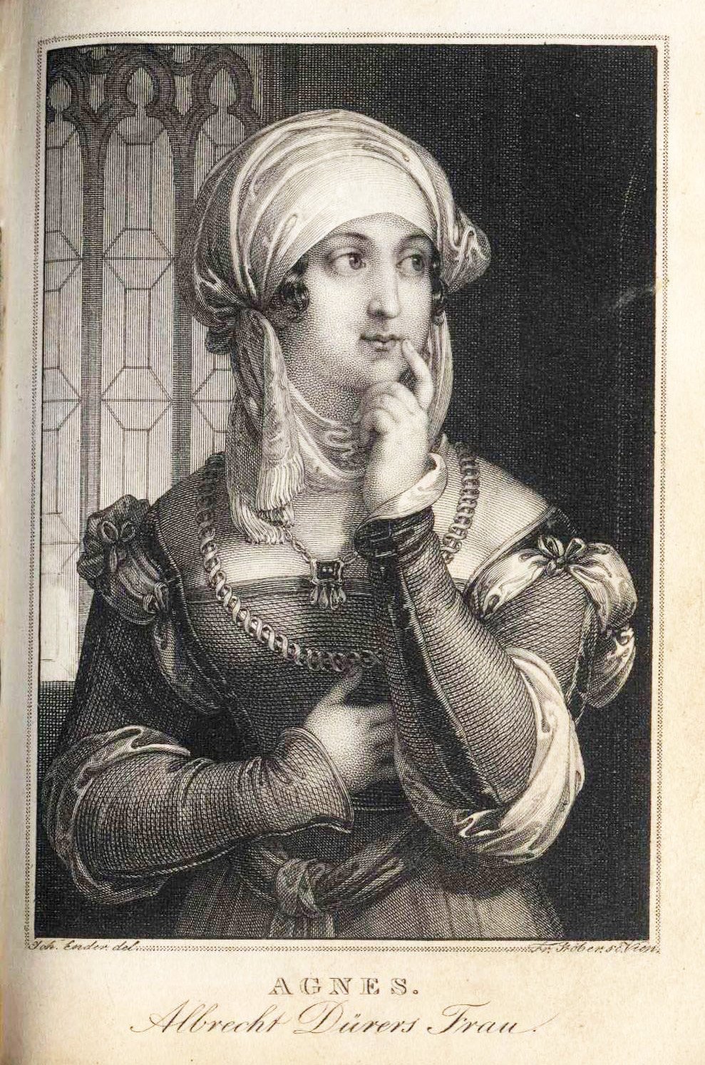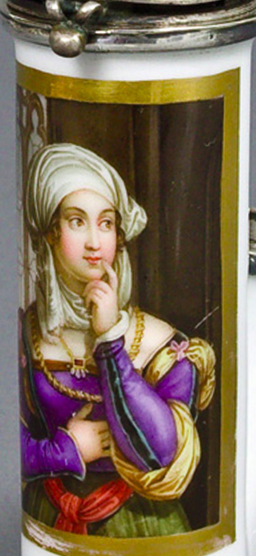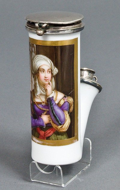 Porzellanpfeifenkopf, „Zylindrischer Korpus, Abguss vom ungarischen Typ (Morgenroth Nr. 19); in bunten Muffelfarben Darstellung der Agnes Dürer, gemalt nach einer Vorlage von Johann Nepomuk Ender (1793-1854), diese in Kupfer gestochen von Franz Xaver Stöber (1795-1858). Abb. Bei Morgenroth, S XXXV. Im Kessel unter Glasur die Blaumarke der Manufaktur Schlaggenwald. Montierung: Silber. H=11,0 cm“