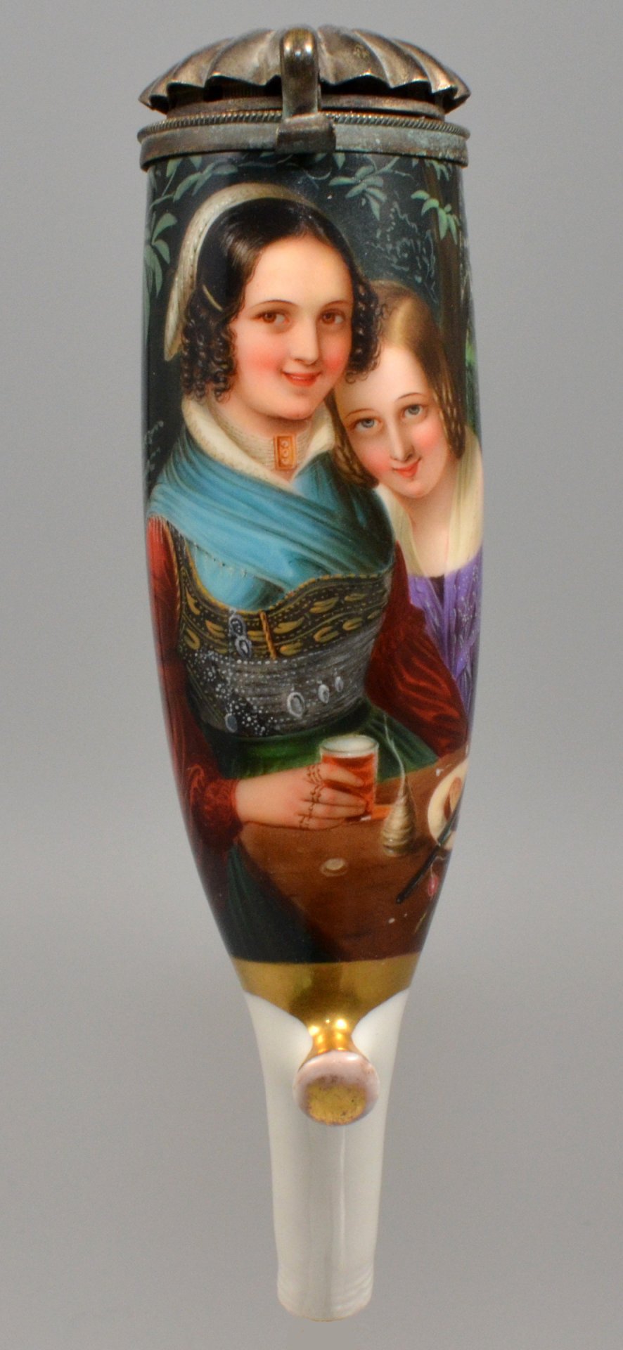 Pfeifenstummel, Berliner Form, auf der Wandung beinahe vollständig den gesamten Korpus umspannendes, golden gerahmtes Bildfeld; in bunten Muffelfarben die Darstellung der „Schönen Münchnerin“ nach Vorlage von Carl Engel, genannt Engel von Rabenau (1817 – 1870). Nach Walter Morgenroth wohl Hausmalerei Hannes & Wieninger. H.: 14,1 cm.