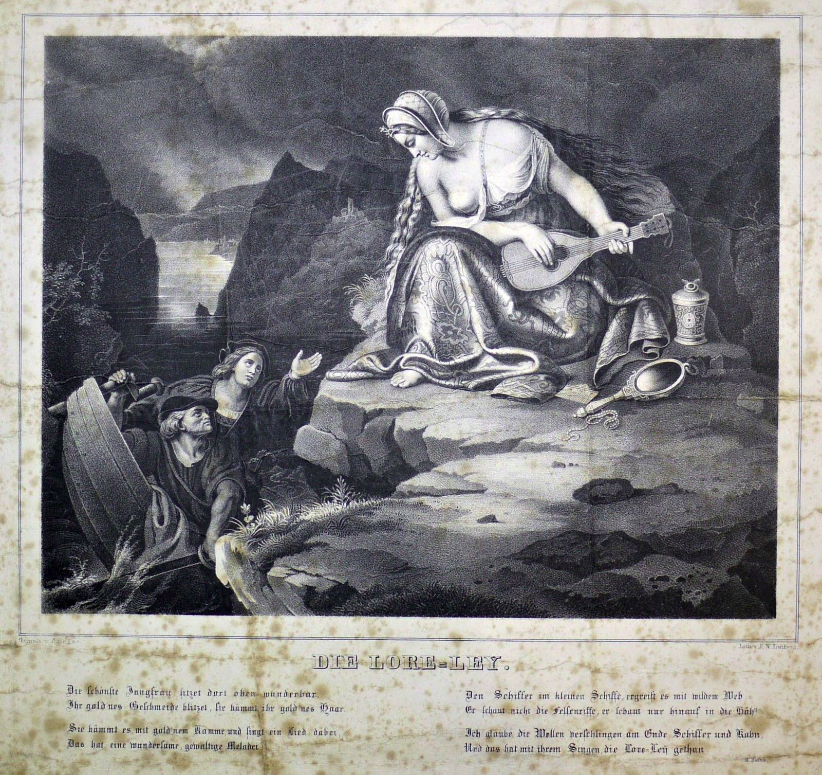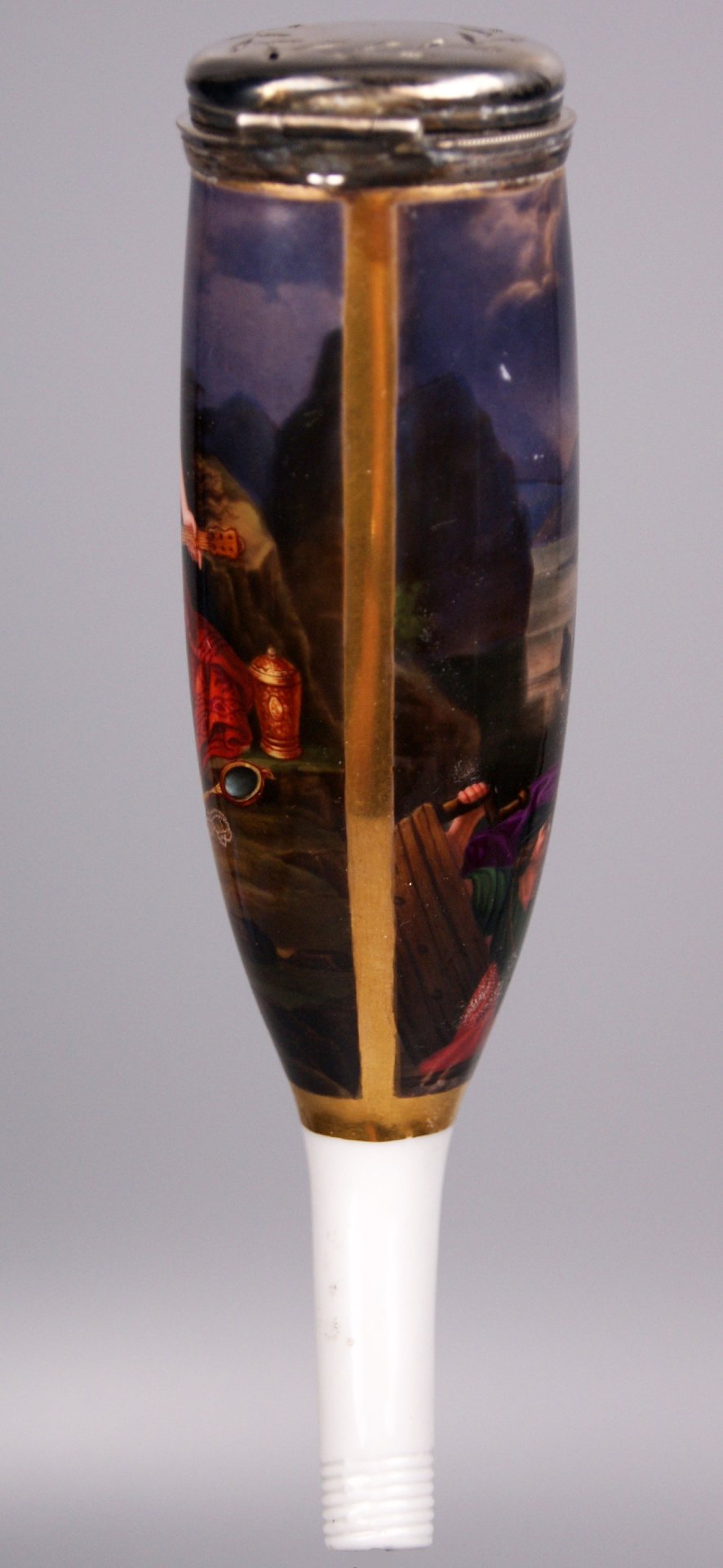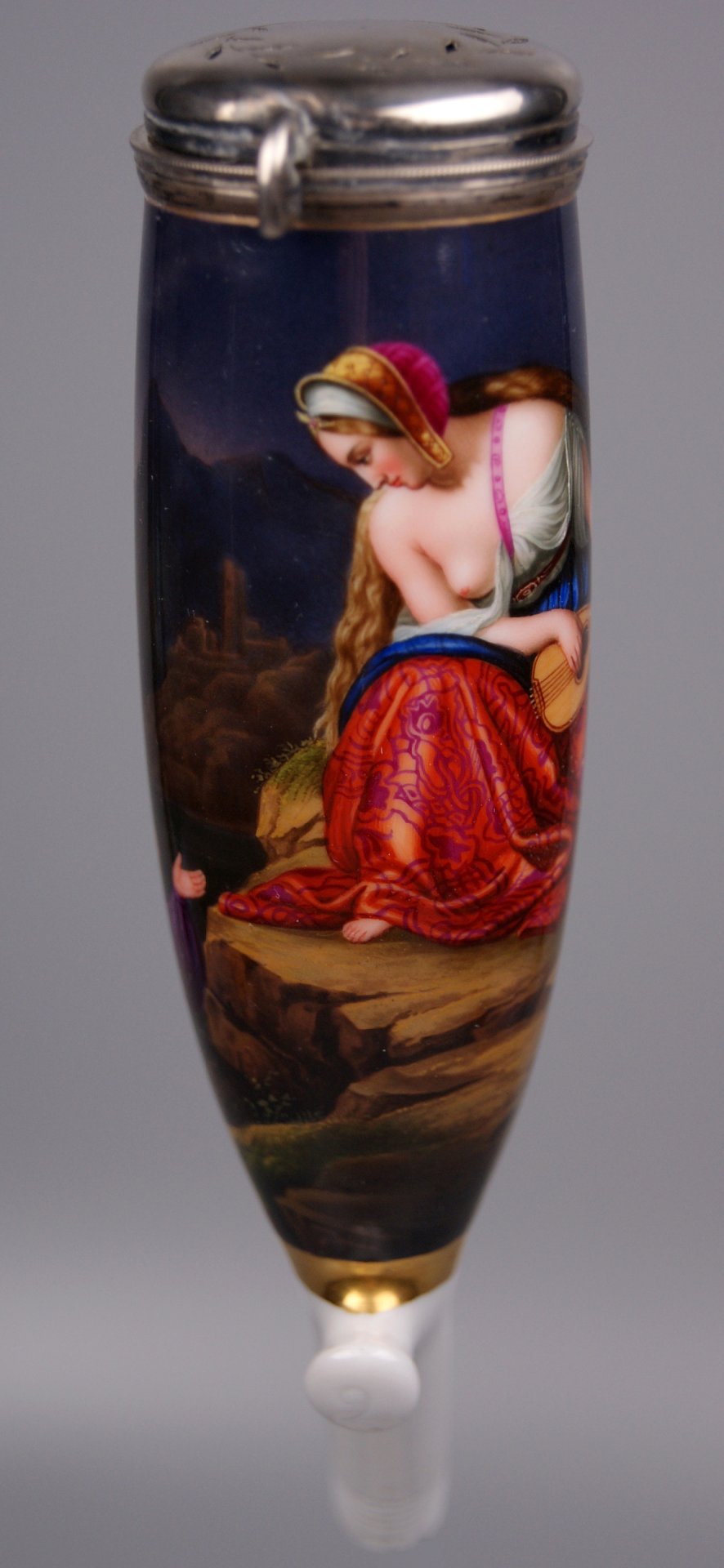 Pfeifenstummel aus Porzellan, Berliner Form;  auf der Wandung den gesamten Korpus umspannendes, in Gold gerahmtes Bildfeld mit bunten Muffelfarben die Darstellung des Gemäldes „Die Lureley“ von Carl Joseph Begas der Ältere  (1794 – 1884), 1835, Öl a. Lw., 124 x 136cm, Kreismuseum Heinsberg. Montur Silber, Stummelferse 9; H.: 14,1cm