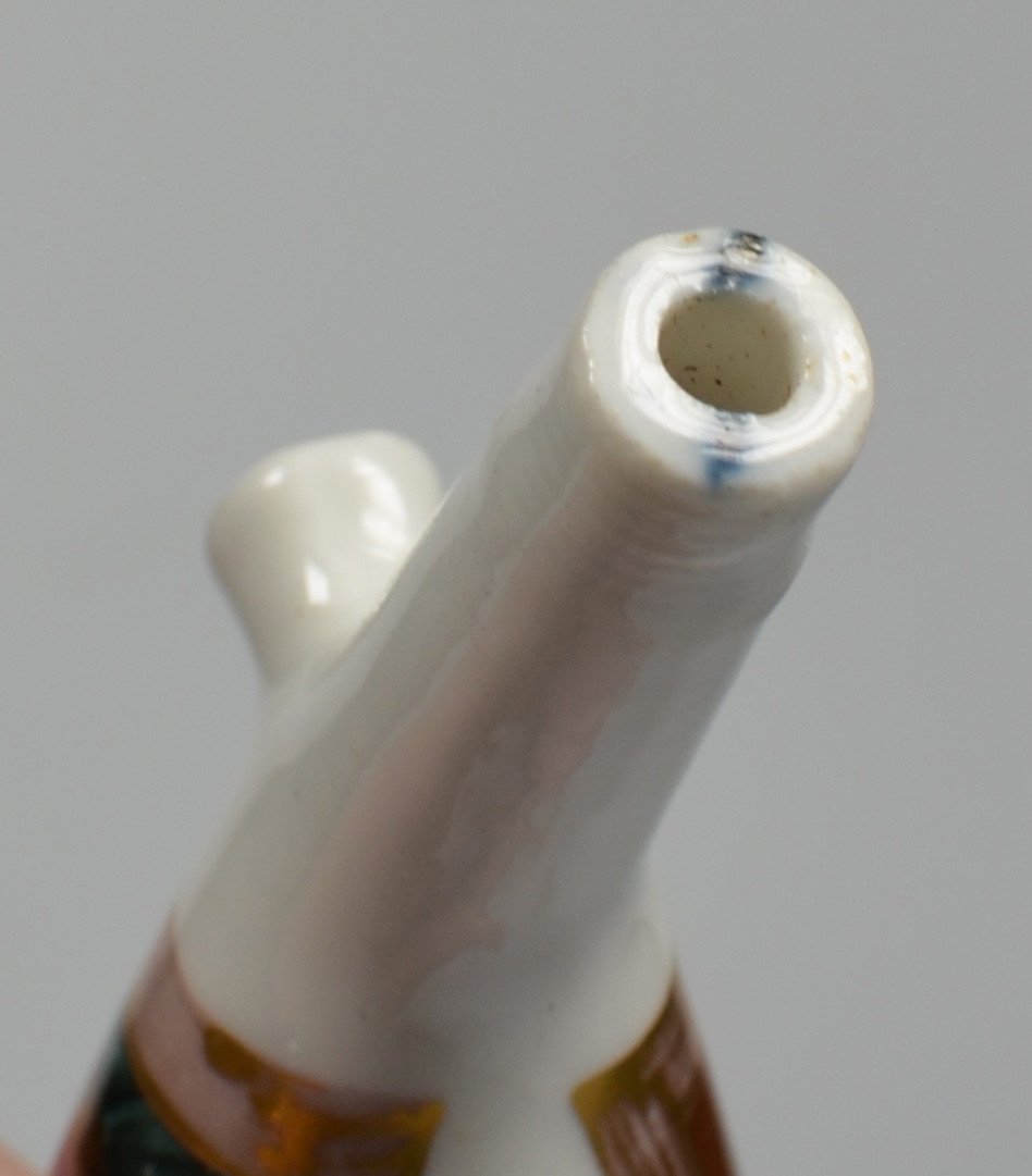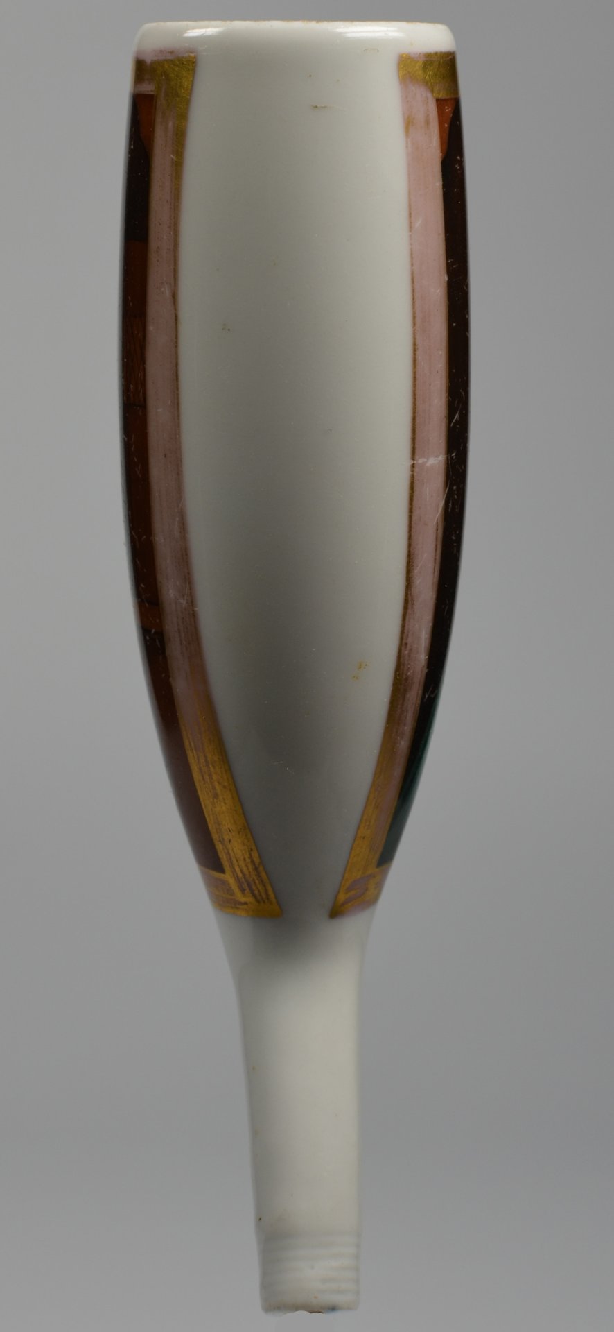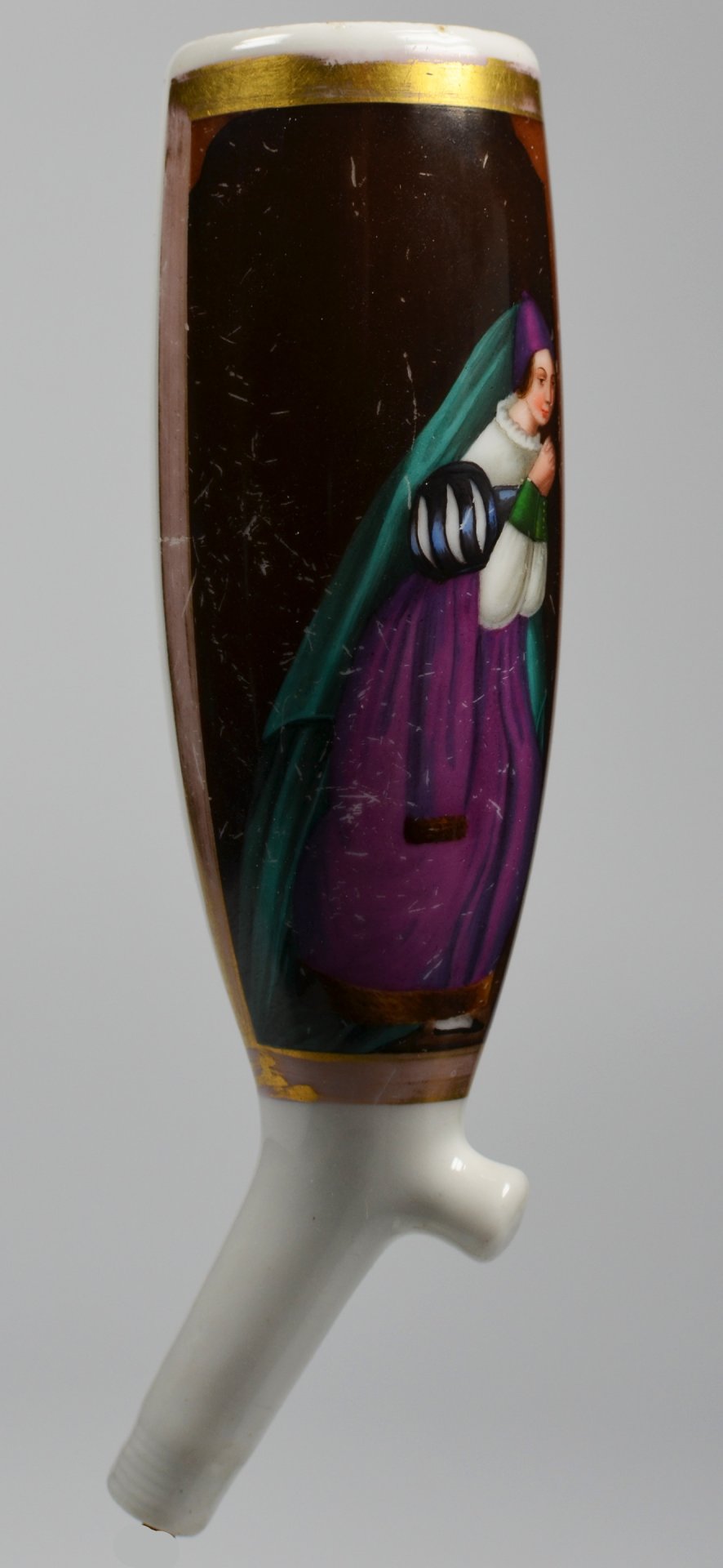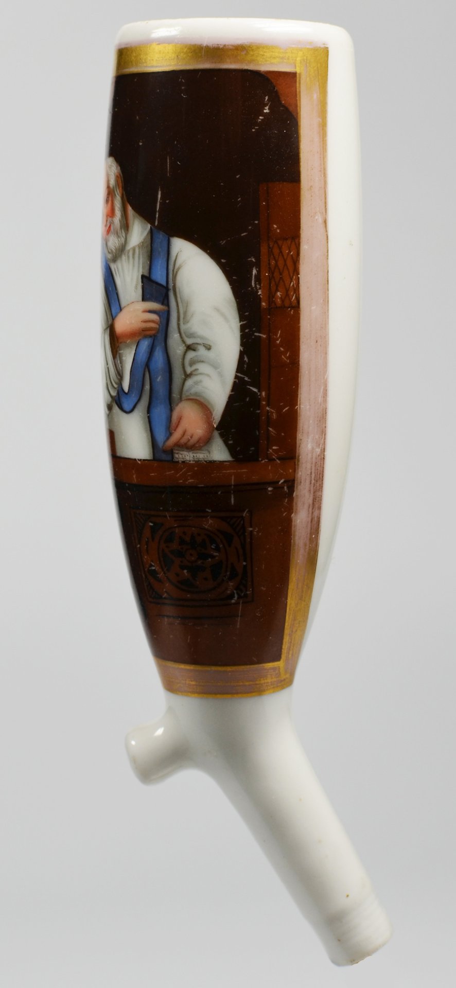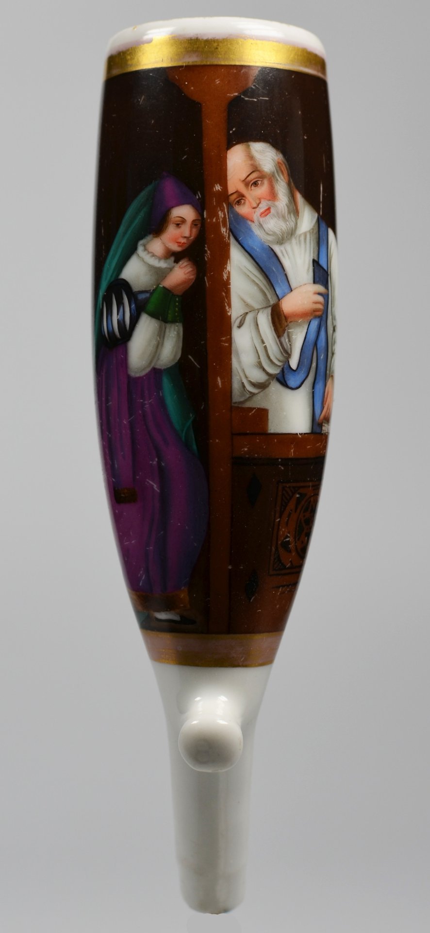 Pfeifenstummel aus Porzellan, Berliner Form, auf der Wandung ¾ umfassend, in Goldrahmen umrandeter Rechteckkartusche mit bunten Muffelfarben das Motiv „Die Beichte“ nach einem Gemälde von August Wilhelm Esperstedt (geb. 1814), Ferse mit Presszahl 8; am Stielboden unterglasurblauer Querstrich; H.: 12,7 cm (b=100; c=34,7mm)