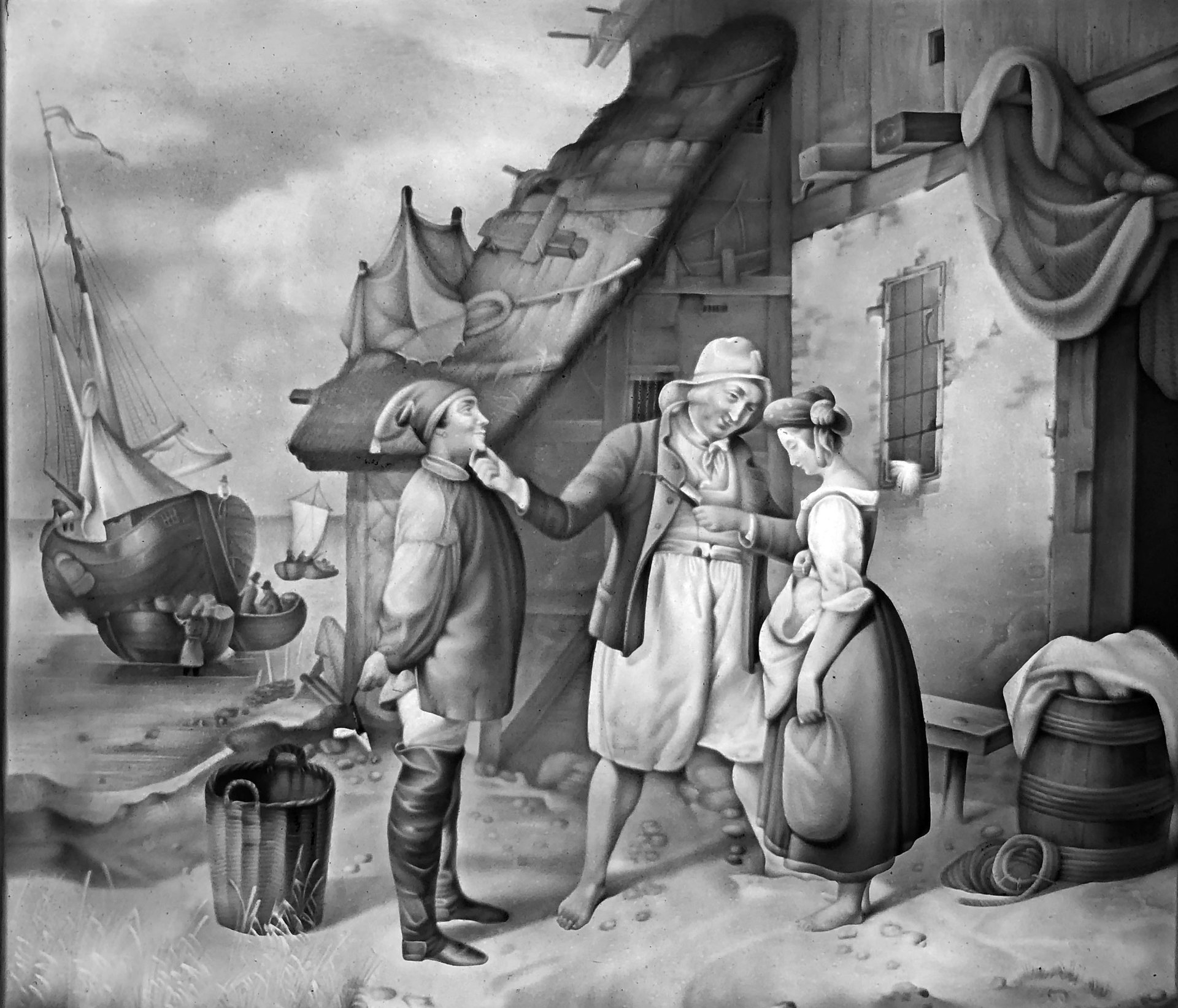 Lithophanie, Modell 124, im Preis-Courant bezeichnet: „Heyraths-Antrag auf Helgoland“; Vorlage ist das Gemälde von Rudolf Jordan (1810-1887), Heiratsantrag auf Helgoland, 16 x 18,5 cm