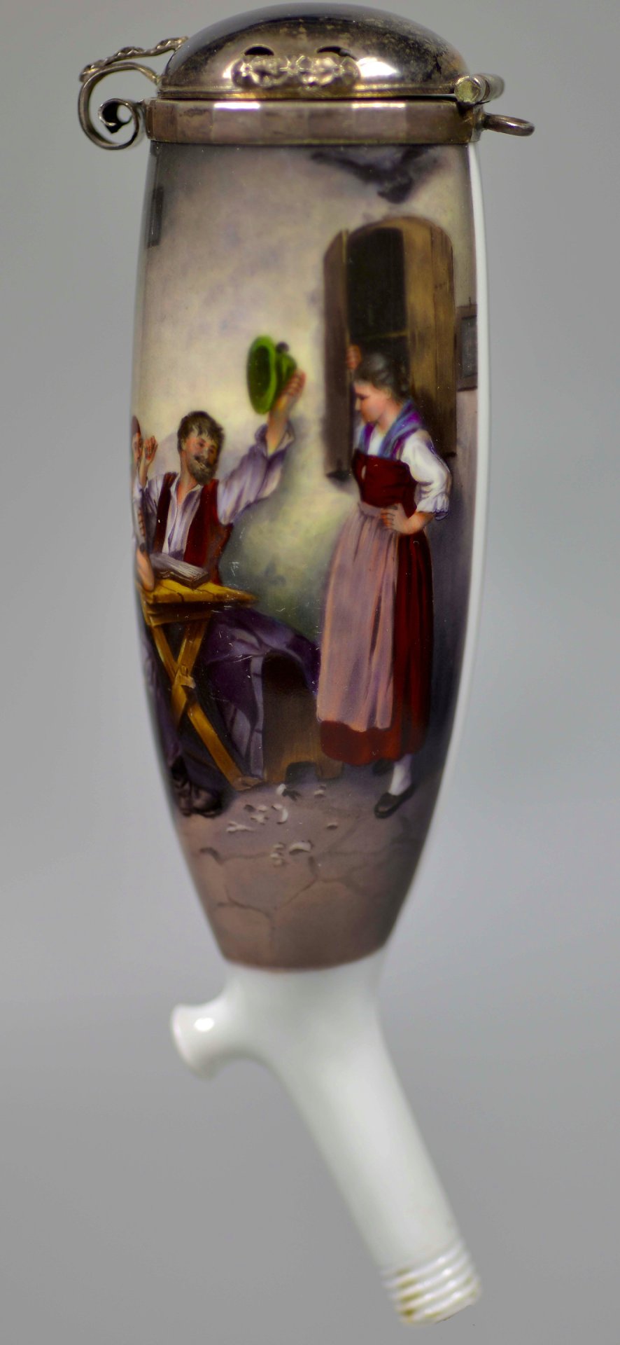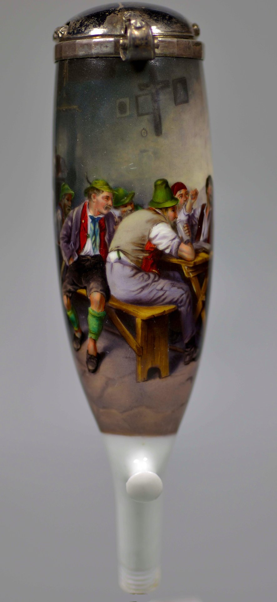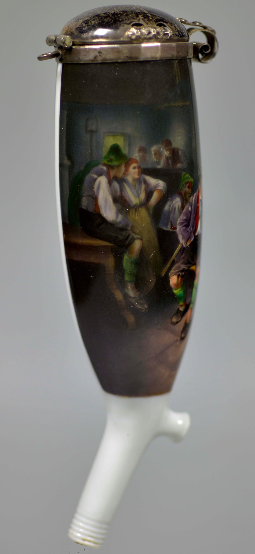Pfeifenstummel aus Porzellan, Berliner Form, sehr seltene qualitätvolle Lupenmalerei aus jener Zeit, die den Korpus beinahe vollständig umfasst. Mit bunten Muffelfarben ist eine Szene in einem größeren Wirtshaus in Münchendargestellt, in der die eintretende Wirtin freundlich empfangen wird. Vorlage ist das Gemälde von Adolf Lüben mit dem Titel „Schnadahüpfln“. Montur: Silber, undeutlich gepunzt. H=16cm (a=151; b=118; c=43,2mm)