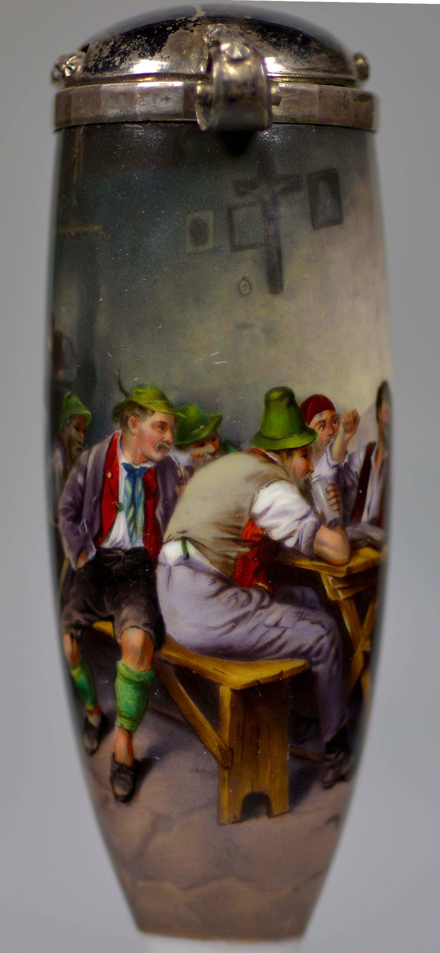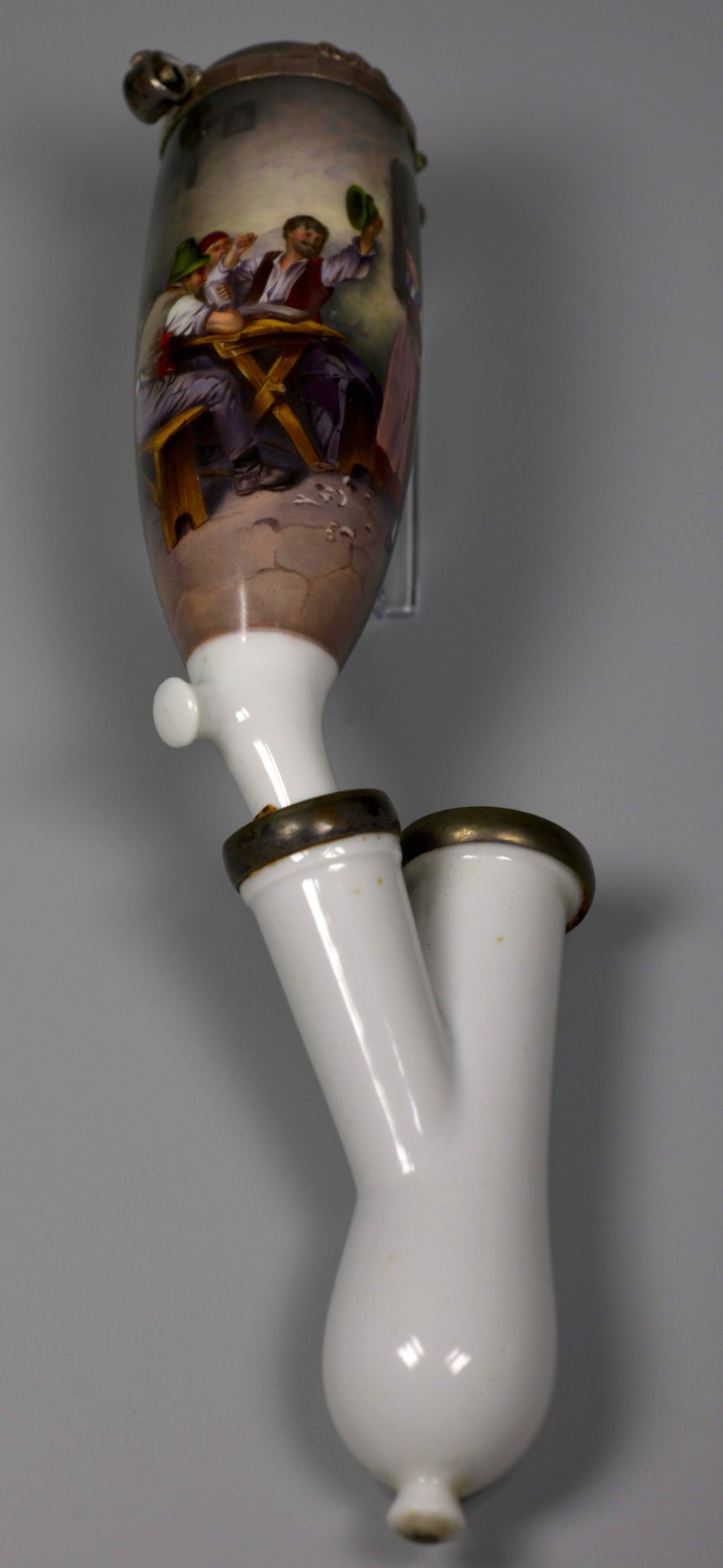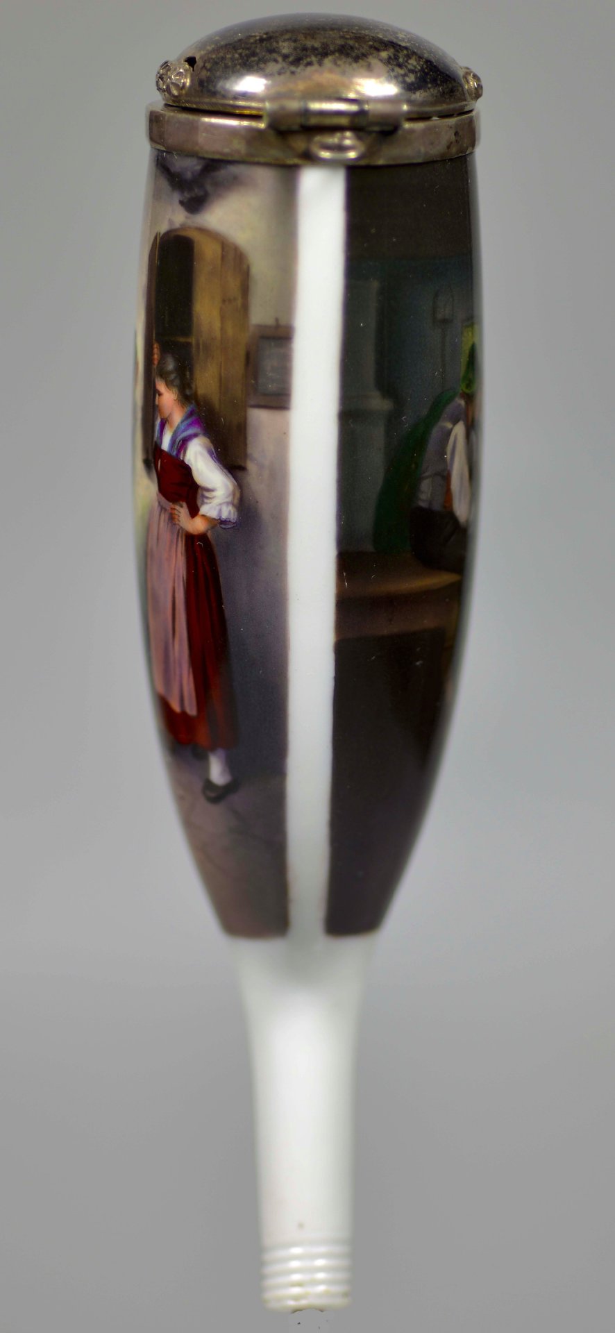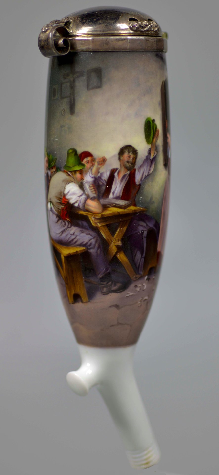 Pfeifenstummel aus Porzellan, Berliner Form, sehr seltene qualitätvolle Lupenmalerei aus jener Zeit, die den Korpus beinahe vollständig umfasst. Mit bunten Muffelfarben ist eine Szene in einem größeren Wirtshaus in Münchendargestellt, in der die eintretende Wirtin freundlich empfangen wird. Vorlage ist das Gemälde von Adolf Lüben mit dem Titel „Schnadahüpfln“. Montur: Silber, undeutlich gepunzt. H=16cm (a=151; b=118; c=43,2mm)