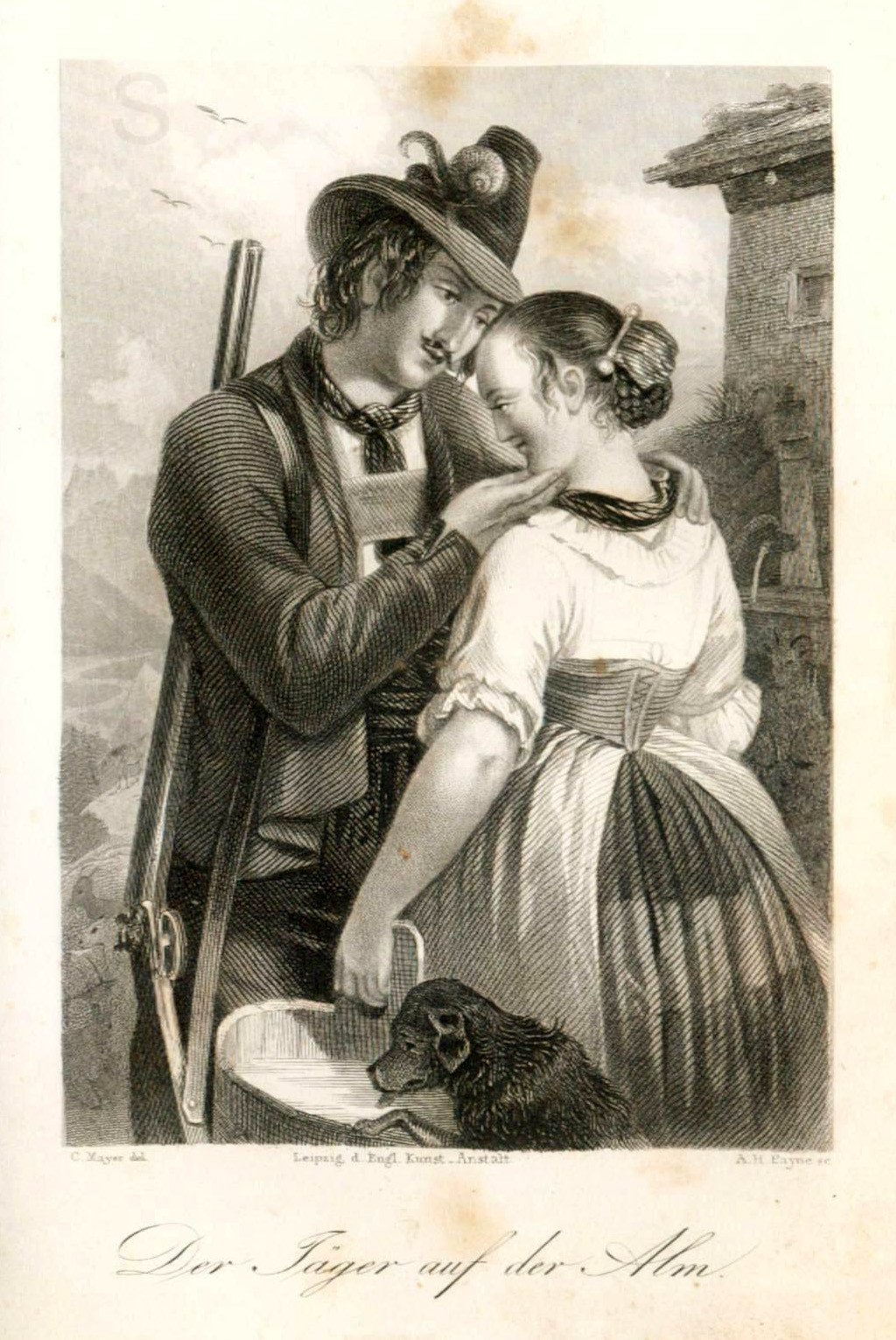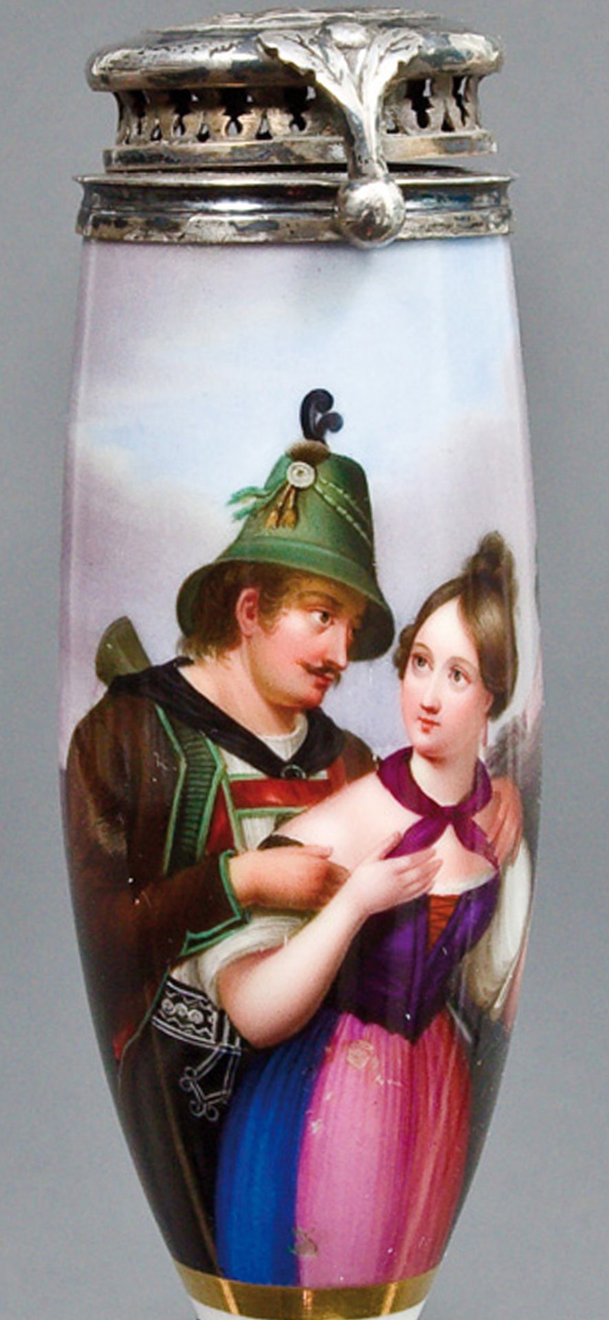 Porzellanpfeifenkopf, Berliner Form; auf der Wandung ein rechteckiges, auch die Seiten des Korpus umfassendes Bildfeld in mittelbreitem Goldrahmen; in bunten Muffelfarben Darstellung eines jungen Paares in Bayerischer Tracht. Die Vorlage der Darstellung „Der Jäger auf der Alm“ stammt von Carl Mayer (1798-1868), gestochen von Albert Payne (1812-1902), erschienen in: Iris, Taschenbuch für das Jahr 1842 im Verlag von Gustav Heckehast, Pesth. (vergl. A0195) Montierung: Silber; auf dem Deckel reliefiert ein Hirsch und eine Hirschkuh; H=14,0 cm“