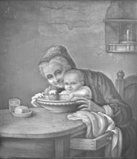 Plaue, Lithophanie PPM 662, im Preis-Courant bezeichnet „Grossmutters Enkel“ nach dem Gemälde „Grossmutter und Enkel“ von Johann Georg Meyer – Meyer von Bremen (vergl. von Boetticher /177, Bd. 2, 1. Hälfte, S.40, Nr.138/), 12,7 x 10,8 cm.