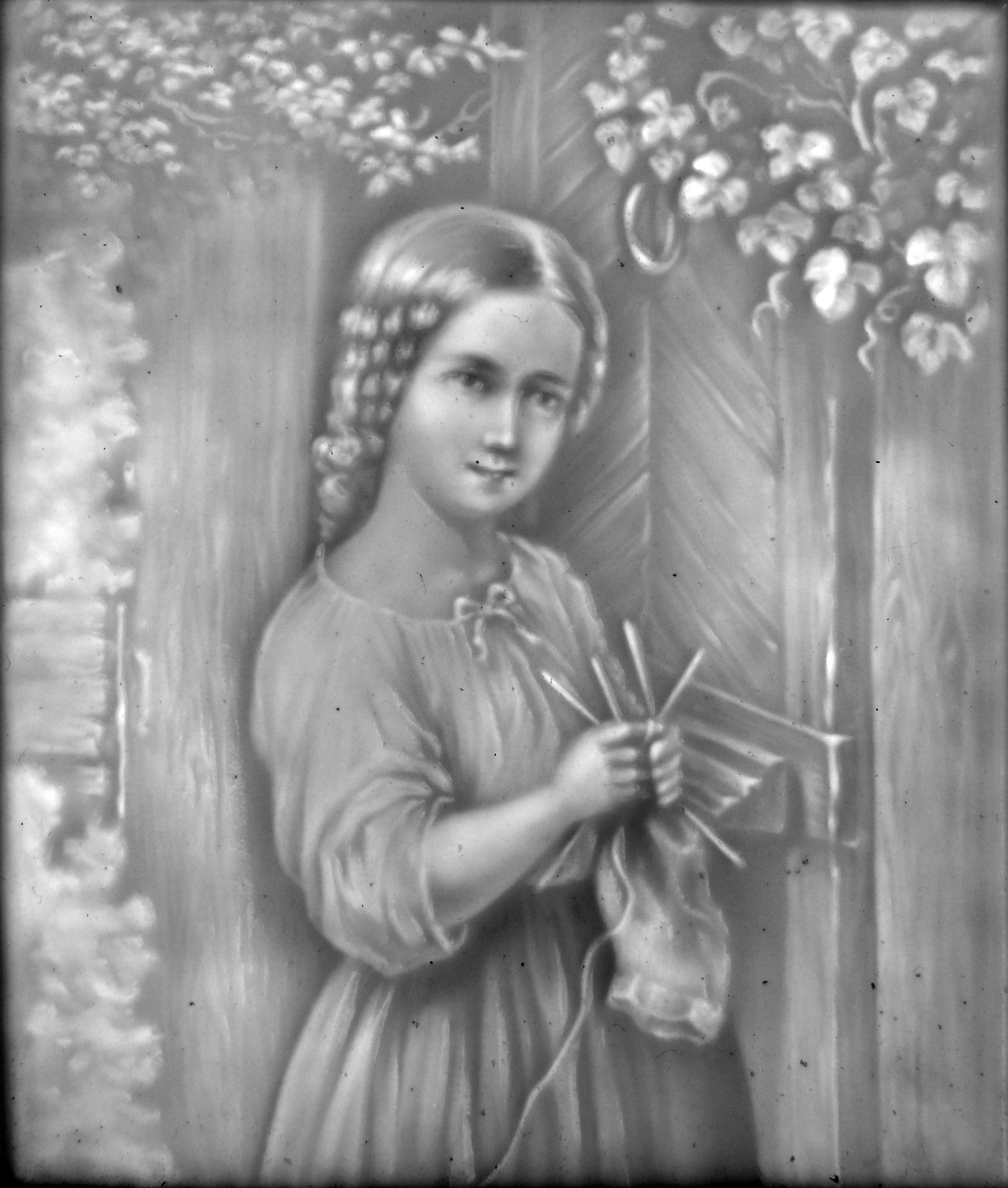 Plaue, Lithophanie PPM 375, bezeichnet im Preis-Courant „Die fleissige Strickerin“, nach dem Gemälde „Strickendes Mädchen“ nach Johann Georg Meyer – Meyer von Bremen (vergl. von Boetticher /177, Bd. 2, 1. Hälfte, S.39, Nr.80/), 8,9 x 7,6 cm