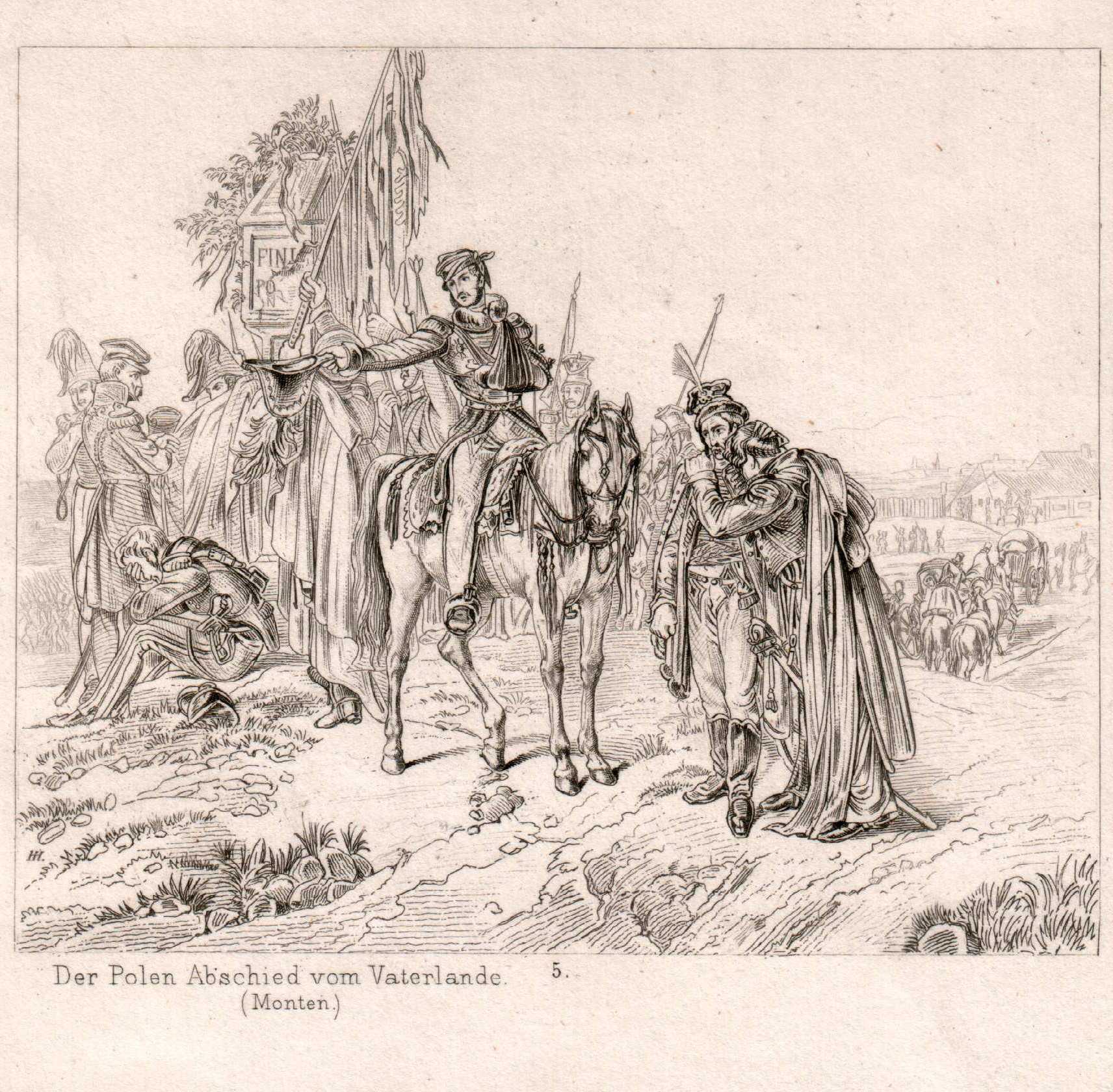 Stahlstich um 1840, bezeichnet: „Der Polen Abschied vom Vaterlande“ nach dem Gemälde „Finis Poloniae, Abschied der Polen vom Vaterlande 1831“ von Dietrich Monten (1799-1843) in der Nationalgalerie Berlin. Blatt: 11,2 x 12,8 cm, Abbildung: 8,8 x 10,5 cm.