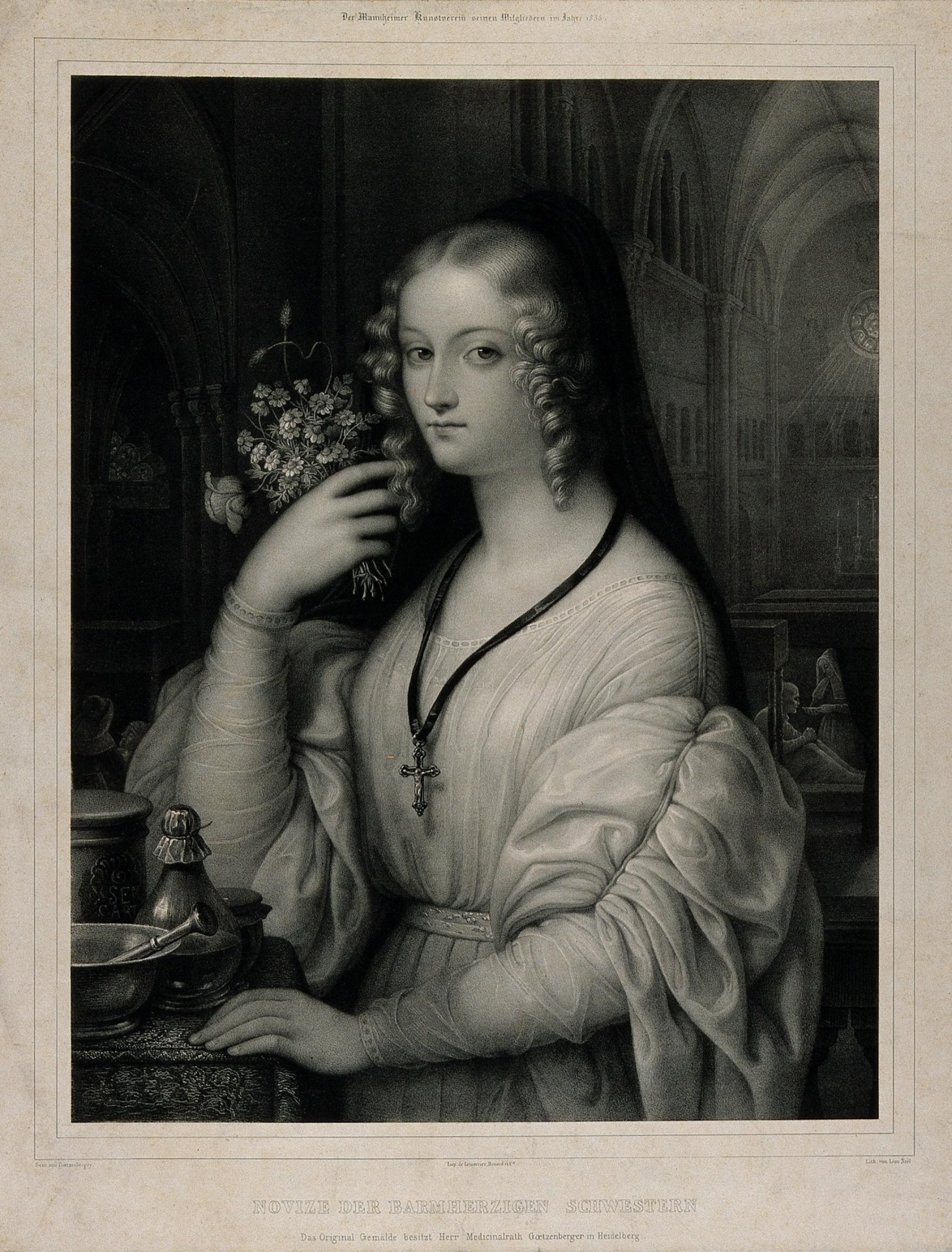 Lithographie, Der Mannheimer Kunstverein seinen Mitgliedern 1838, bezeichnet: Novize der barmherzigen Schwestern Das Original Gemälde besitzt Herr Medicinalrath Goetzenberger in Heidelberg,  gem. von Götzenberger, lith. von Léon Noël nach dem Gemälde von Jakob Götzenberger (auch Franz Jakob Julius Götzenberger, 1802-1866)