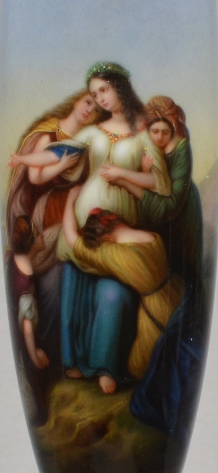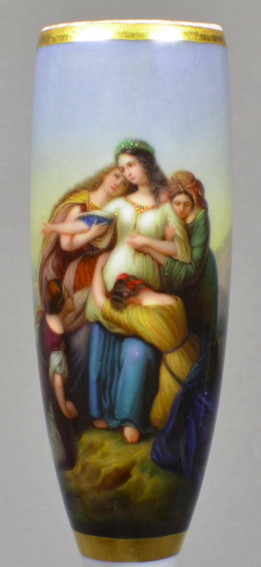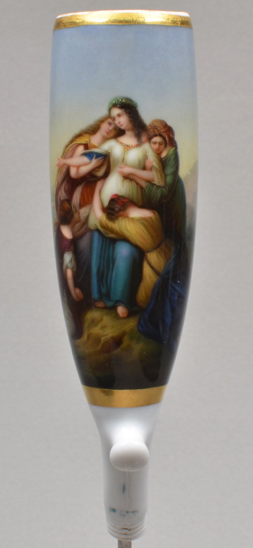 Pfeifenstummel, Berliner Form, beinahe den gesamten Korpus umspannendes, golden gerahmtes Bildfeld; in bunten Muffelfarben Darstellung der Tochter des Jephta, die im Gebirge Abschied von ihrer Heimat und ihren Lieben nimmt. Vorlage ist das Gemälde „Die Tochter Jephtas aus dem Jahre 1835 von Karl Wilhelm Frirdrich Oesterley d. Ä.,  Niedersächsisches Landesmuseum, Hannover. Auf dem Schaft signiert PFS unter Strich, Stummelferse Pressmarke 0 (10), H.: 14,5cm