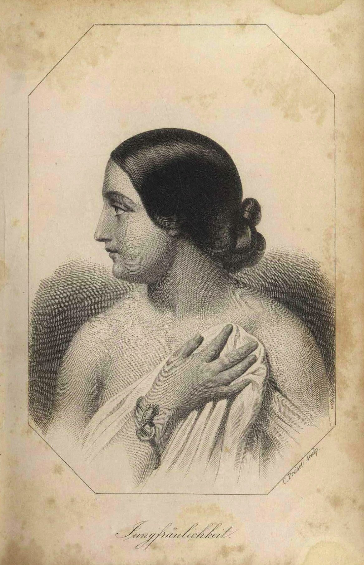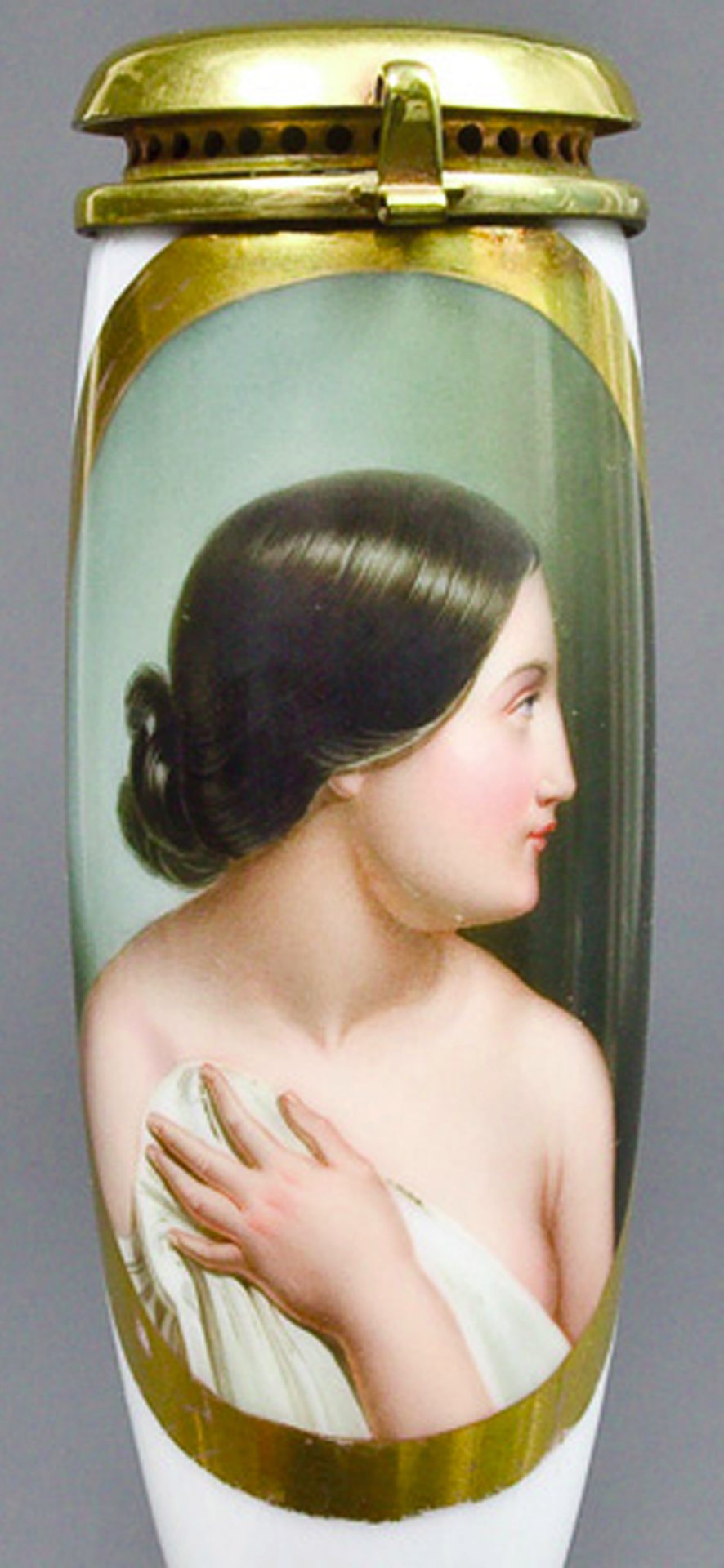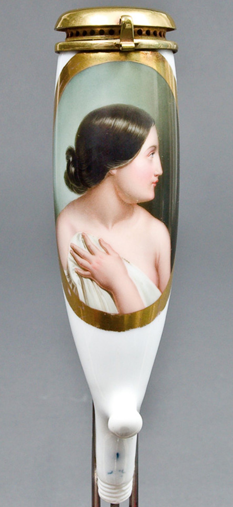 Pfeifenstummel aus Porzellan, „Berliner Form; in bunten Muffelfarben auf lindgrünem Fond Halbporträt einer jungen Frau. Die „en face“ Dargestellte ist unbekleidet. Sie verhüllt ihren Busen nur sehr unvollständig mit einem weißen Tuch, das sie mit der erhobenen Linken an sich presst. Auf dem Schaft unter Glasur die Blaumarke PFS (Przellan-Fabrik Schney), darüber ein senkrechter blauer Strich. Vorlage der Darstellung ist ein hier seitenverkehrt wiedergegebener Kupferstich von E. Preisel aus: Vielliebchen. Ein Taschenbuch für 1850. Neue Folge, 1.Jg., Leipzig o.J. (1849). Montierung: Messing. H=14,2 cm“