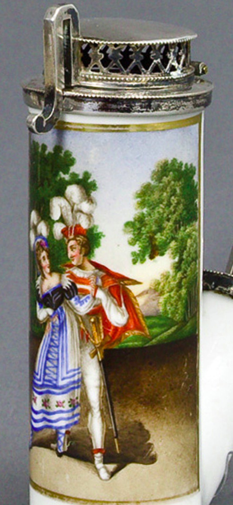 „Zylindrischer Korpus; Abguss vom ungarischen Typ (Morgenroth Nr. 19); in bunten Muffelfarben Darstellung zur Oper „Don Giovanni“ von Wolfgang Amadeus Mozart (1756-1791). Rückwärtig in schwarzer Schreibschrift: „Don Juan“. Vorlage ist ein Kupferstich nach einer Zeichnung von von Johann Heinrich Ramberg (1763-1840) für den Opernalmanach „Orphea“, 2. Jahrgang, Leipzig 1825. Montierung: Silber. H=10,5 cm“