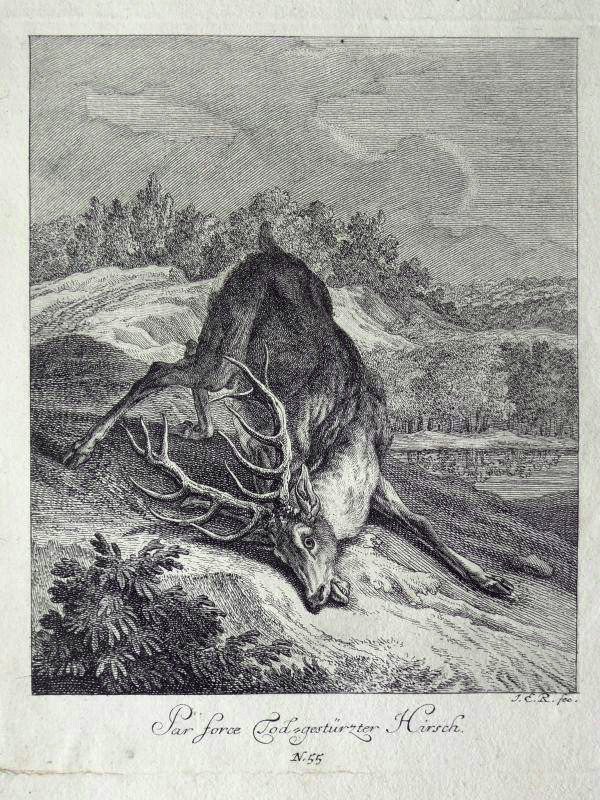 Kupferstich von Johann Elias Ridinger (1698-1767) bezeichnet: "Par force Tod-gestürzter Hirsch - N. 55", erschienen in "Darstellung einzelner, sowohl in- als ausländischer Thiere"; Blatt: 26 x 20,5 cm