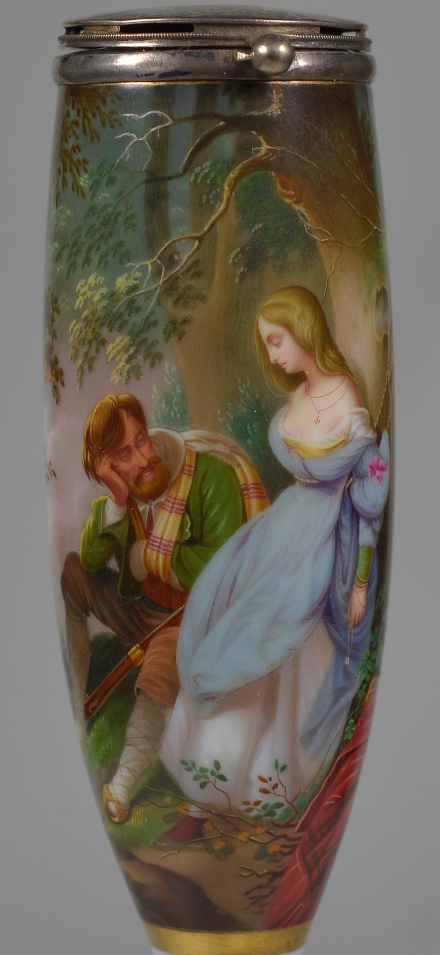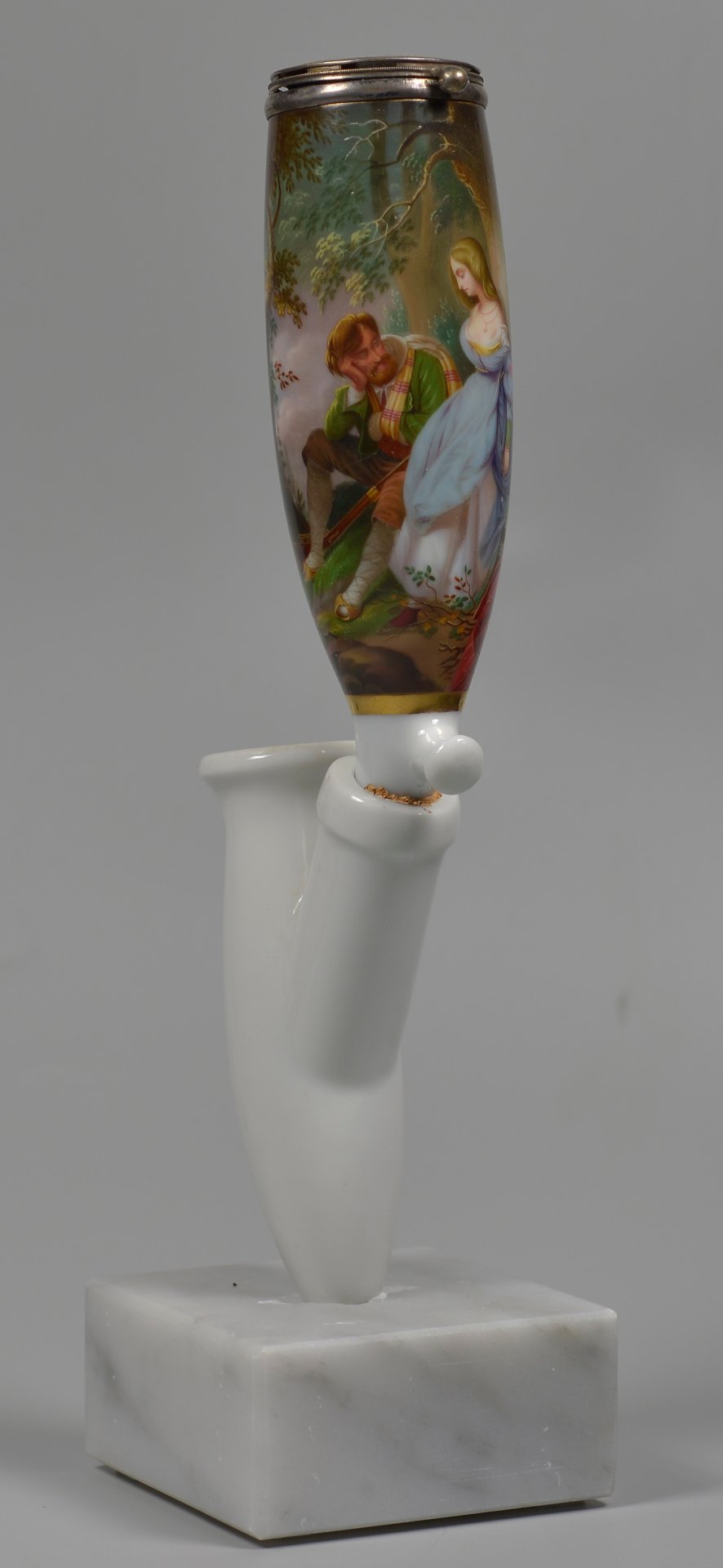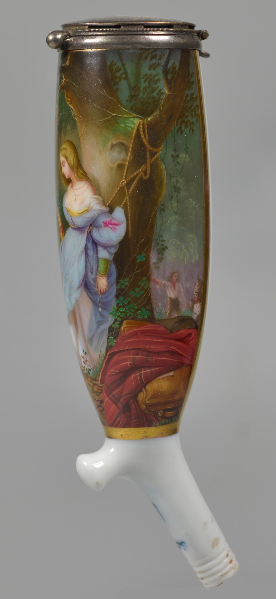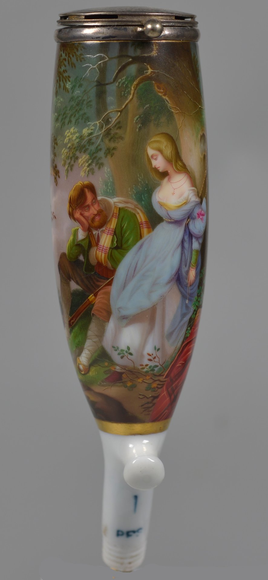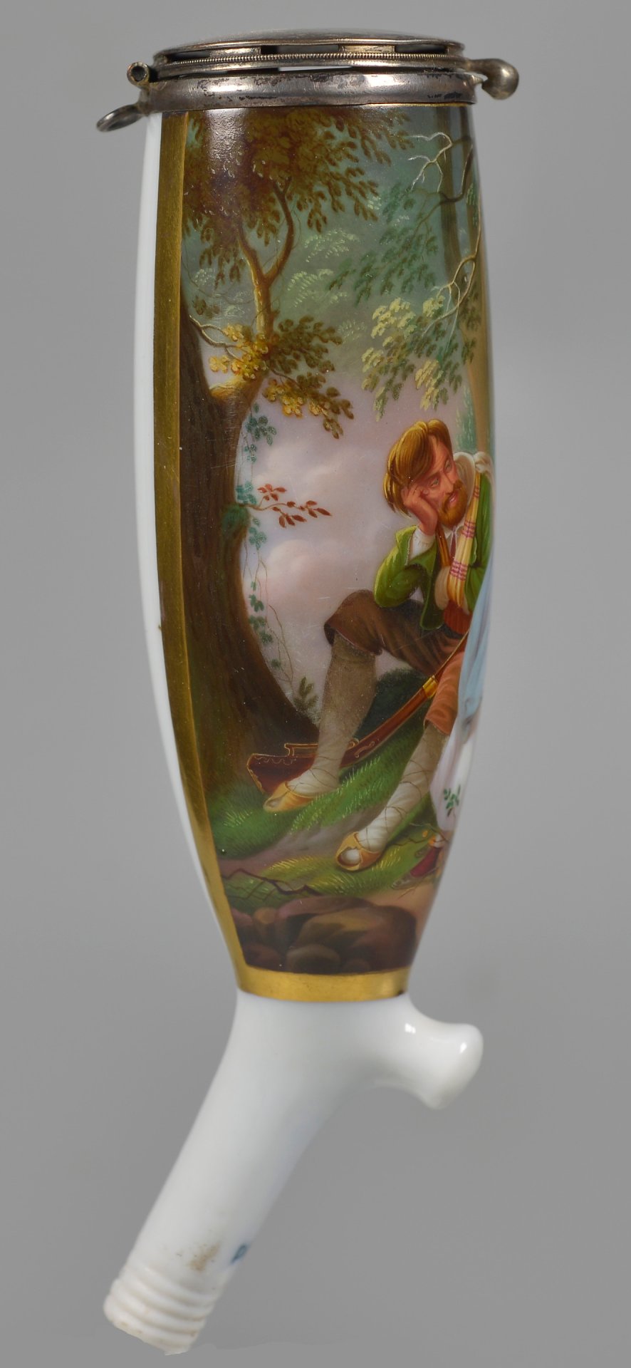 Pfeifenstummel aus Porzellan, Berliner Form; in einer ¾ den Korpus umfassenden, mit Goldrand eingefassten Rechteckkartusche in Lupenmalerei mit bunten Muffelfarben Wiedergabe des Gemäldes von Schopin „Die Befreiung“; Ferse mit Presszahl „9“; Stiel mit unterglasurblauen PFS unter Strich; Montur: Steckdeckel Silber, H=14,0cm (a=135; b=105; c=37,5mm)