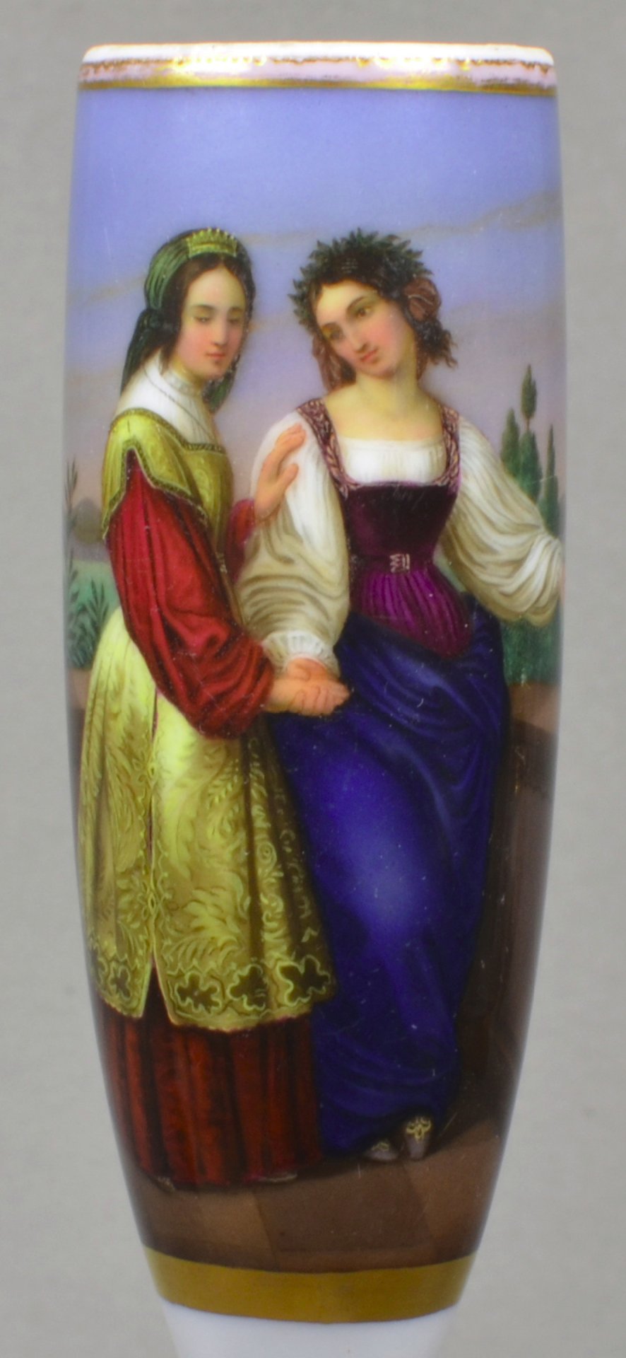 Ovaler Korpus, sich oben erweiternd (Morgenroth Nr. 45); in bunten Muffelfarben die Darstellung der beiden Leonoren aus dem „Tasso“ von Johann Wolfgang von Goethe nach dem Gemälde von Carl Ferdinand Sohn (1805 – 1867), Erstfassung von 1834 (u.a. Bäume im Hintergrund!). Auf dem Stiel die Marke PFS unter Strich, Ferse mit Presszahl 10; blauer halbseitiger Strich am Stielboden. (a=146; b=117; c=39 mm).