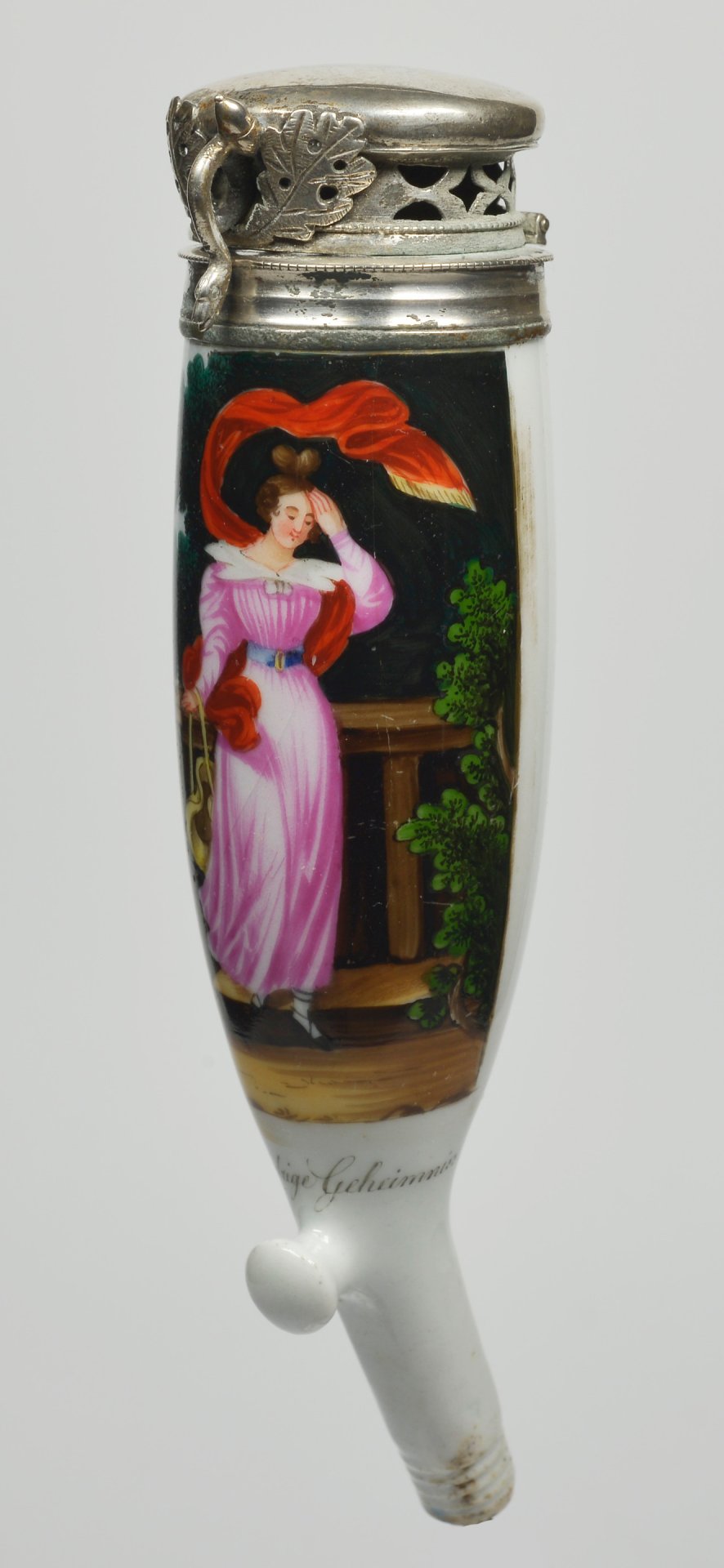 Pfeifenstummel aus Porzellan, Berliner Form; auf der Wandung zur Hälfte den Korpus umspannendes, stark beriebenes golden gerahmtes Bildfeld; darin mit bunten Muffelfarben in feiner Lupenmalerei die Wiedergabe einer Zeichnung und Stiches von K. A. Schwerdgeburth nach einer gleichnamigen Erzählung von Laurids Kruse (1778–1840), erschienen im „Taschenbuch der Liebe und Freundschaft gewidmet“ für das Jahr 1835; Ferse ohne Presszahl (wohl (8), Montierung: hoher durchbrochener dekorativer Körper aus Neusilber / Alpaka; H=14,3cn (a=126,8; b=99,9; c=36,1mm)