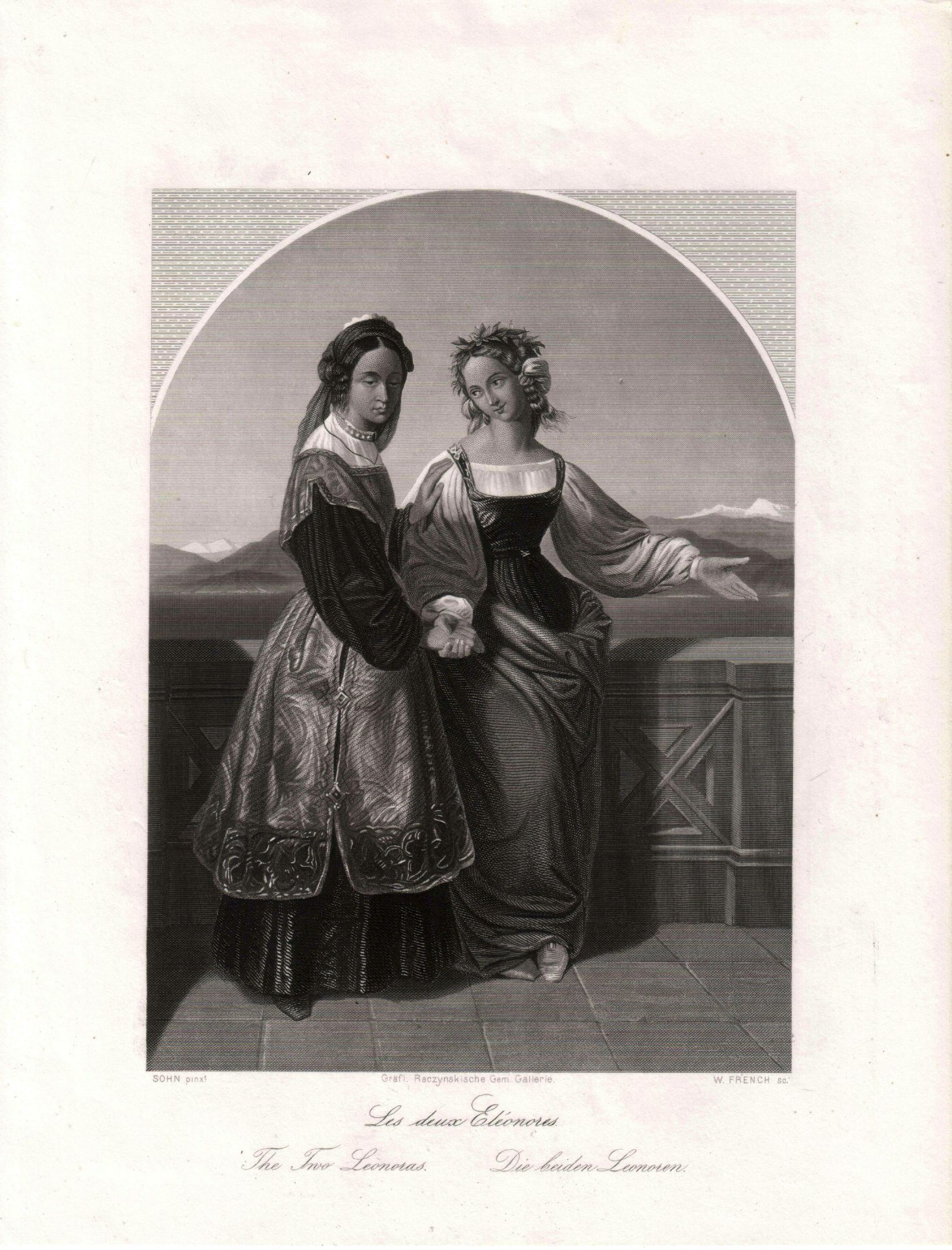 Stahlstich von William French (1815-1898), bezeichnet: „Les deux Elionores“, „The Two Leonoras“ und „Die beiden Leonoren“, Raczynskische Gem. Galerie“ nach einem Gemälde von Carl Ferdinand Sohn (1805 – 1867), Zweitfassung von 1836 (u.a. ohne Bäume im Hintergrund), Blatt: 26 x 20 cm, Ansicht: 18,3 x 13,5 cm,