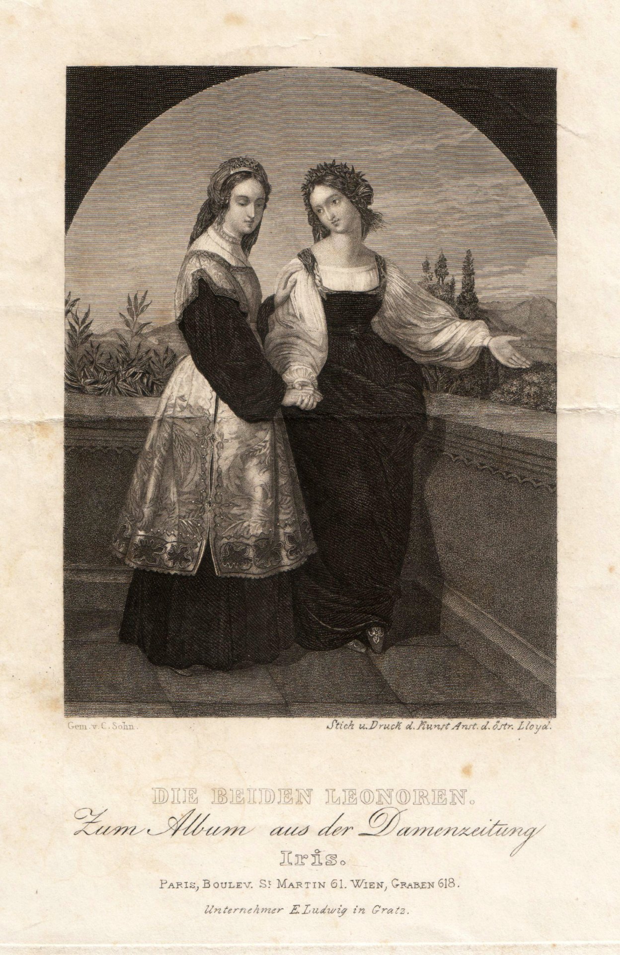 Stahlstich und Druck der Kunst Anstalt des östr. Lloyd, nach dem Gemälde von Carl Ferdinand Sohn (1805 – 1867), Erstfassung von 1834 (u.a. Bäume im Hintergrund!); bezeichnet „Die beiden Leonoren“, zum Album aus der Damenzeitung Iris, Paris, Boulev. St. Martin 61; Wien, Graben 618, Unternehmer E. Ludwig in Gratz. Blatt: 29 x 19,7 cm; Abbildung: 11,7 x 9 cm.
