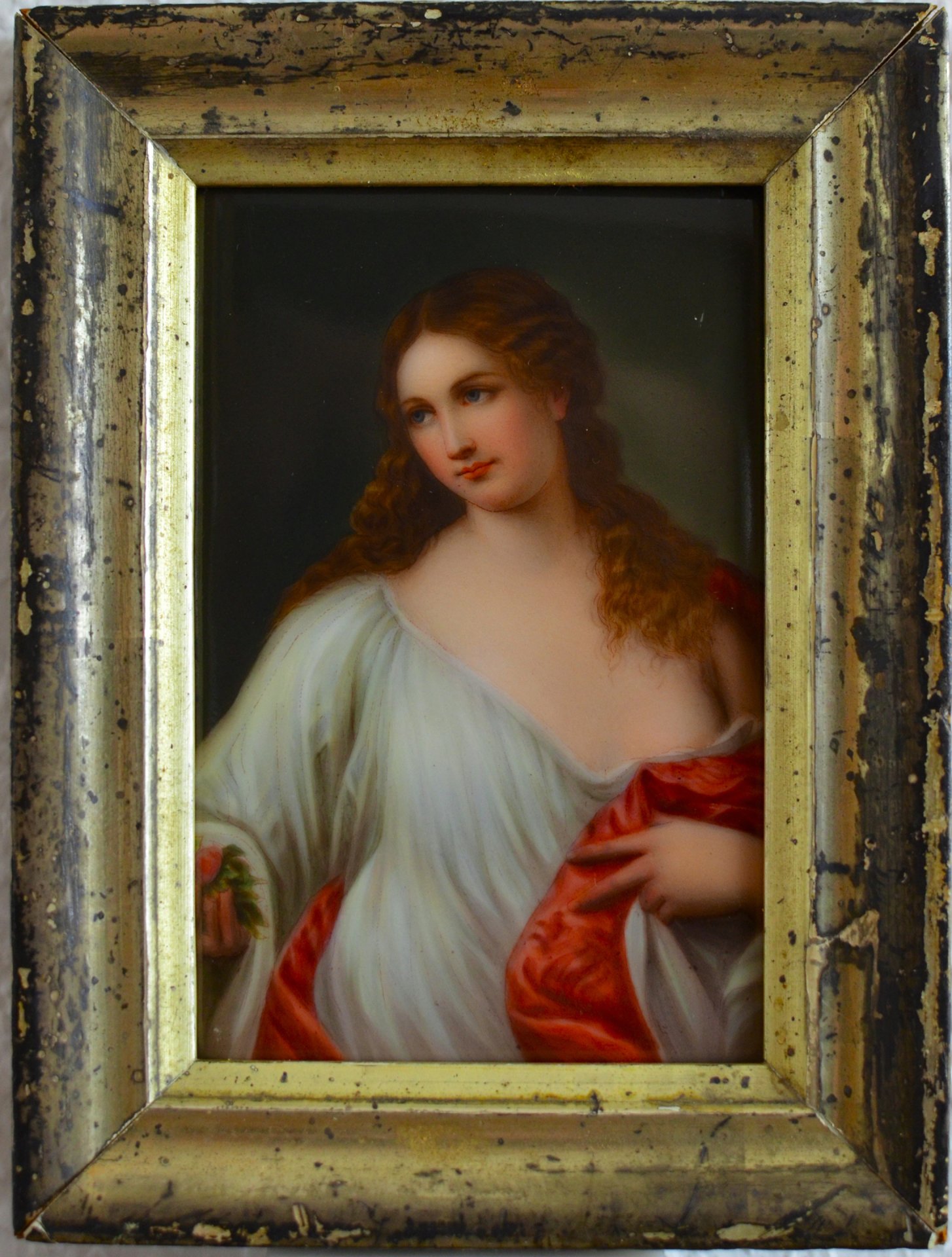 Auf der Porzellanplatte mit Muffelfarben die erotische Darstellung einer jungen Frau mit aufgelösten Haaren und das Unterkleid festhaltend, um den Busen zu verdecken. Vorlage ist das Gemälde von Tizian „Flora“ um 1515. In Originalrahmen, Berliner Leiste Waschgold; Pendant zu D1757. Rahmen: 17 x 13 cm, Platte: 13 x 8,8 cm