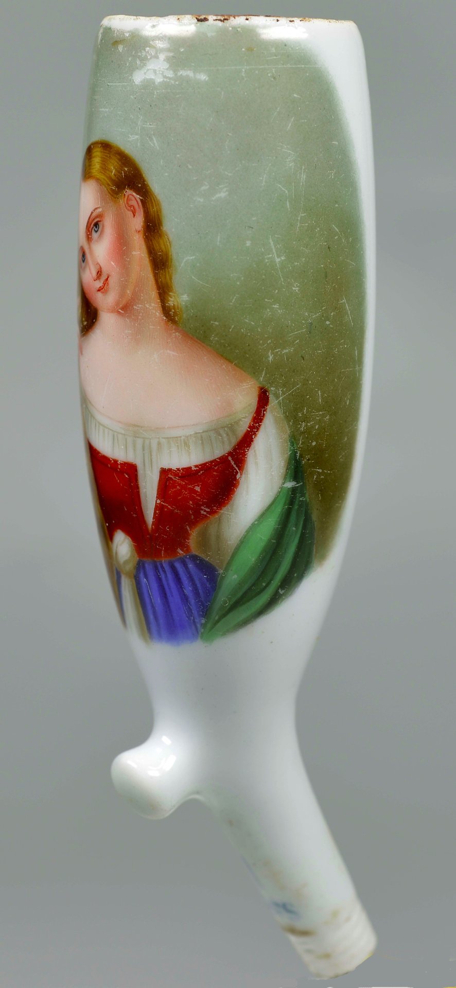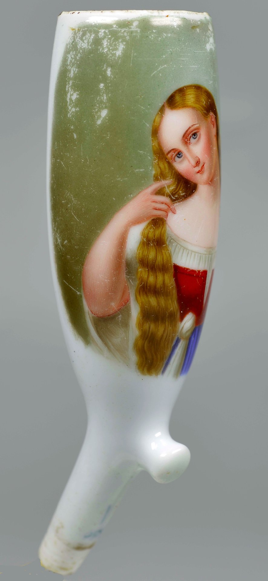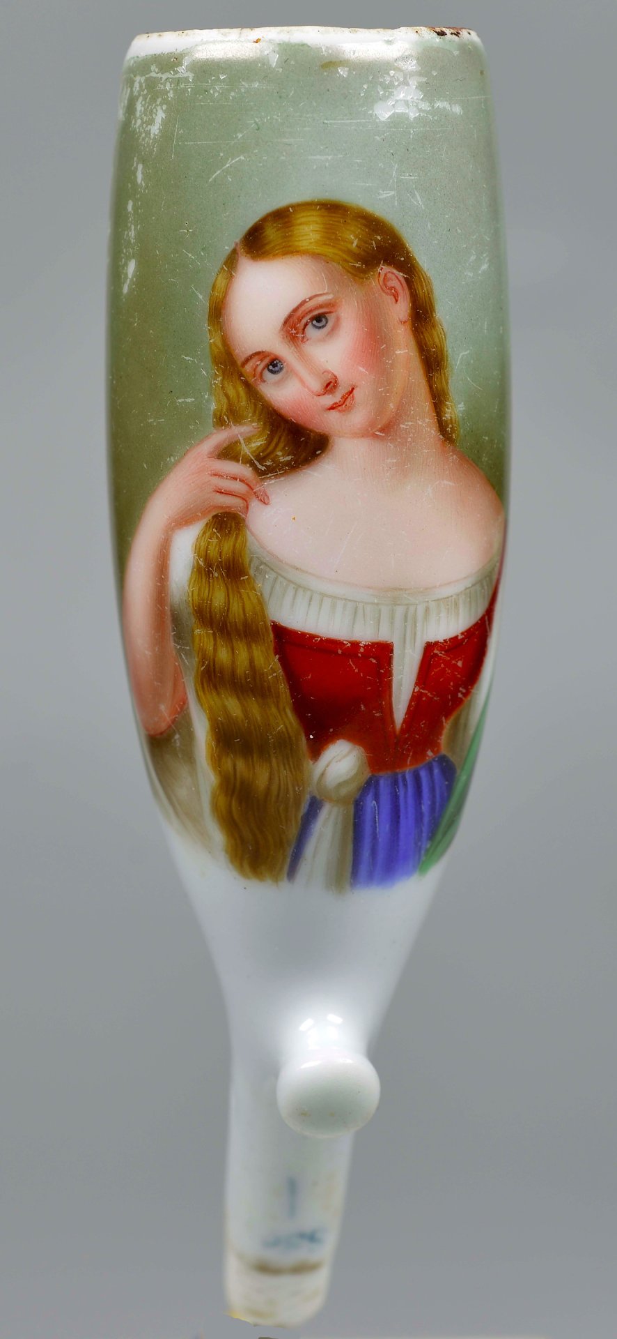 Pfeifenstummel aus Porzellan, Berliner Form; auf der Wandung ½ den gesamten Korpus umspannendes Bildfeld, mit bunten Muffelfarben die Wiedergabe des Gemäldes „Junge Frau bei der Toilette“ von Tiziano Vecellio, gen. Tizian (um 1477-1576)), Louvre, Paris. Am Stiel Blaumarke PFS unter Strich, einseitiger blauer Querstrich am Stielende; H.: 12,5cm (a=125; b=98; c=37,2 mm)