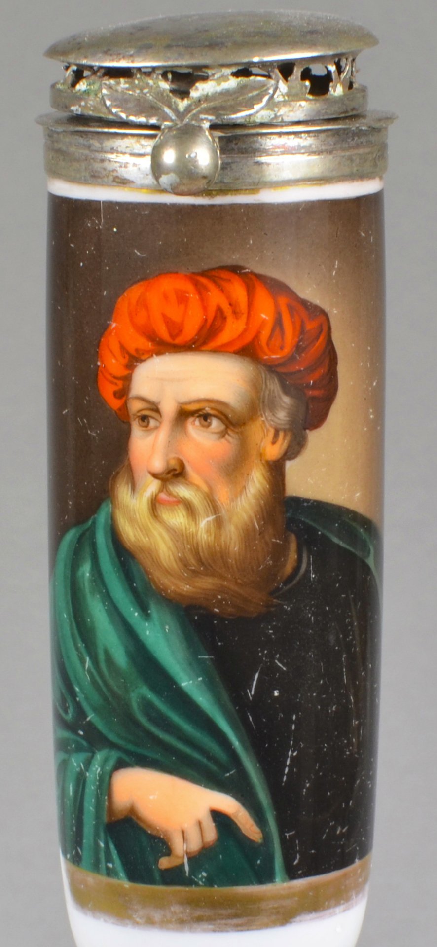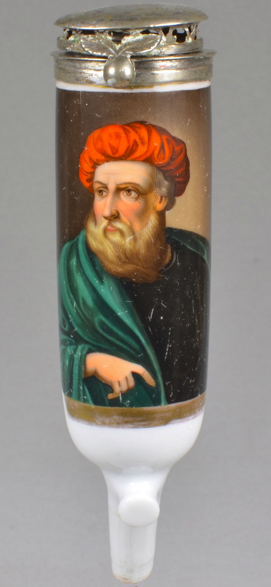 Pfeifenstummel  aus Porzellan, zylindrischer Korpus; auf der Wandung ¾ den Korpus umspannendes, golden gerahmtes Bildfeld; in bunten Muffelfarben Darstellung des Selbstportraits von Tizian (1477 oder um 1488 – 1576). H.: 13,3cm (a=12,5; b=9,9; c=3,2 cm) Montierung: Silber