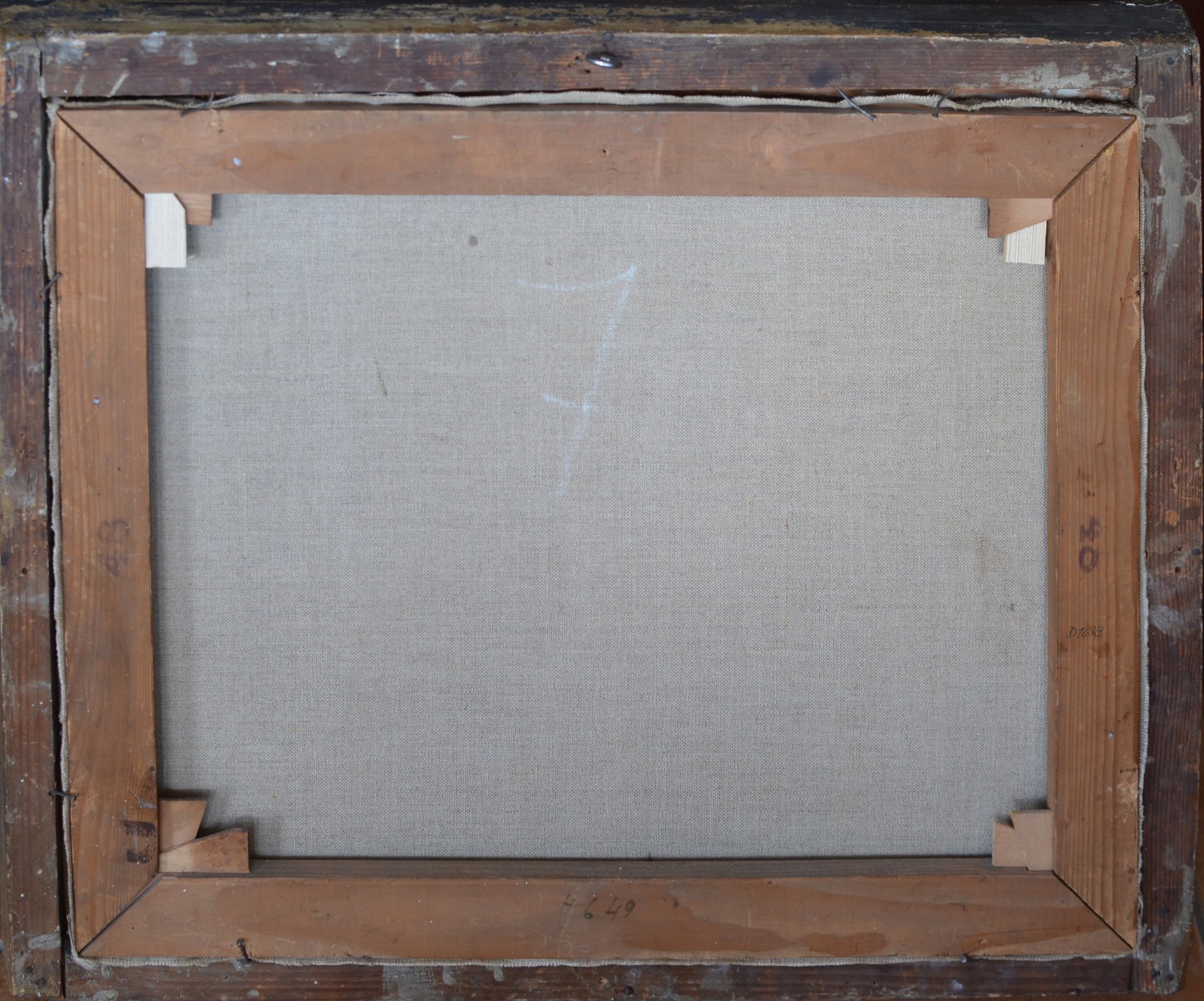 Das Gemälde, Militaria, ist die bisher älteste bekannte Darstellung in Öl um 1825, das einen französischen verwundeten Grenadier auf dem Schlachtfeld von Waterloo darstellt, der sich anschickt, einen unten liegenden toten Soldaten zu begraben. Das Bild ist doubliert wohl auf einem ehemaligen Barockbild, es wurde aufwändig restauriert; ist sehr dunkel; der Rahmen ist Original: 58 x 70,5 cm; das Gemälde: 48 x 59 cm.