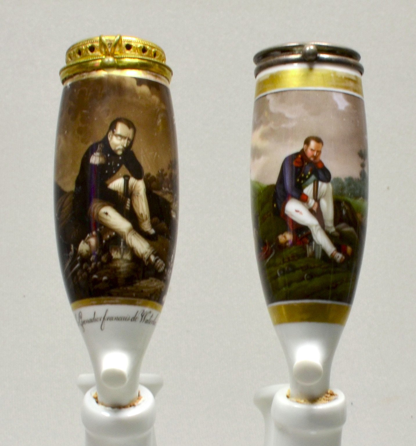 Pfeifenstummel aus Porzellan, Berliner Form, auf der Wandung ¾ den gesamten Korpus umspannendes, golden gerahmtes Bildfeld; in brauner Camaieu-Malerei die Darstellung eines Grenadiers der Armmee Napoleons, der verwundet auf dem Schlachtfeld sitzt, nach Vorlage von Horace Vernet (1789 – 1863), unterhalb des Bildfeldes in schwarzer Schreibschrift: „Le Grenadier francais de Waterloo“; Montierung Messing vergoldet, Deckel mit eingeprägter Göttin; H.: 12,6 cm (a=120; b=94; c=37 mm; Stielwinkel: 40 Grad).