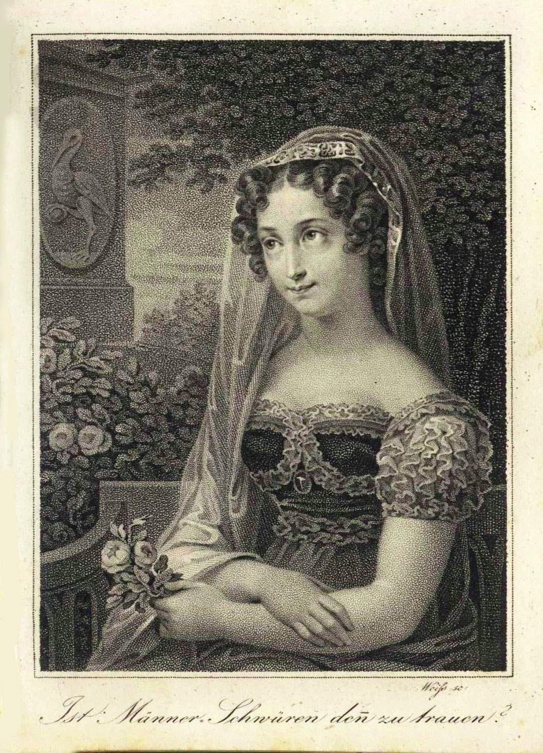 Punktierkupferstich von David Weiß (1775-1846), mit dem Portrait, bezeichnet: „Ist Männer-Schwüren denn zu trauen?“. Veröffentlicht im Taschenbuch „Vergissmeinnicht“ für 1826 von H. Clauren, bei Friedrich August Leo, Leipzig