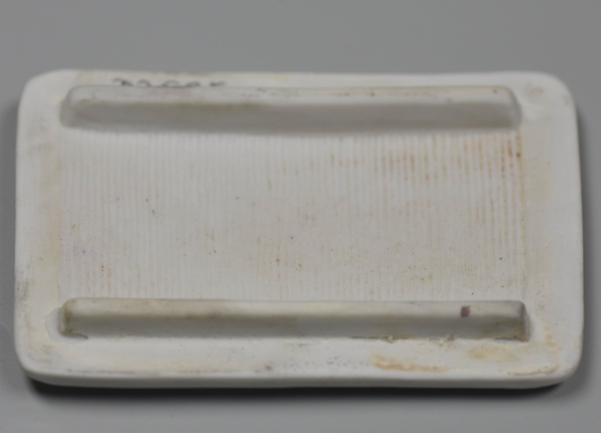 Das Unterteil ist ein rechteckiges Kästchen zur Aufnahme der Zündhölzer; ohne Dekor; im Boden Lithophanie „Die kleinen Fischer“; H x B x T = 19 x 46,1 x 34,7 mm; H.gesamt: 22,1 mm